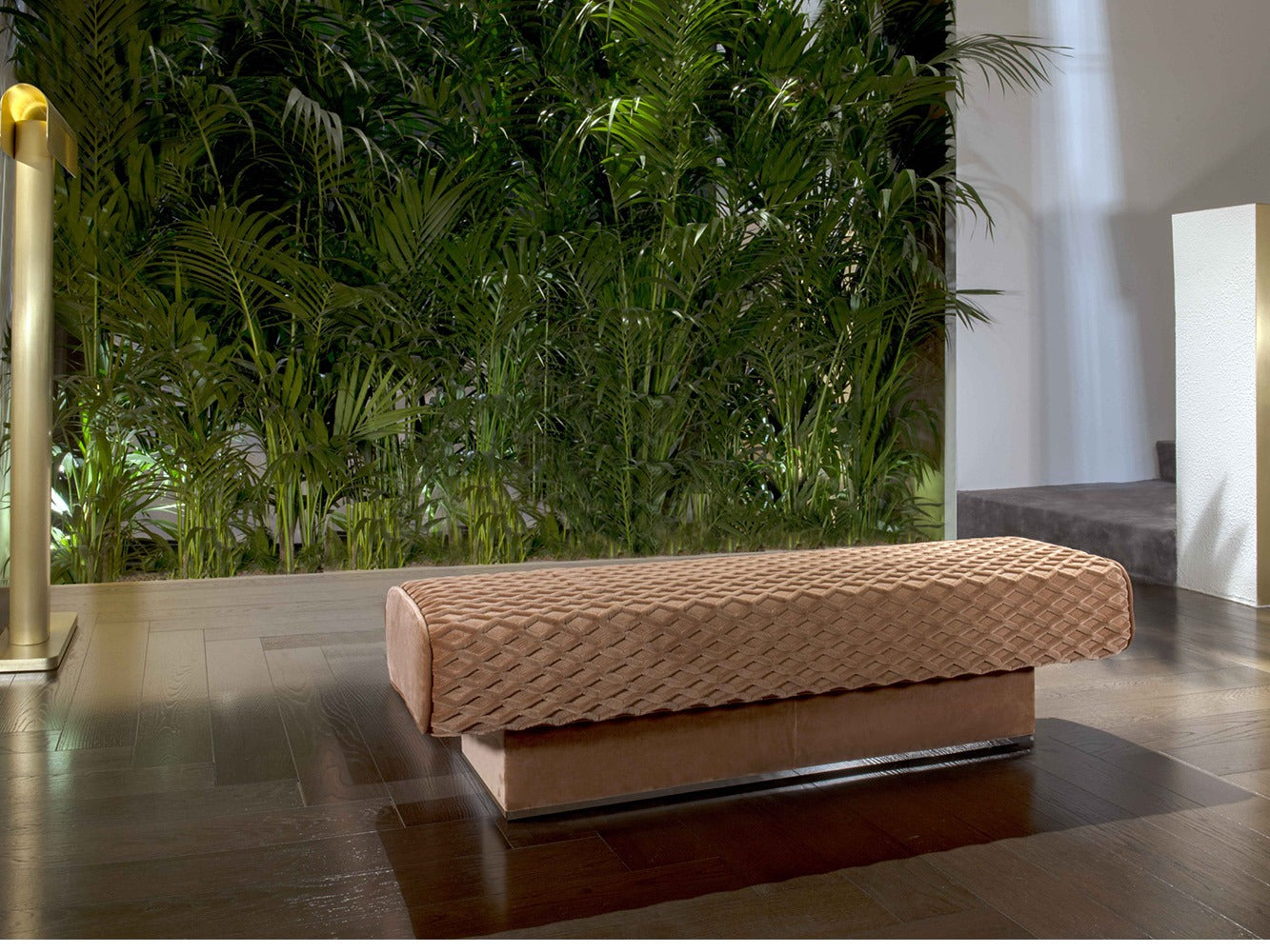 description | Pouf Hug is characterized by two seats separated by a Calacatta gold marble insert that can be used as a tray. A part of the seat is decorated with soft three-dimensional quiltings with rhomboid pattern that underline great sartorial skills. It can be used as an upholstered element in living rooms or walk-in-closet. The collection includes also armchairs, beds and sofas in different sizes, available both in leather and fabric upholstery. |