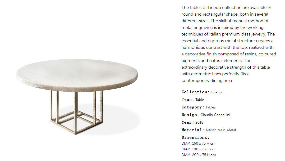 description | The tables of Lineup collection are available in round and rectangular shape, both in several different sizes. The skillful manual method of metal engraving is inspired by the working techniques of Italian premium class jewelry. The essential and rigorous metal structure creates a harmonious contrast with the top, realized with a decorative finish composed of resins, coloured pigments and natural elements. The extraordinary decorative strength of this table with geometric lines perfectly fits a contemporary dining area. |