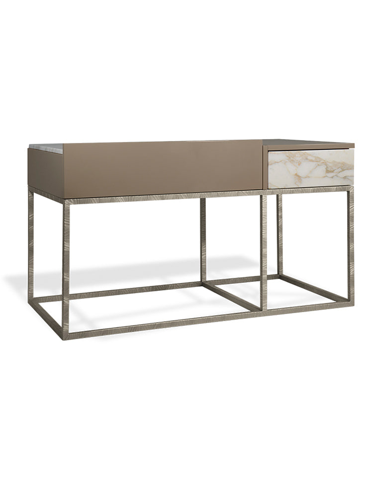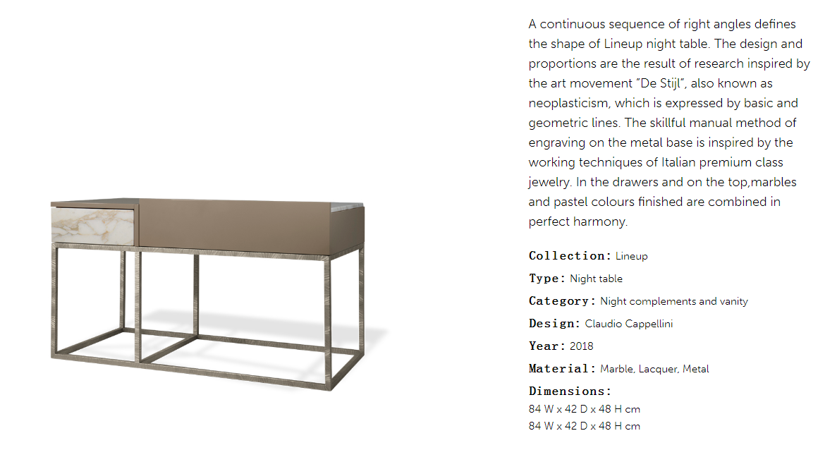 description | A continuous sequence of right angles defines the shape of Lineup night table. The design and proportions are the result of research inspired by the art movement ”De Stijl”, also known as neoplasticism, which is expressed by basic and geometric lines. The skillful manual method of engraving on the metal base is inspired by the working techniques of Italian premium class jewelry. In the drawers and on the top,marbles and pastel colours finished are combined in perfect harmony. |