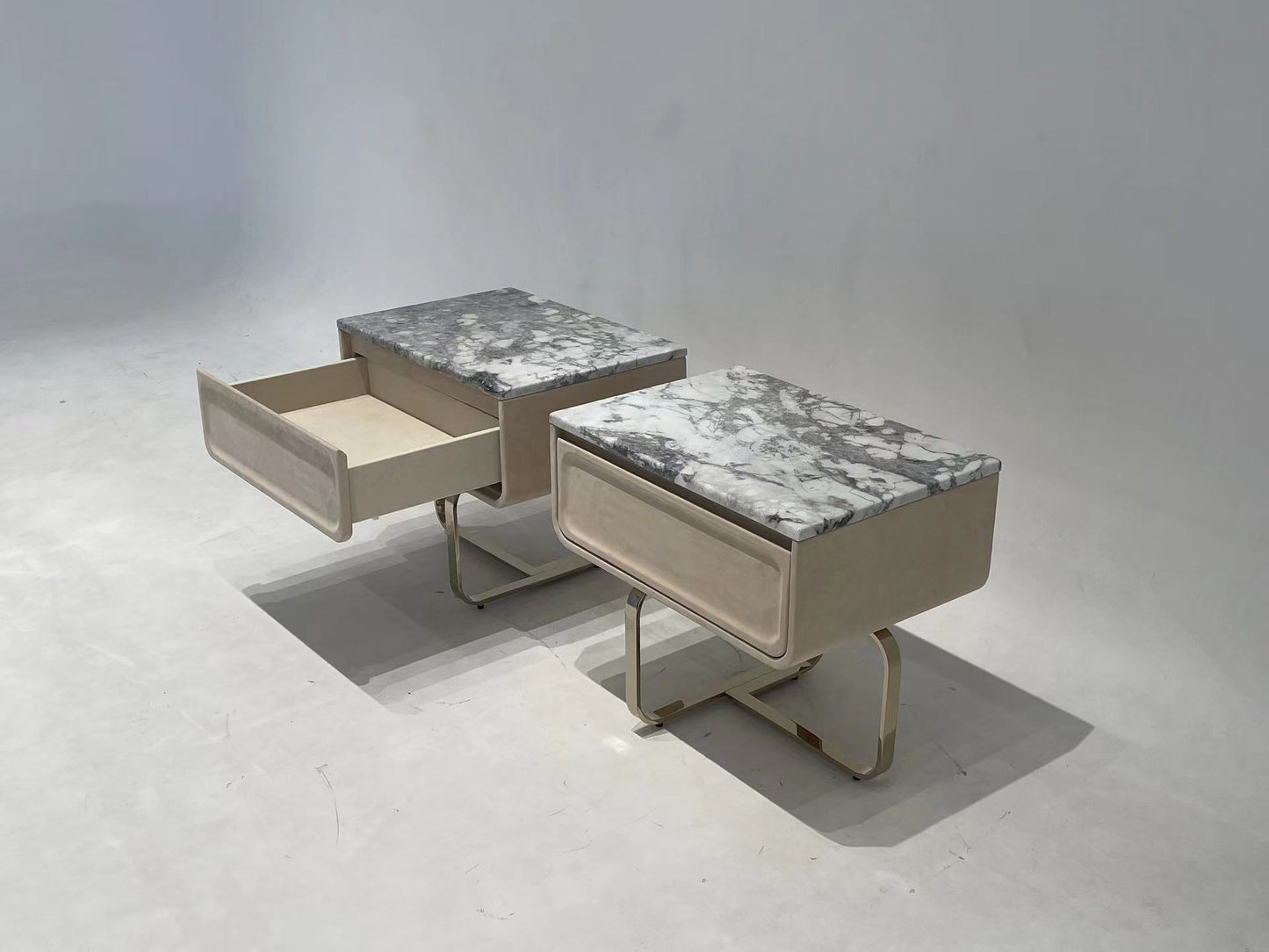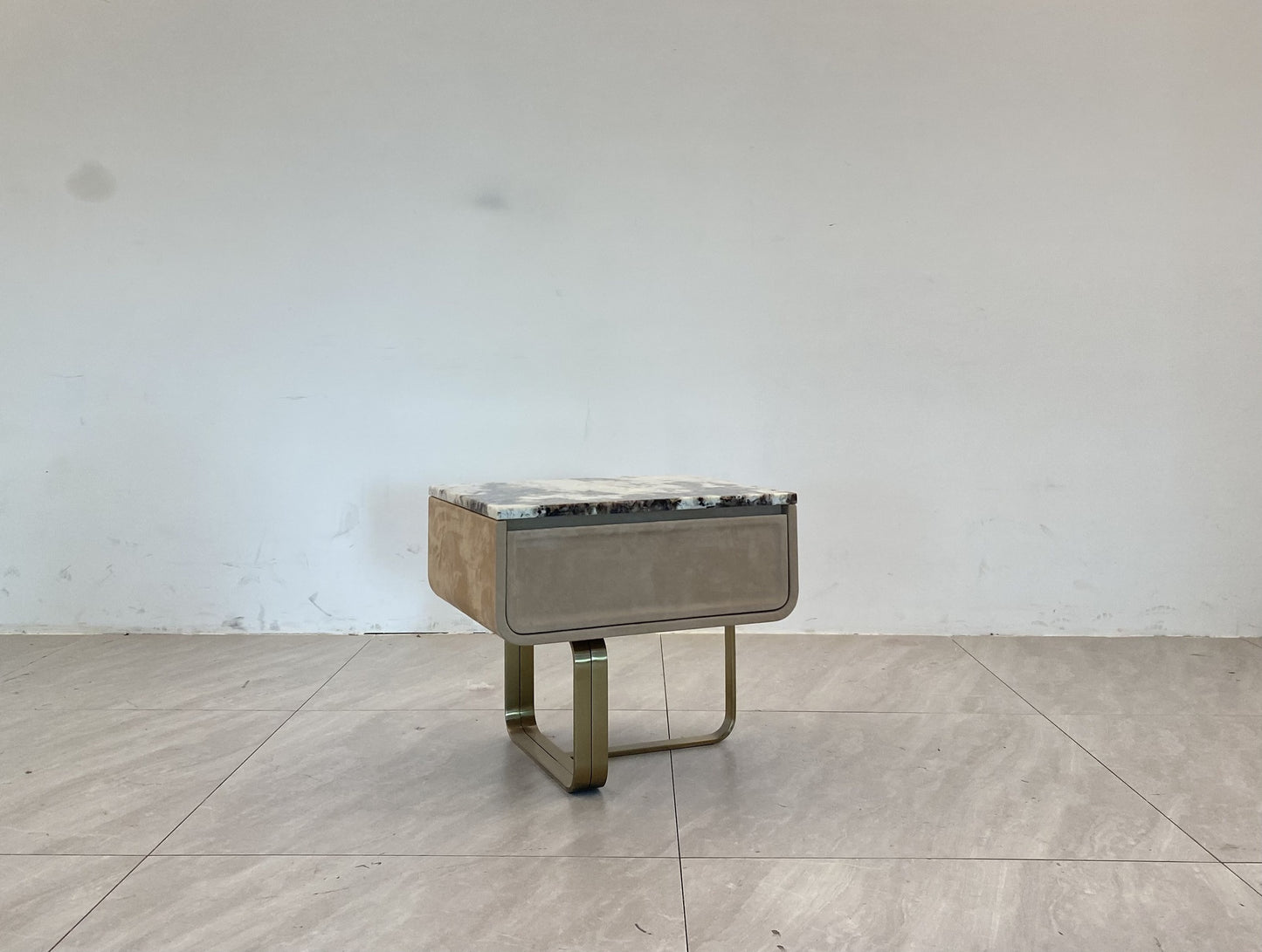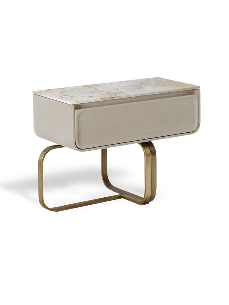 description | In night table Nova the care to details is visible on the drawer decorated with a three-dimensional frame upholstered with soft leather. An exclusive feature of this item is the right and left version where the metals are placed on the opposite side under the structure. The top is inmarble while the internal side of the drawer is made up of eucalyptus wood. |