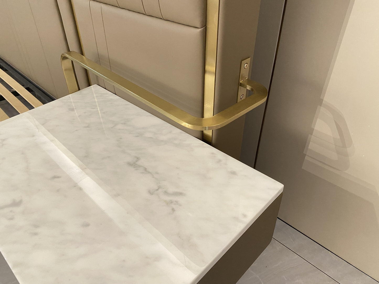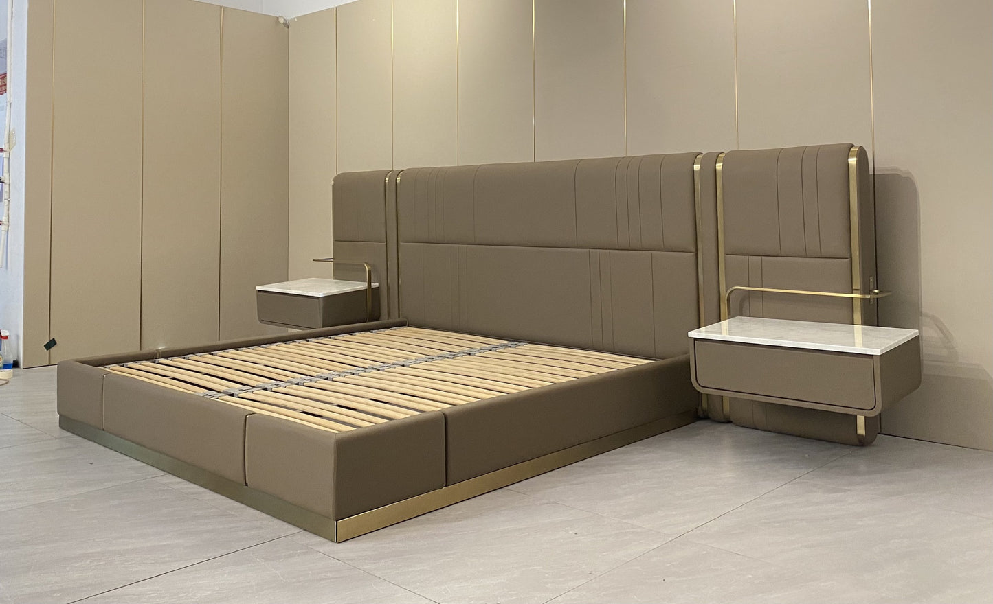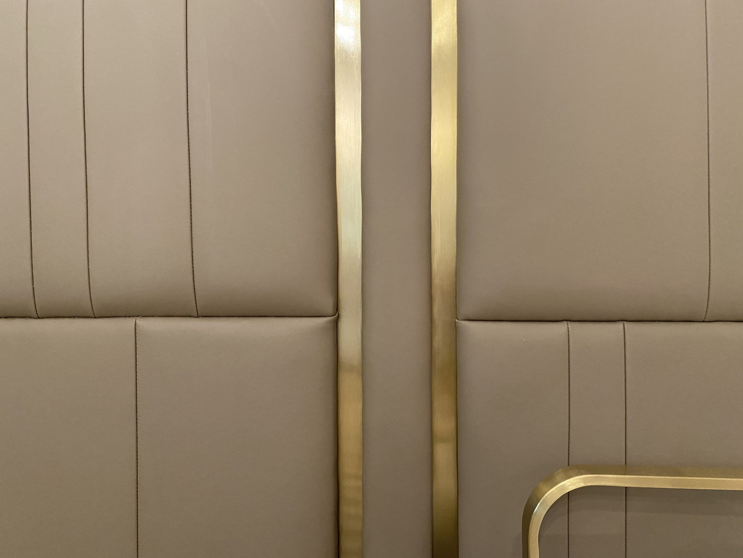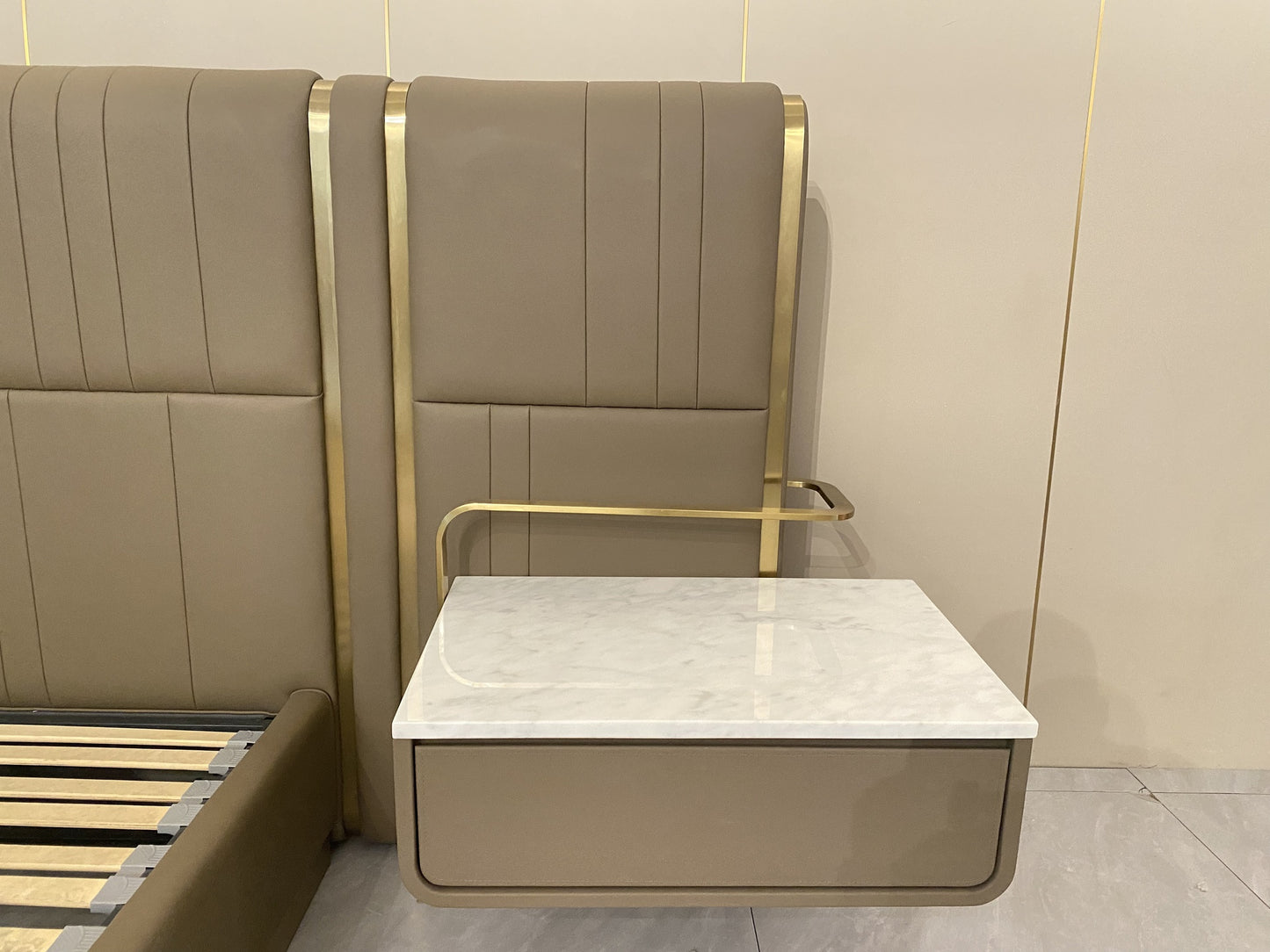 description | Novabed presents headboard and siderails upholstered in leather or fabric where vertical stitchings alternate with parallel seams while on lateral sides of the headboard metal details recall those that characterize the other items of this collection. This bed besides being available with standard headboard, it is available with a wider headboard that envelops the night table. |