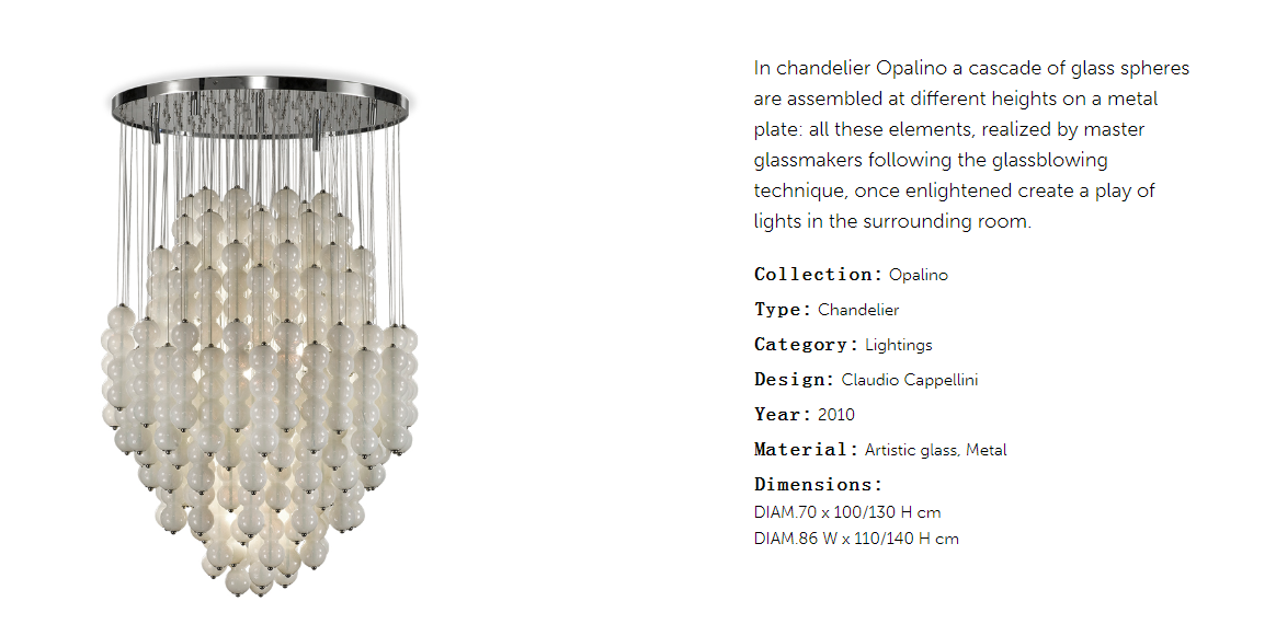 description | The table lamp Opalino is composed by blown glass elements as result of artistic skills of master glass makers. These spheres are connected one to the other and once enlightened, a play of lights is radiated in the room. |