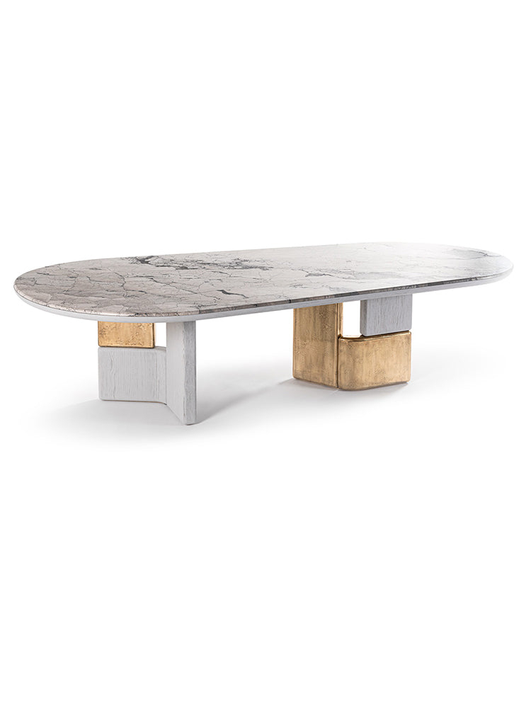 description | The Ovoo table tells stories of faraway lands, belonging to the shamanic cult typical of Mongolia. The inspiration of this collection is the concept of “ovoo”: the piles of stones used as reference points at the top of the mountains, were in fact the inspiration for the overlapping of lacquered or ash wooden components combined with other elements in patina brass casting. |