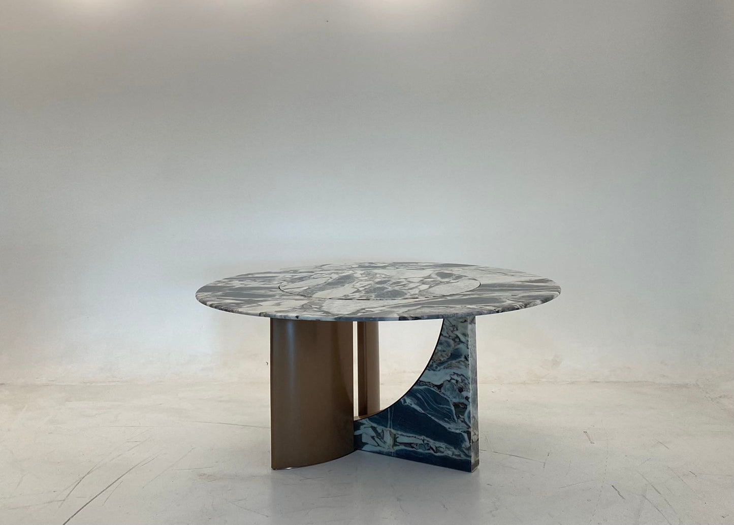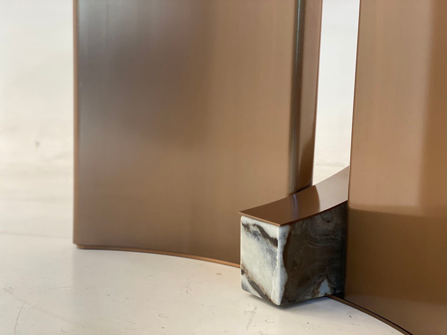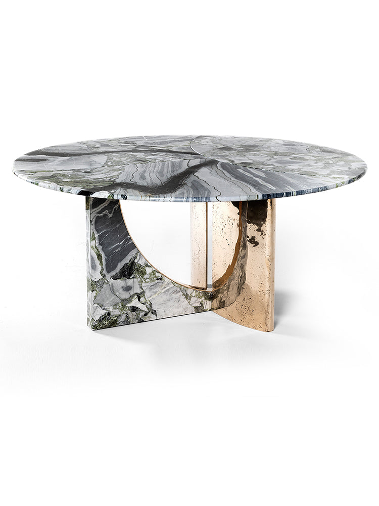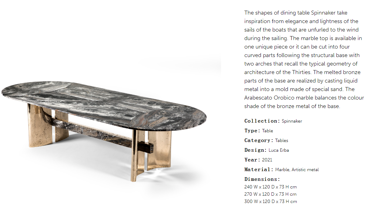 description | The shapes of dining table Spinnaker take inspiration from elegance and lightness of the sails of the boats that are unfurled to the wind during the sailing. The marble top is available in one unique piece or it can be cut into three curved parts following the structural base with two arches that recall the typical geometry of architecture of the Thirties. The melted bronze parts of the base are realized by casting liquid metal into a mold made of special sand. The White Beauty marble creates a very strong chromatic contrast with the bronze shades of the metal, enhancing the refinement of all the materials used for this table. |