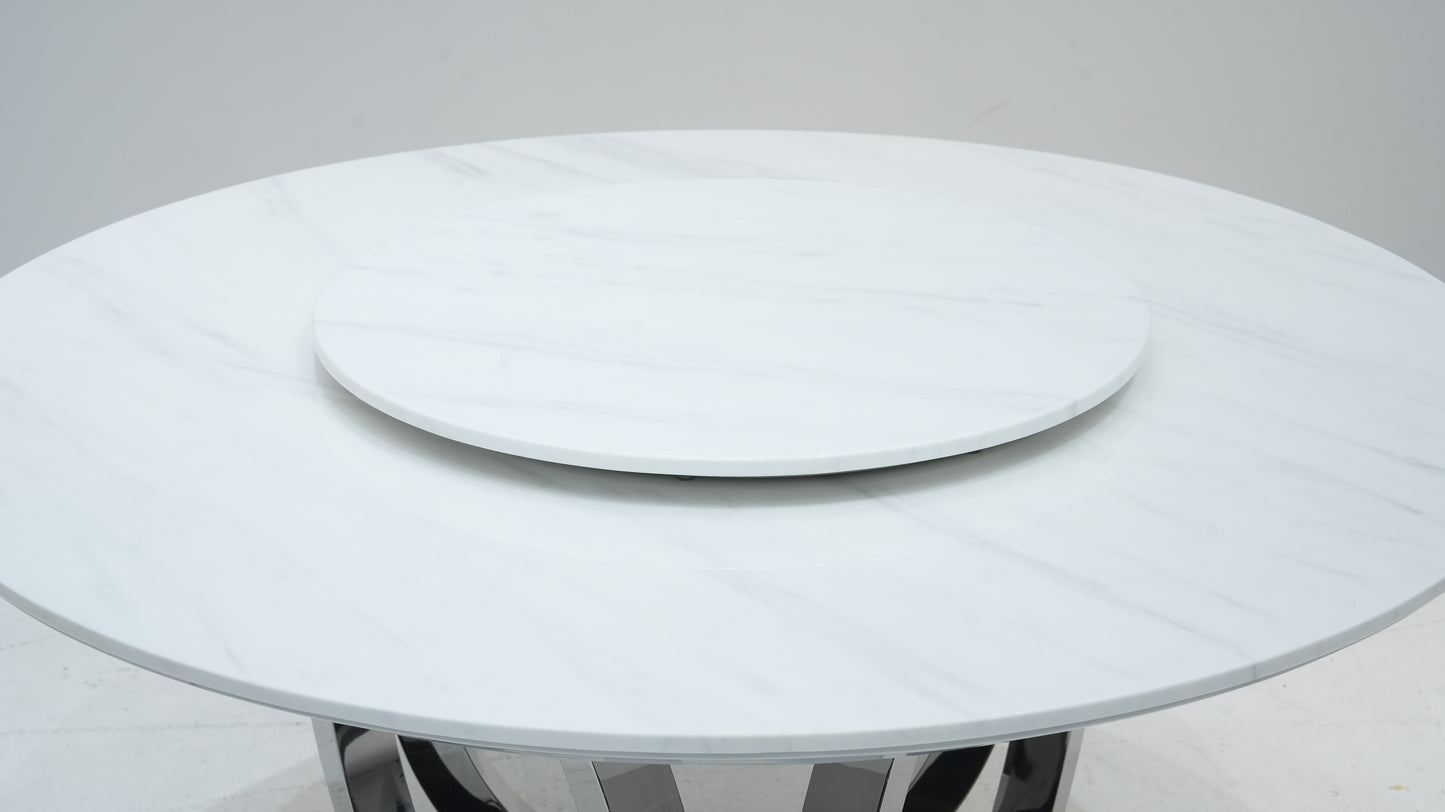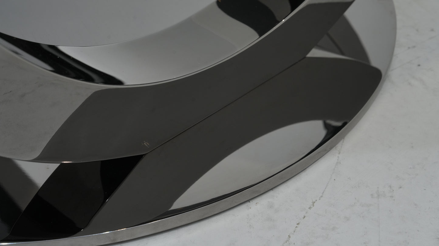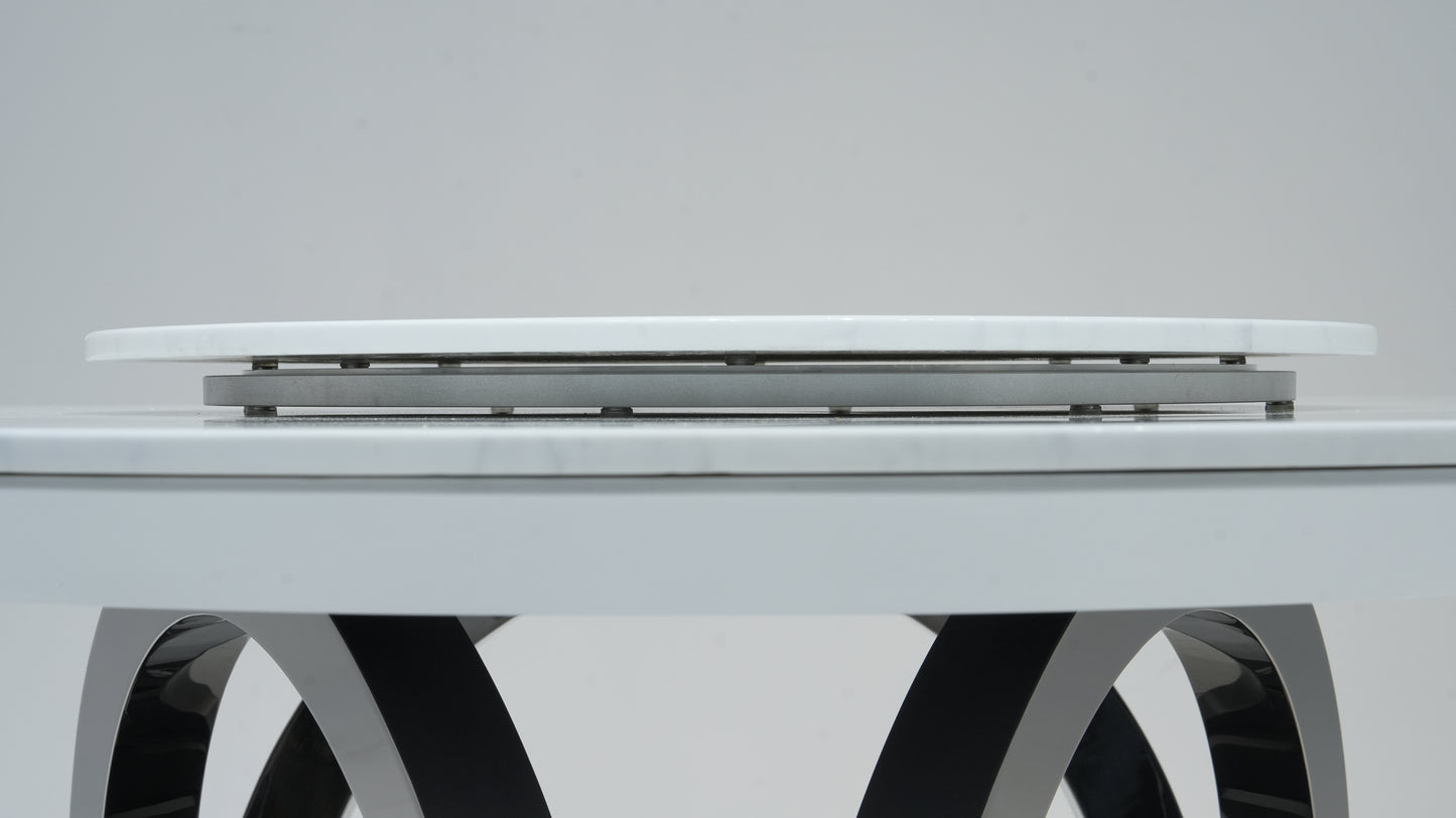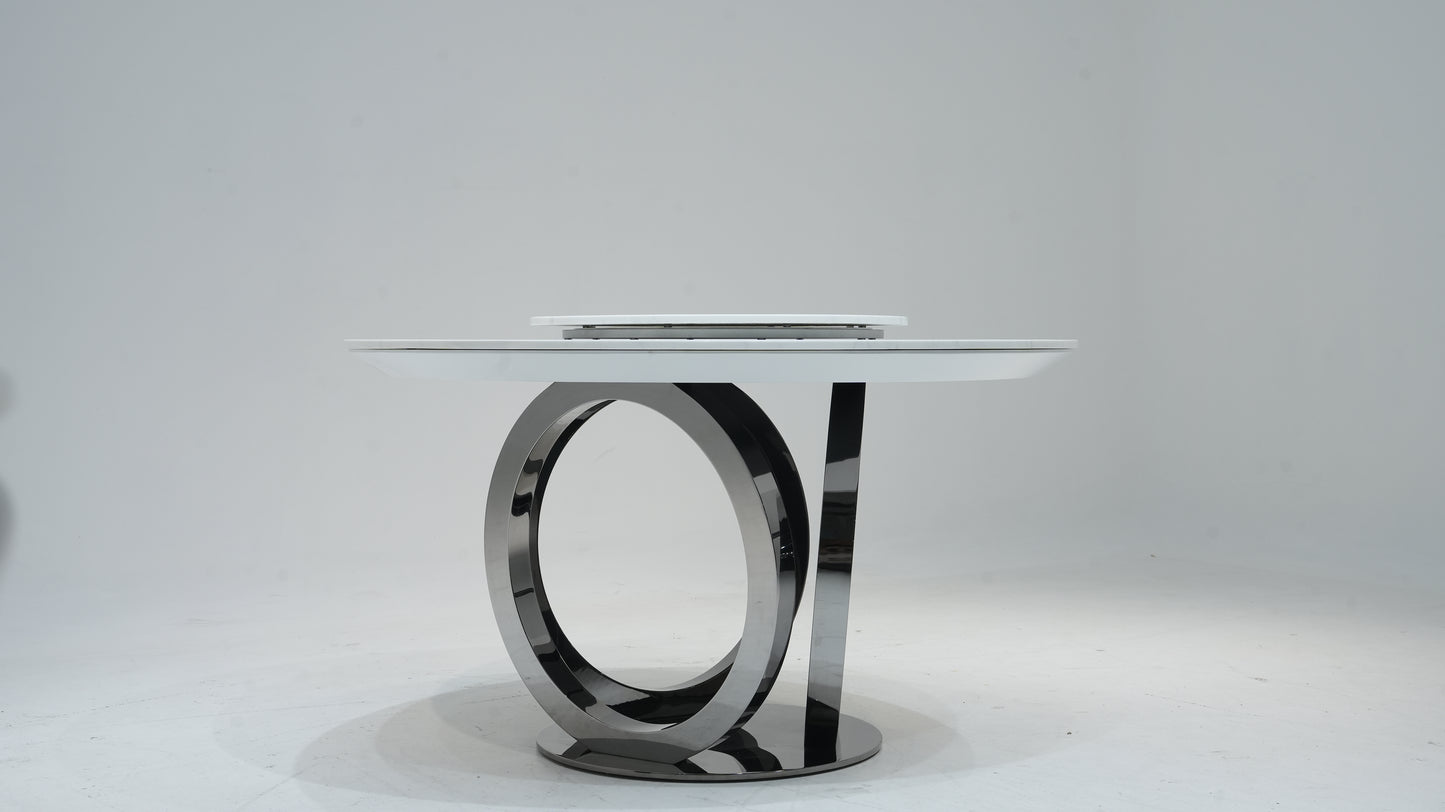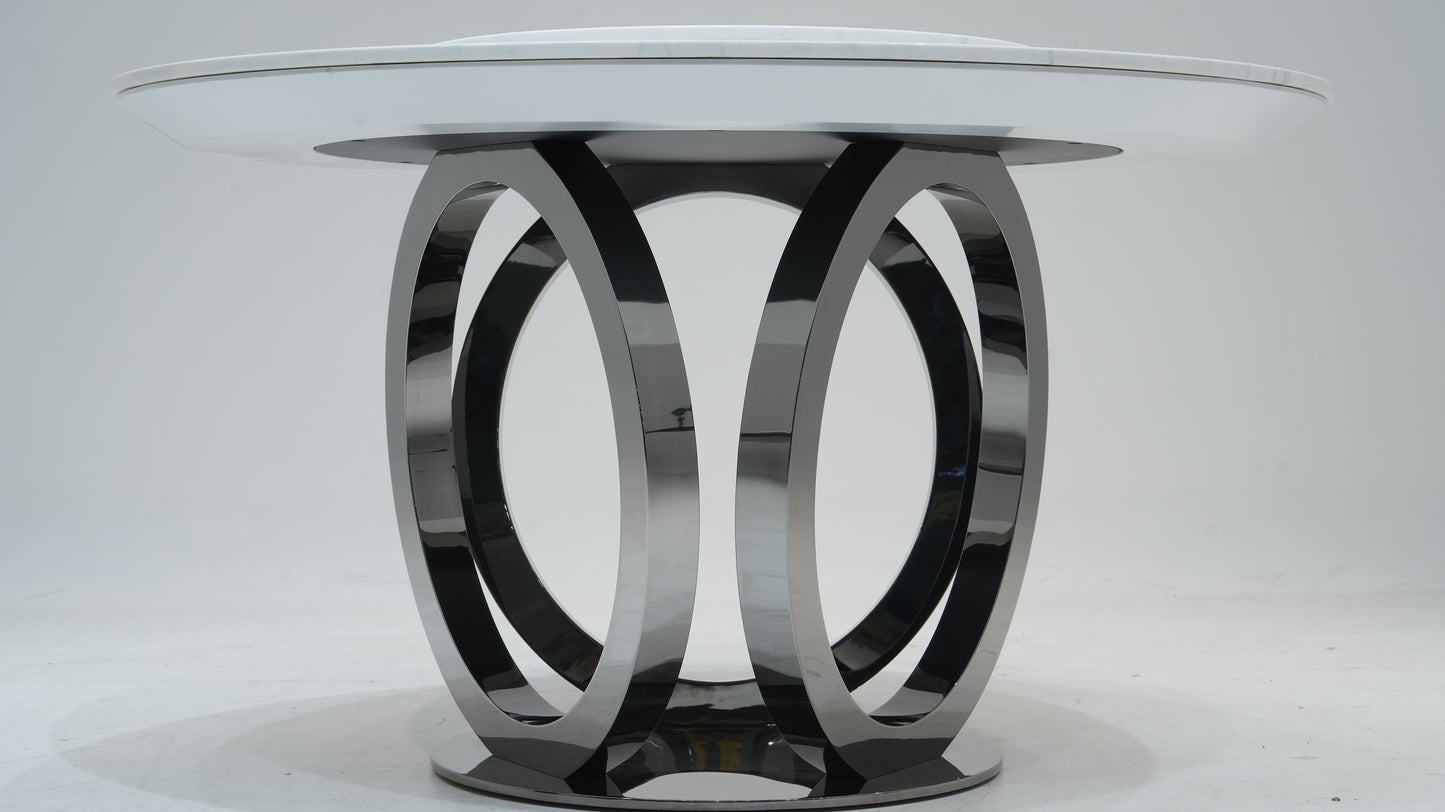 Multiform and with a contemporary mood, the Galileo table combines eclectic design with precious materials. A unique style emphasised by the original steel structure and rifle barrel finish, composed of circular elements with a strong scenic impact. It is shown with Rosewood top, a precious wood with an intense, variegated colour. |