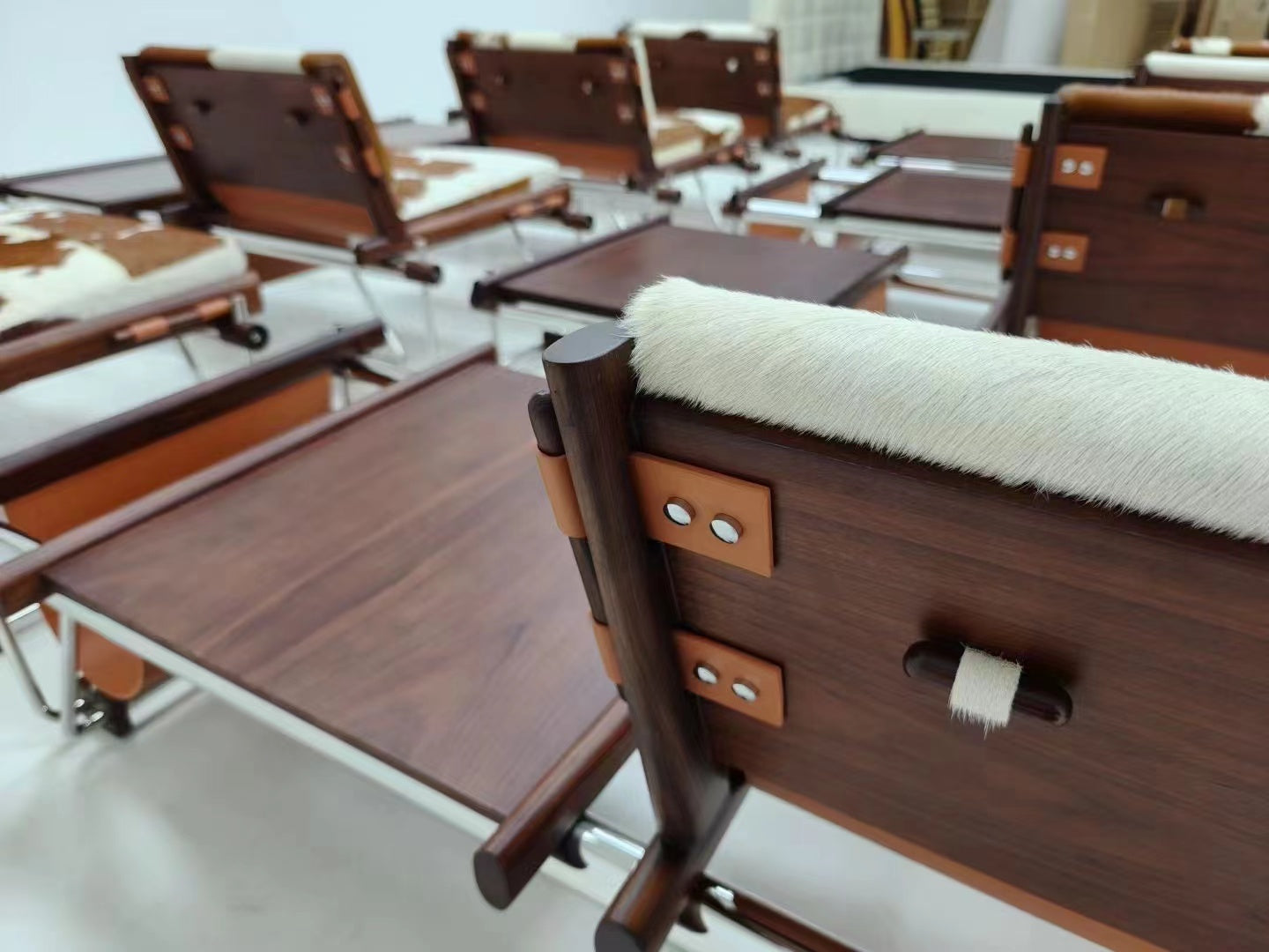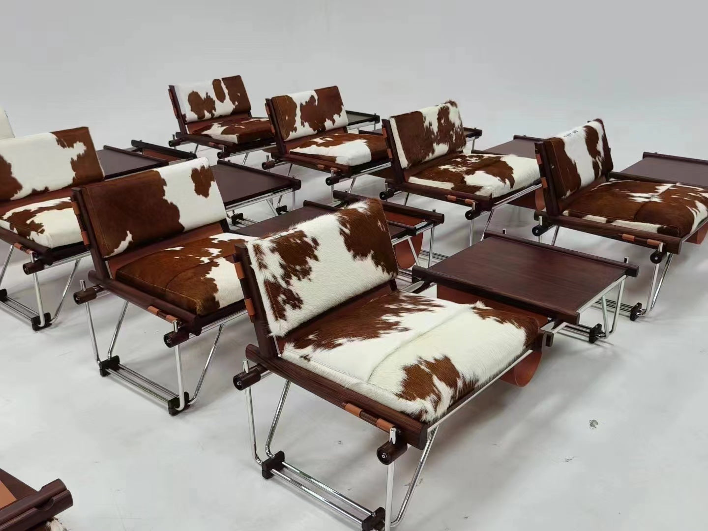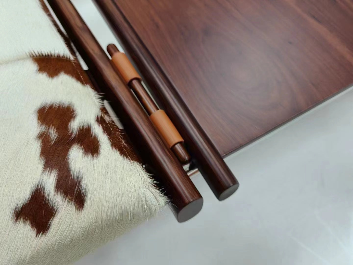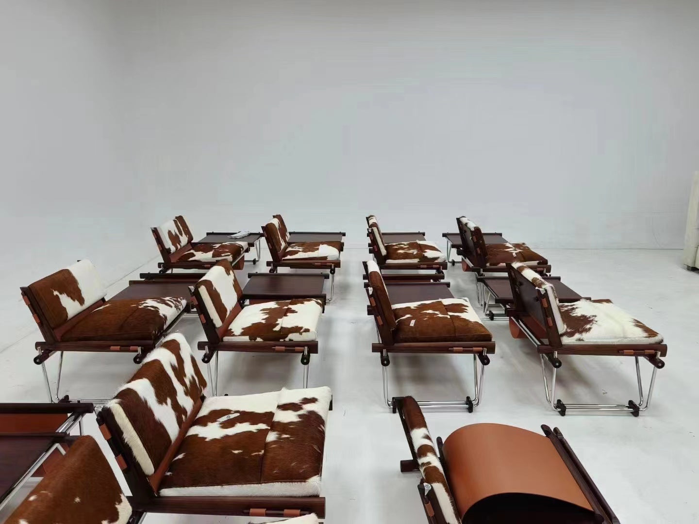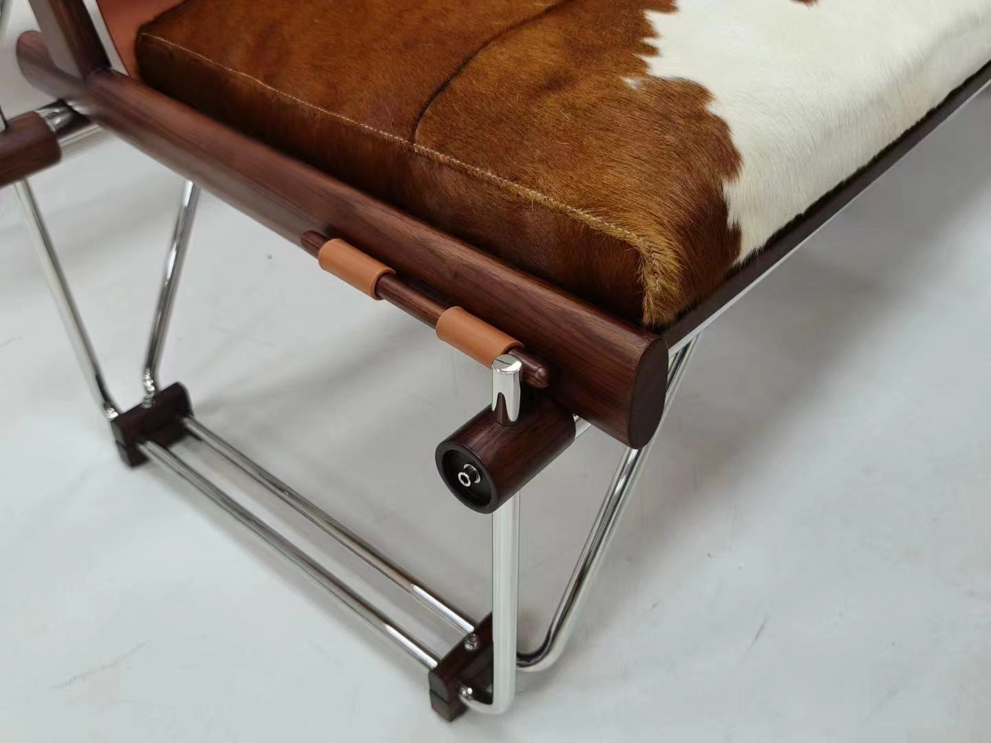 This very rare multifunctional bench was designed by Brazilian designer Percival Lafer and produced by Lafer MP in Brazil during the 1960s. It exemplifies Brazilian mid-century modernism through its innovative fusion of seating, table, and magazine storage, unified in a sculptural and functional form. The piece highlights the inventive use of materials and structure that characterize Lafer’s design language. The bench features a tubular chrome-plated steel frame that creates a geometric and structurally expressive base. The frame includes angular supports and cross-stretchers that provide stability and a visually light construction. The seating and table surfaces are framed in solid rosewood, exhibiting rich tonal depth with dark brown and reddish hues, along with the linear grain typical of Brazilian hardwoods. The seat and backrest incorporate brown suede leather slings, which are complemented by removable cowhide cushions displaying natural irregular patterns in tan, brown, and white. This combination introduces a distinctive organic texture and warmth to the piece. Suspended suede magazine holders are integrated on either side of the bench, stitched and supported by dowelled wooden rods, further enhancing the multifunctionality. |