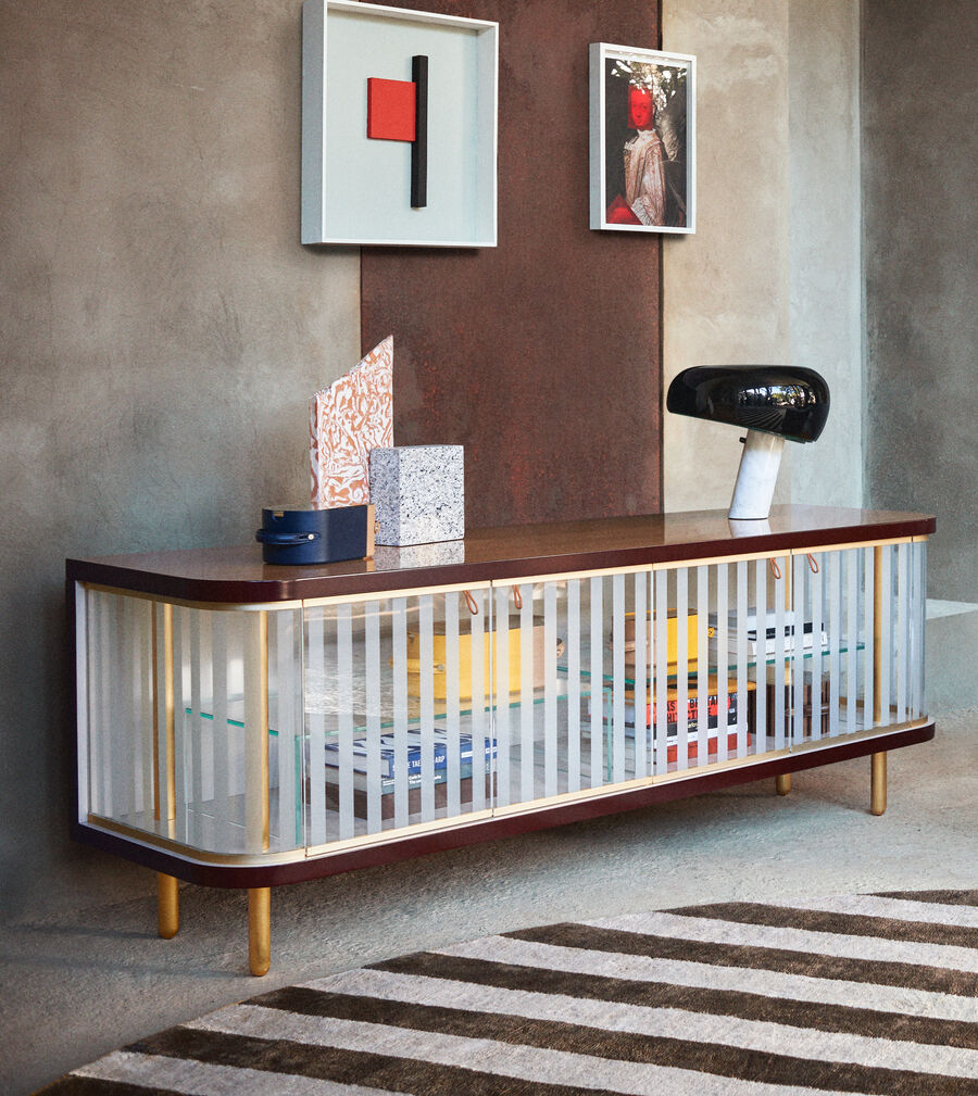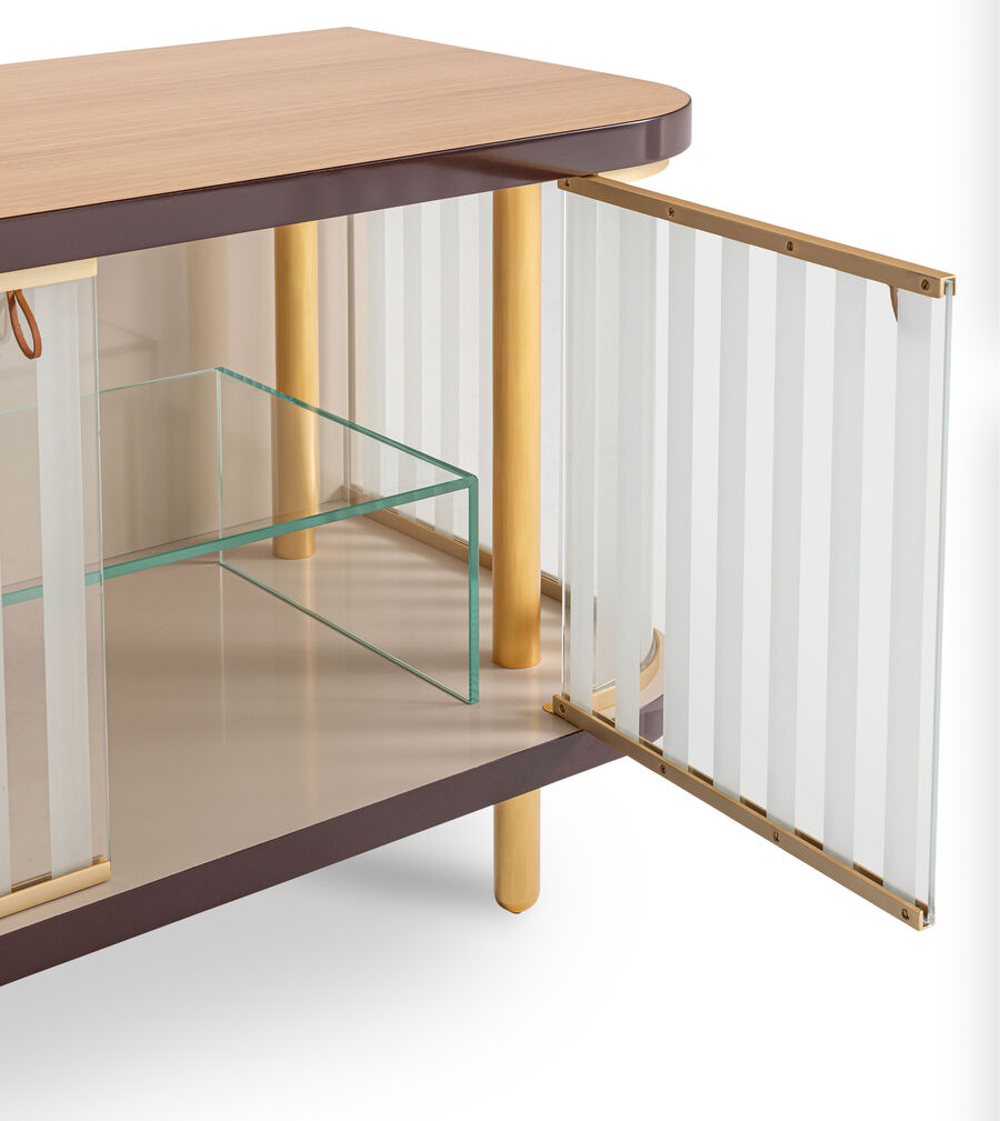 description | With its distinctive fluted panels in Pequin-effect sandblasted glass and lacquered wood details, the Vittoria sideboard is an original take on retro style. The top is available in a choice of natural oak, American walnut and sycamore frisé. The matt-finished metal elements and base combine with the internal wooden frame, transparent glass shelves and leather handles in a harmonious tactile contrast. |