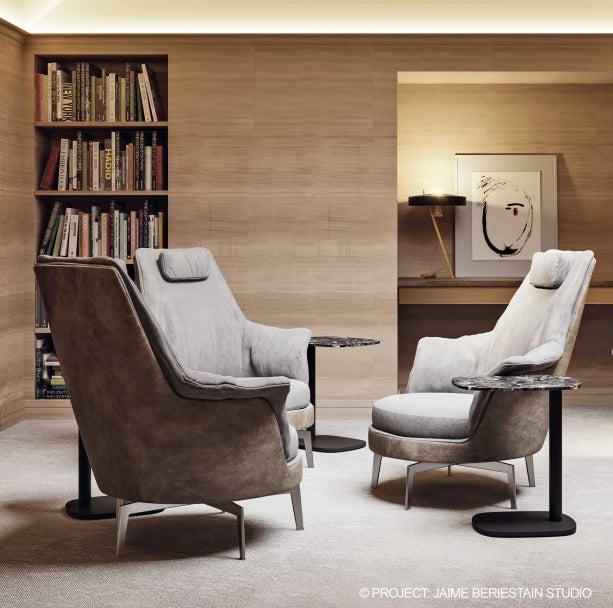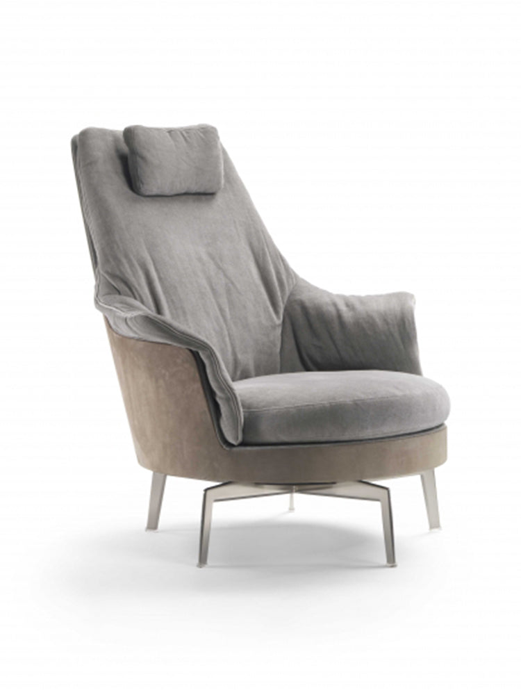 description | Guscioalto is an especially comfortable, high-backed wing chair (bergère) known for its couture tailoring. The structure is an enveloping shell made of structural polyurethane foam, while the seat cushion is in goose down with a core insert in crushproof material. To ensure the utmost in comfort, the Guscioalto Soft version comes with additional padding in the seat back and an extra layer of Dacron and memory foam. For an extraordinarily comfortable seating experience, Guscioalto Light features a unique contoured upholstered element that attaches to the seatback with velcro. The Guscioalto armchairs come with a lightweight, uncluttered – swivel or non-swivel – base with metal legs, based on an exclusive Flexform design, and available in satin, chrome, burnished, black chrome or champagne or finish. They also come in a version with wood base and legs in solid Canaletto walnut or ash, available in a number of shades. |