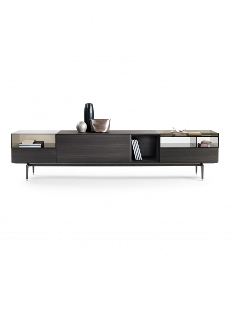 description | To reveal or conceal is the question that inspired the aesthetic of the Jeremy family of cabinets. Distinguished by pure lines and sleek proportions that build upon a rhythmic alternation of negative and positive spaces, it offers a series of revealing open compartments to display treasured objects, and concealing closed compartments with drop-front doors. Especially fascinating is the contrast between the lightness of the smoked glass compartments and the textured surface of the cooked oak. The Jeremy cabinets are also available in glossy lacquer finish in three colors: white, dove grey or black; and rest on elegant cast aluminum feet with burnished or satin finish. The Jeremy family includes compositions with drawers and drop-front doors, with various fittings, each of which is designed to be placed in different parts of the home, from the entry to the living room. All of the elements are finished on the back, making them suitable as room dividers. |