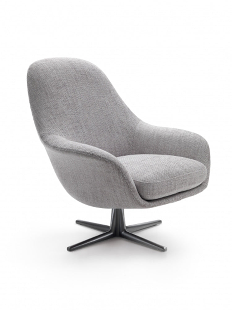 description | The sinuous, enveloping lines of the Sveva armchair with cowhide shell can also be found in the fully-upholstered Sveva Soft version. The soft upholstered shell is made of a special polymer that offers considerable structural support and, along with the goose-down-filled seat cushion, ensures outstanding softness and comfort. The cast aluminum swivel base comes in versions with four or five spokes, with satin, chrome, burnished, black chrome or champagne finish. The Sveva Soft armchair upholstery is completely removable; the chair also comes in a wing back/bergère version. |