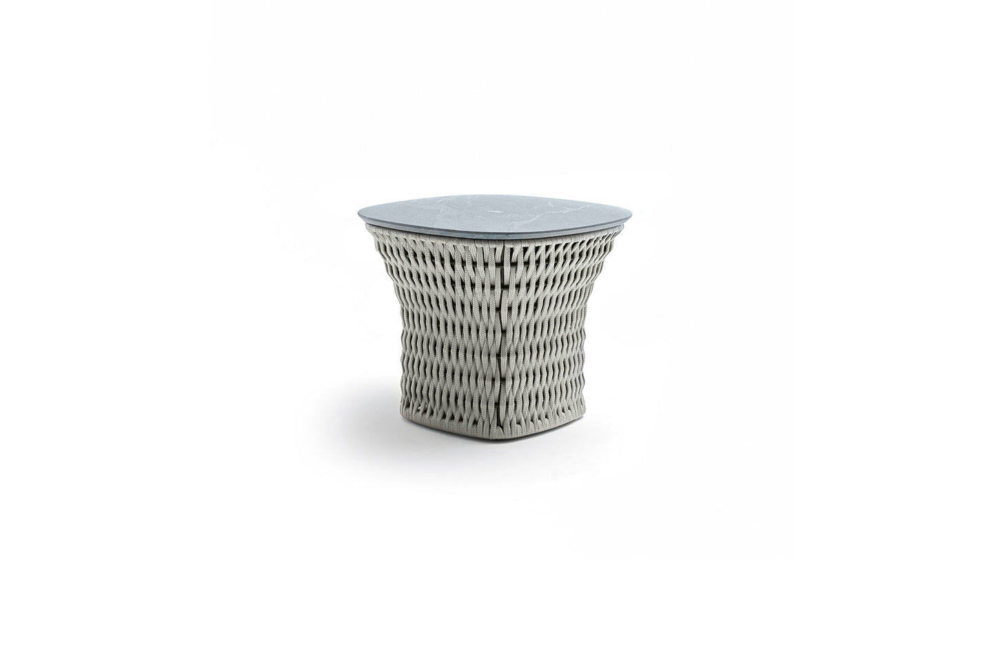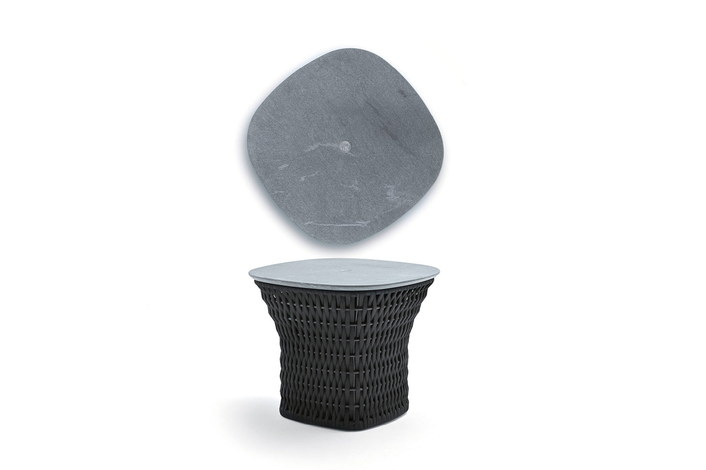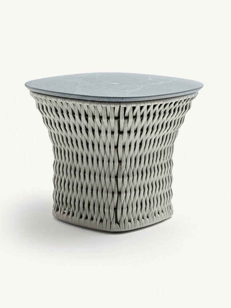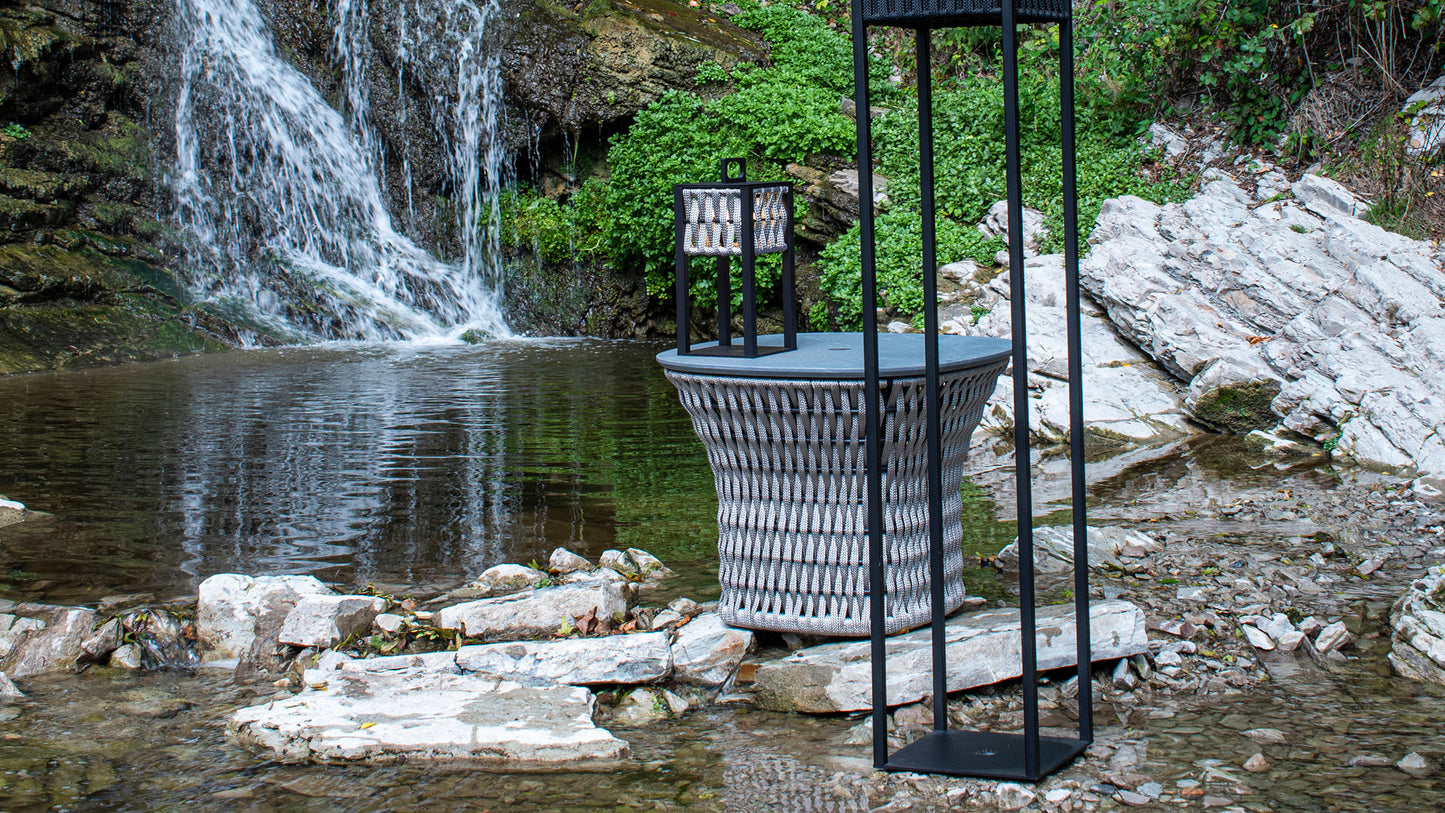 description | Outdoor side table in combination of satined black metal and black or light grey woven cordage. Top in treated "CARDOSO" natural stone with inserted Giorgio Collection logo. |