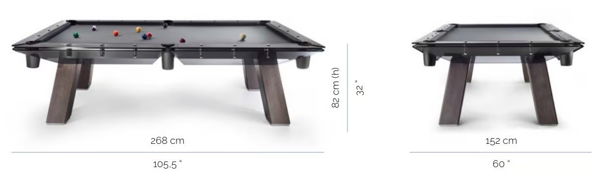 Material | Frame and low-iron glass+Legs in Oakwood+Metal components+Three-piece Italian slate base+Simonis wool cloth+Leather pockets |