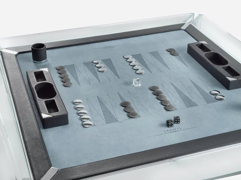 description | Tuttuno Backgammon is a versatile luxury game table with a transparent aesthetic, that is the result of design precision and materiality. This design piece features an elegant Alcantara® playing surface highlighted by the essential glass structure, which, with a simple gesture, can also be used as an elegant side table. This versatile luxury game table is available with different graphic printed tops catered to Mahjong, Backgammon or checkers. |