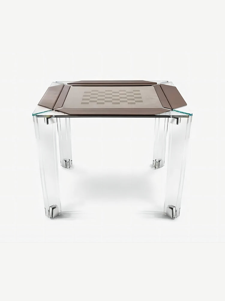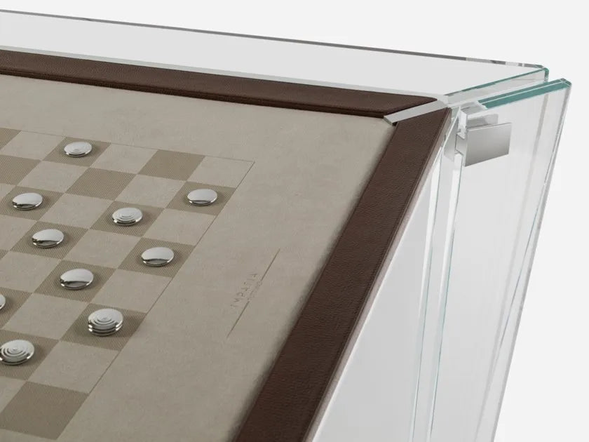 description | The Tuttuno Checkers game table is designed to accommodate two players for a game of checkers or chess. The minimalistic design gives off the unique impression that the table is floating. This game table features a unique low-iron glass structure supported by an inner leather top trim, finished off with a premium Alcantara playing surface. |