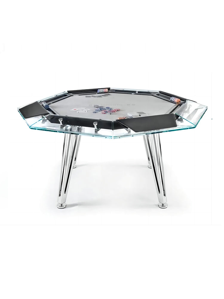 description | The Unootto Marble is a one-of-a-kind octagonal poker table featuring a unique low-iron glass frame supported by an Italian marble top, topped off with an Alcantara playing surface. The table features chrome finished metal legs, adding an extra modern touch. The Unootto luxury poker table is available in both the 8 and 10-players versions, with the option of adjusting the number of players with the removable leather armrests on each edition. |