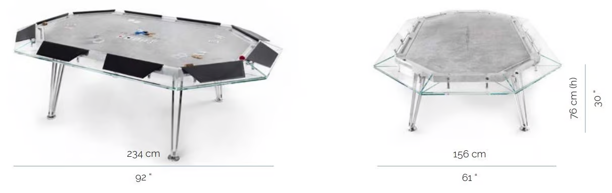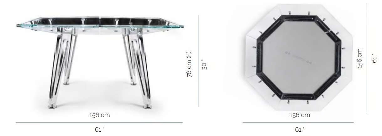 Material | Low-iron glass exterior frame+Marble interior frame+Alcantara® playing surface+Chrome metal components+Chrome finished metal legs |