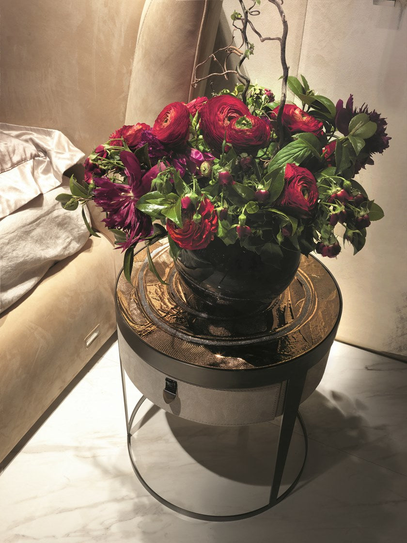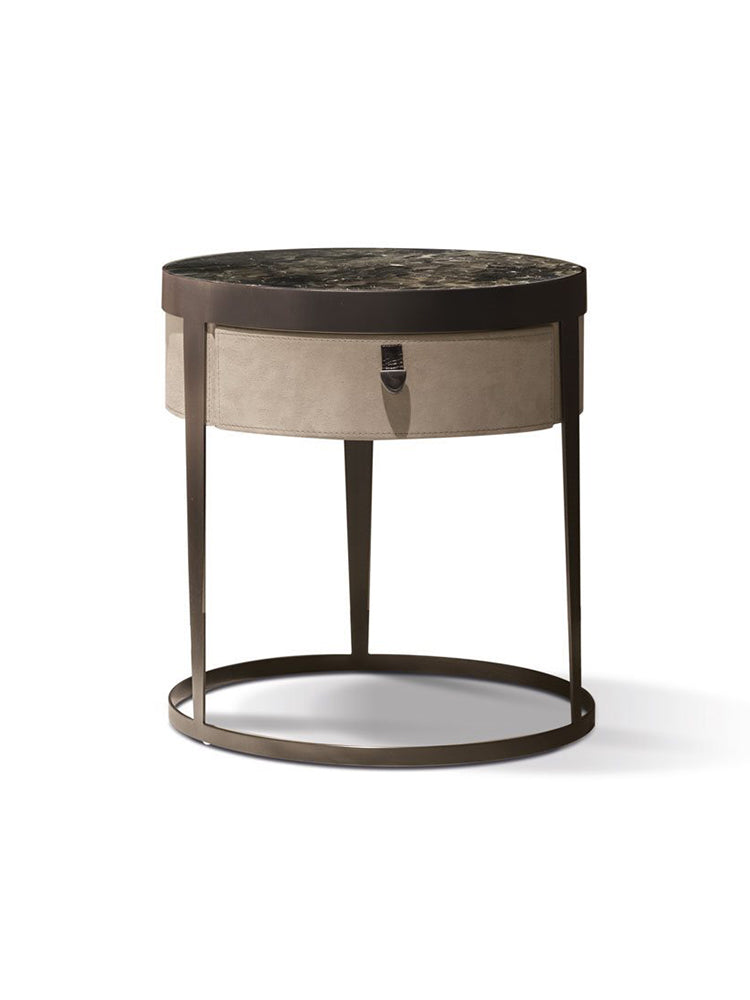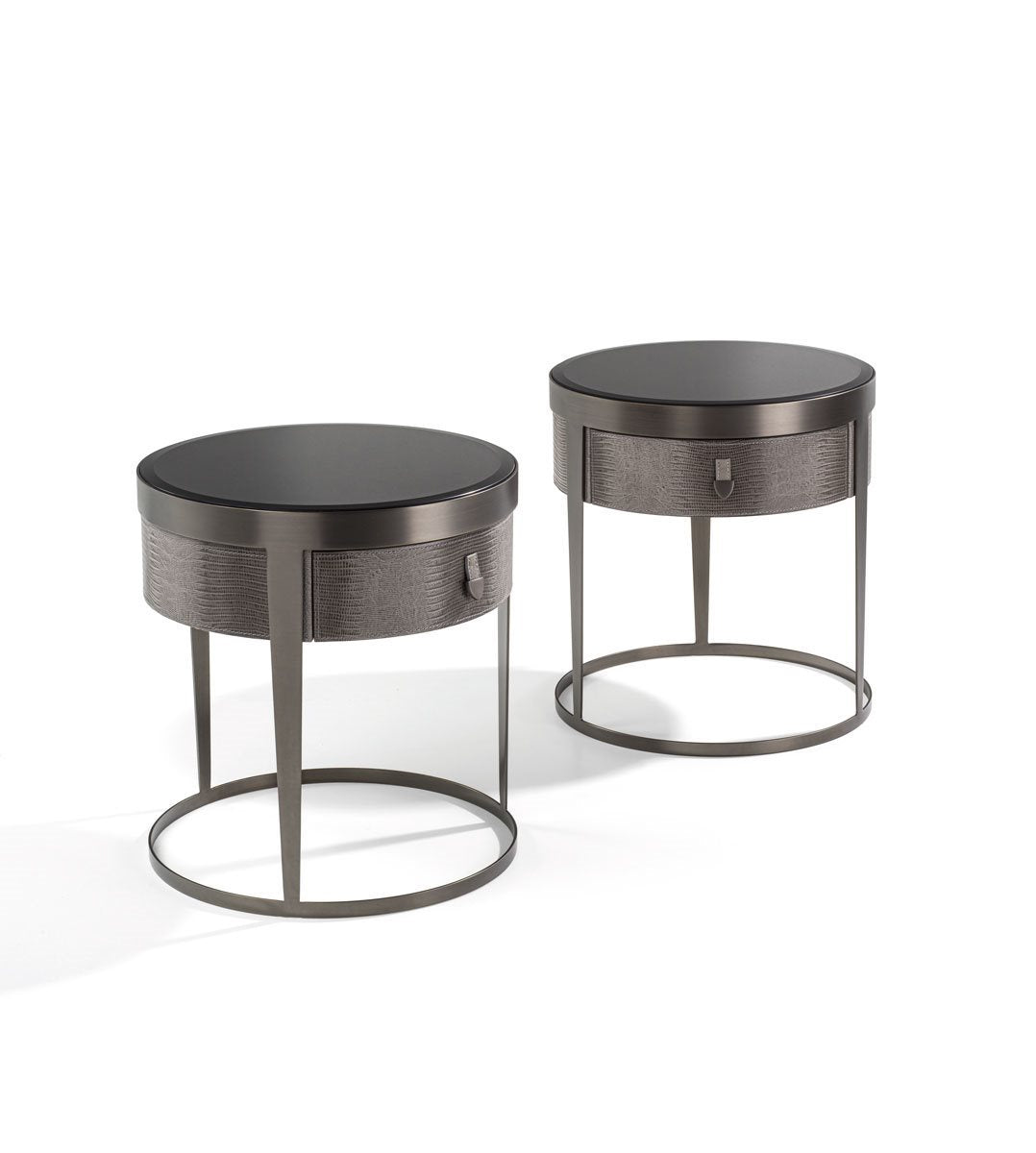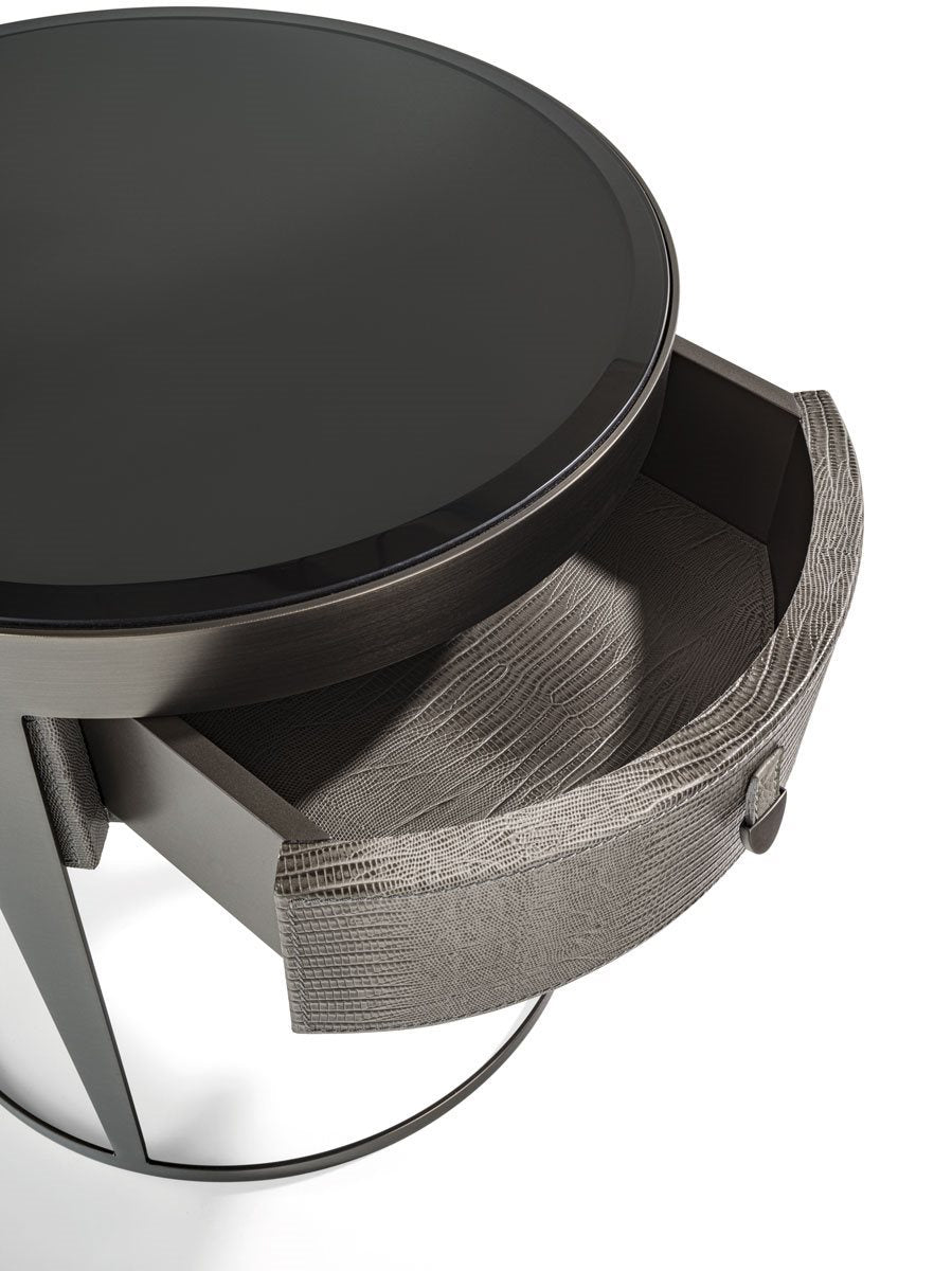 description | Bedside table with 1 drawer covered in leather from the catalogue. Frame in laser-cut ground metal. Frame finish: bright shaded brown, bright light gold, matt Champagne gold, bright chrome, bright black chrome, matt satin bronze, bright pink gold, matt pink gold, Black Rose gold. Top finish: ceramic, glossy lacquered wood in range colours, glossy/matt ebony, glossy/matt Canaletto walnut, painted black crystal 8 mm with bevelling, bronze or smoky mirror 6 mm with bevelling. |