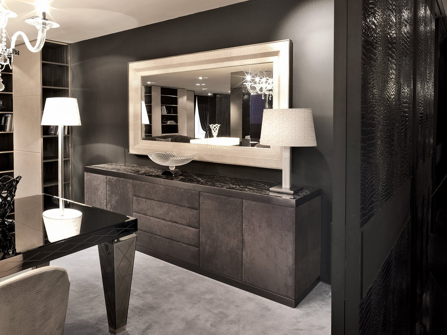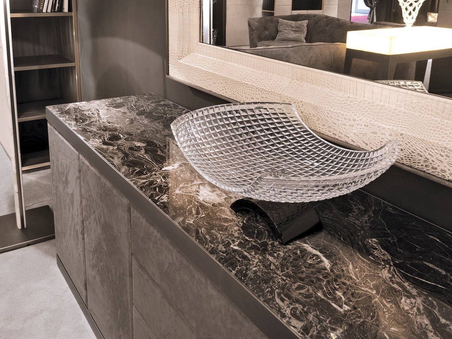 description | Living room area cabinet with doors and drawers. The available versions are listed below: A - Solid wood, B - Wooden frame with marble or mirror top, C - Wooden sides and top with covered leather front from our range or with mirror, D - Fully leather upholstered from our range with marble, wood or mirror top, E - Wooden sides, marble or mirror top, with leather upholstered front from our range or mirror front. Ground metal edges in the following finishes: Black Rose gold, bright shaded brown, bright light gold, Champagne matt gold, bright chrome, bright black chrome, matt satined bronze. Wood: glossy lacquered wood in range colours, glossy/matt ebony, glossy/matt Canaletto walnut, glossy/matt Sycamore frisè, Bronze or smoky bevelled mirror. Marbles: Sahara Noir marble (polyester finish), Dover White marble, Panda White marble, Guatemala Green marble, Corteccia marble, Port Saint Laurent marble, Red Levanto marble, Bardiglio Nuvolato marble, Elegant Brown marble, Shale Rosewood marble, Emperador Dark marble, Silver Wave marble, Agatha Black marble, Frappuccino marble, Calacatta marble, Fusion Light marble, Patagonia marble, Explosion Blu marble, Fusion Multicolor marble, Quarzo Juliet marble, Calcite Azul marble. Marble handles for the leather upholstered version, with push-pull opening for the mirror version. |