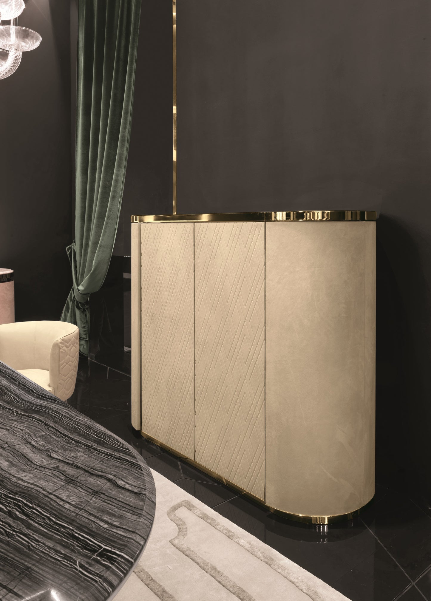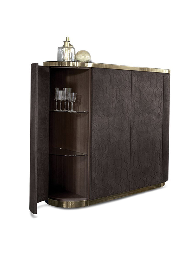 description | Bar unit fully coverd in leather or cashmere from the Loro Piana Interiors catalogue. Dark stained zebrano wood internal finish, transparent glass shelves, lasered mirror with illuminated decoration, two drawers and an optional mini wine refrigerator. The 3D effect door covering with raised “Diamond” or “Sequence” decoration is only available in the P.3 Suede and Lusso range.Top surface finish:- 5mm bronze or smoky bevelled mirror. Ground metal base and edges in the following finishes: Black Rose gold, bright shaded brown, bright light gold, matt Champagne gold, bright chrome, bright black chrome, matt satin bronze, bright pink gold, matt pink gold. |