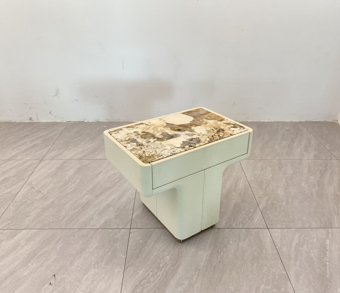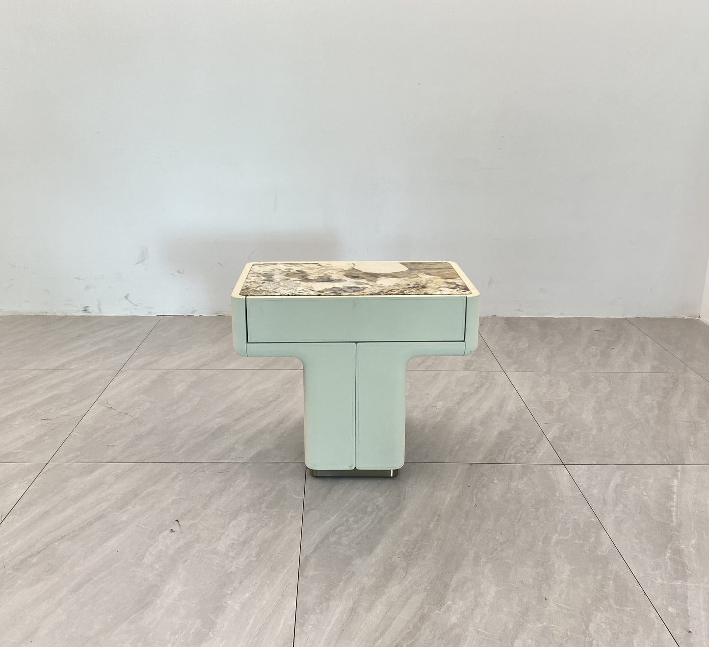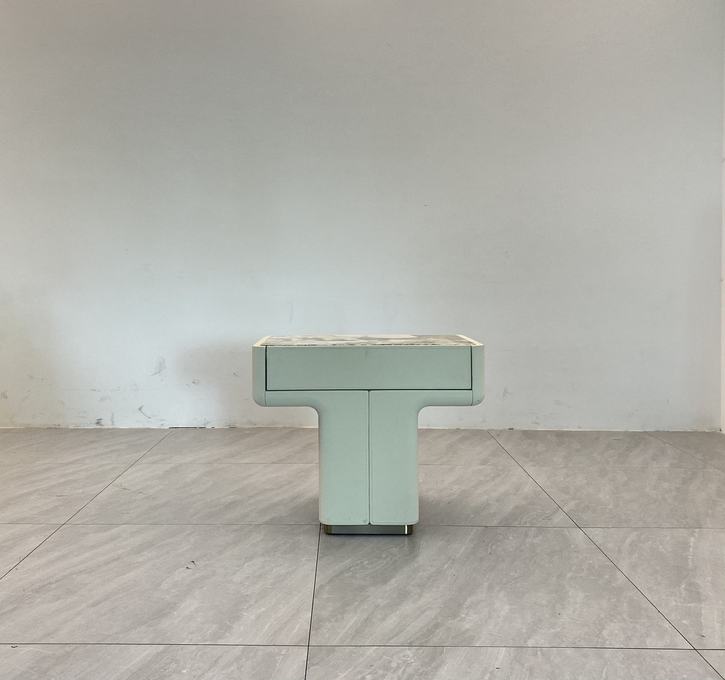 description | Bedside table with drawer with manually moulded glass fibre base. Skirting with ground metal edge in the following finishes: bright shaded brown, Black Rose gold, bright light gold, matt Champagne gold, bright chrome, bright black chrome, matt satin bronze, bright pink gold, matt pink gold. Structure (in MDF, thickness 40 mm) with particular form covered in leather from the catalogue. Push-pull opening and interiors in matt bronze lacquer. Top finishes: bronze or smoky mirror, Portoro marble, Sahara Noir marble (polyester finish), Dover White marble, Panda White marble, Guatemala Green marble, Corteccia marble, Port Saint Laurent marble, Red Levanto marble, Bardiglio Nuvolato marble, Elegant Brown marble, Shale Rosewood marble, Emperador Dark marble, Silver Wave marble, Agatha Black marble, Frappuccino marble, Calacatta Gold marble, Fusion Light marble, Patagonia marble, Explosion Blue marble, Fusion Multicolor marble, Juliet Quartz marble. Or in wood in the finishes: glossy/matt ebony, glossy/matt Sycamore frisè, glossy/matt Canaletto walnut. |