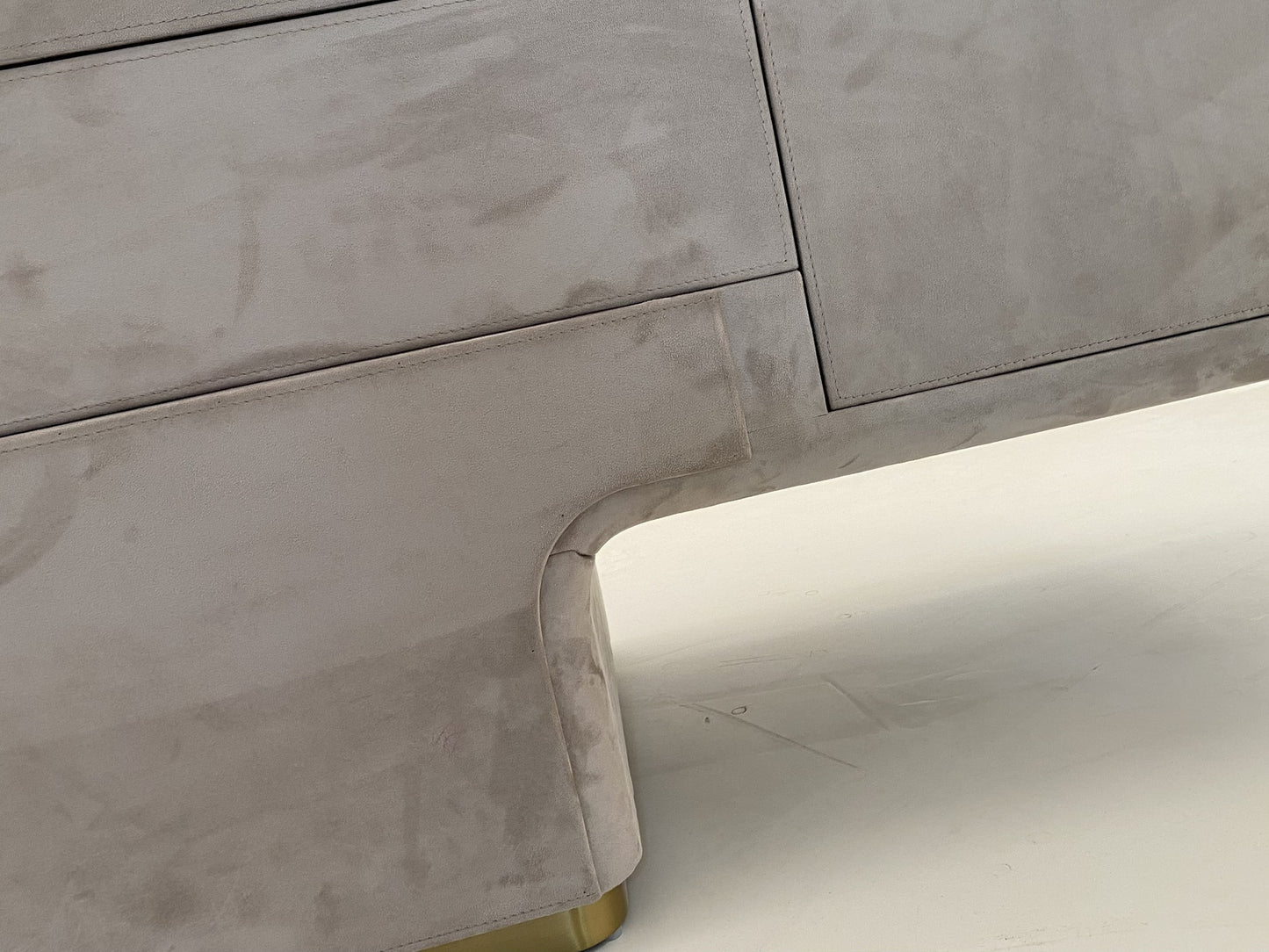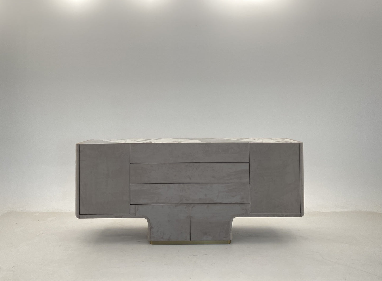 description | Living room cabinet with manually moulded glass fibre base. Ground metal baseboard and edges in the following finishes: bright shaded brown, bright light gold, matt Champagne gold, bright chrome, bright black chrome, matt satin bronze, bright pink gold, matt pink gold, Black Rose gold. Structure (in MDF th. 40 mm) with particular shape covered in leathers from the catalogue. Push-pull opening mechanisms and interiors painted matt bronze. Top finishes: bronze or smoky mirror, Portoro marble, Sahara Noir marble (polyester finish), Dover White marble, Panda White marble, Guatemala Green marble, Corteccia marble, Port Saint Laurent marble, Red Levanto marble, Bardiglio Nuvolato marble, Elegant Brown marble, Shale Rosewood marble, Emperador Dark marble, Silver Wave marble, Agatha Black marble, Frappuccino marble, Calacatta marble, Fusion Light marble, Patagonia marble, Explosion Blu marble, Fusion Multicolor marble, Juliet quartz marble. Or in wood in the finishes: Glossy/matt Ebony, glossy/matt Sycamore frisè, glossy/matt Canaletto walnut. |