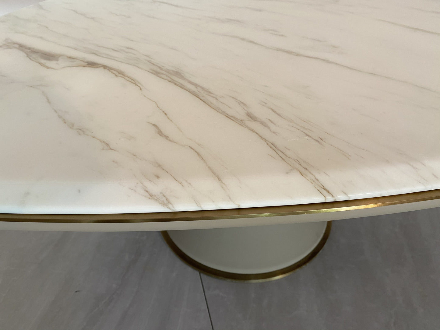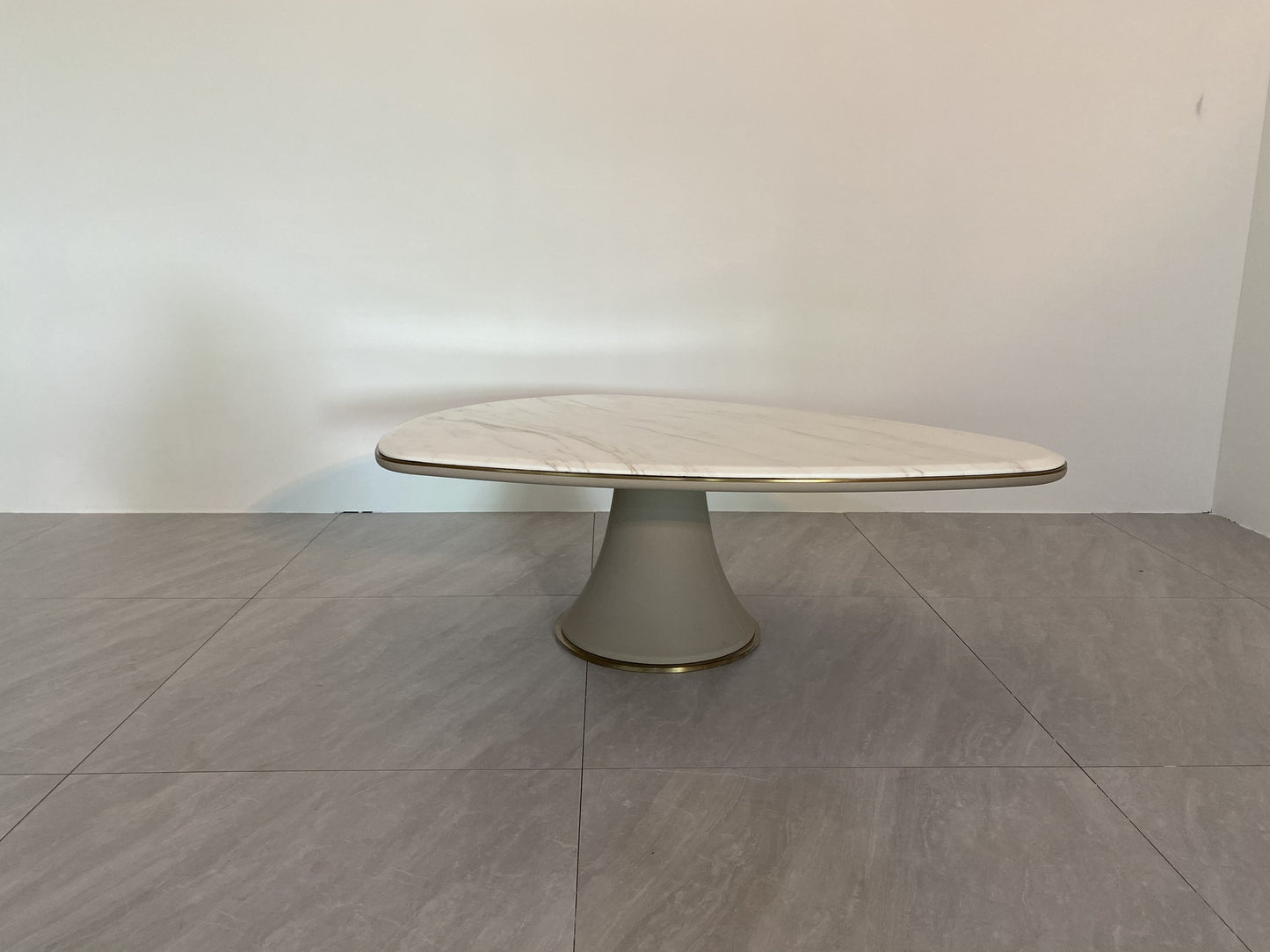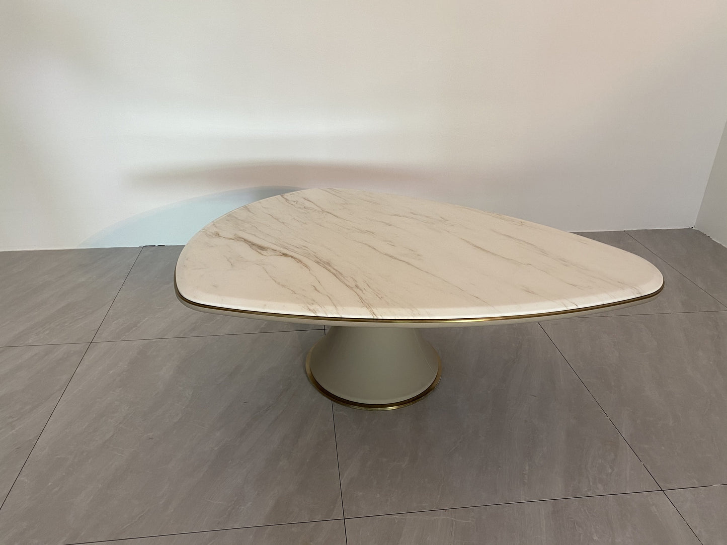 description | The coffee table is equipped with a single-leaf hyperboloid-shaped table foot made of glass fiber reinforced plastic material, the interior is painted with a metal structure, and the exterior is covered with leather.The metal plate under the base and the metal ring on the desktop are optional: -Glossy light gold, -Matte champagne gold, -Glossy chrome, -glossy black chrome, -Matte satin bronze, -Glossy rose gold, -Matte rose gold. Countertop material: -5mm thick copper or smoky mirror with beveled edges. 20mm thick marble with 20mm beveled edges: -Azul Macauba marble, -Sahara Noir marble (polyester fiber finish),-Dover White marble,-Panda White Marble,-Verde Guatemala Marble,-Corteccia Marble, -Port Saint Laurent Marble,-Rosso Levanto marble,-Bardiglio Nuvolato Marble,-Elegant Brown Marble,-Palissandro Oniciato Marble,-Emperor Dark Marble,-Silver Wave Marble,- Agatha Black marble,-Frappuccino marble,-Calacatta Gold Marble. |
