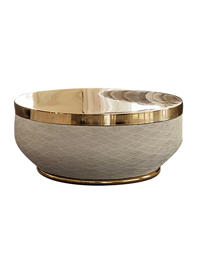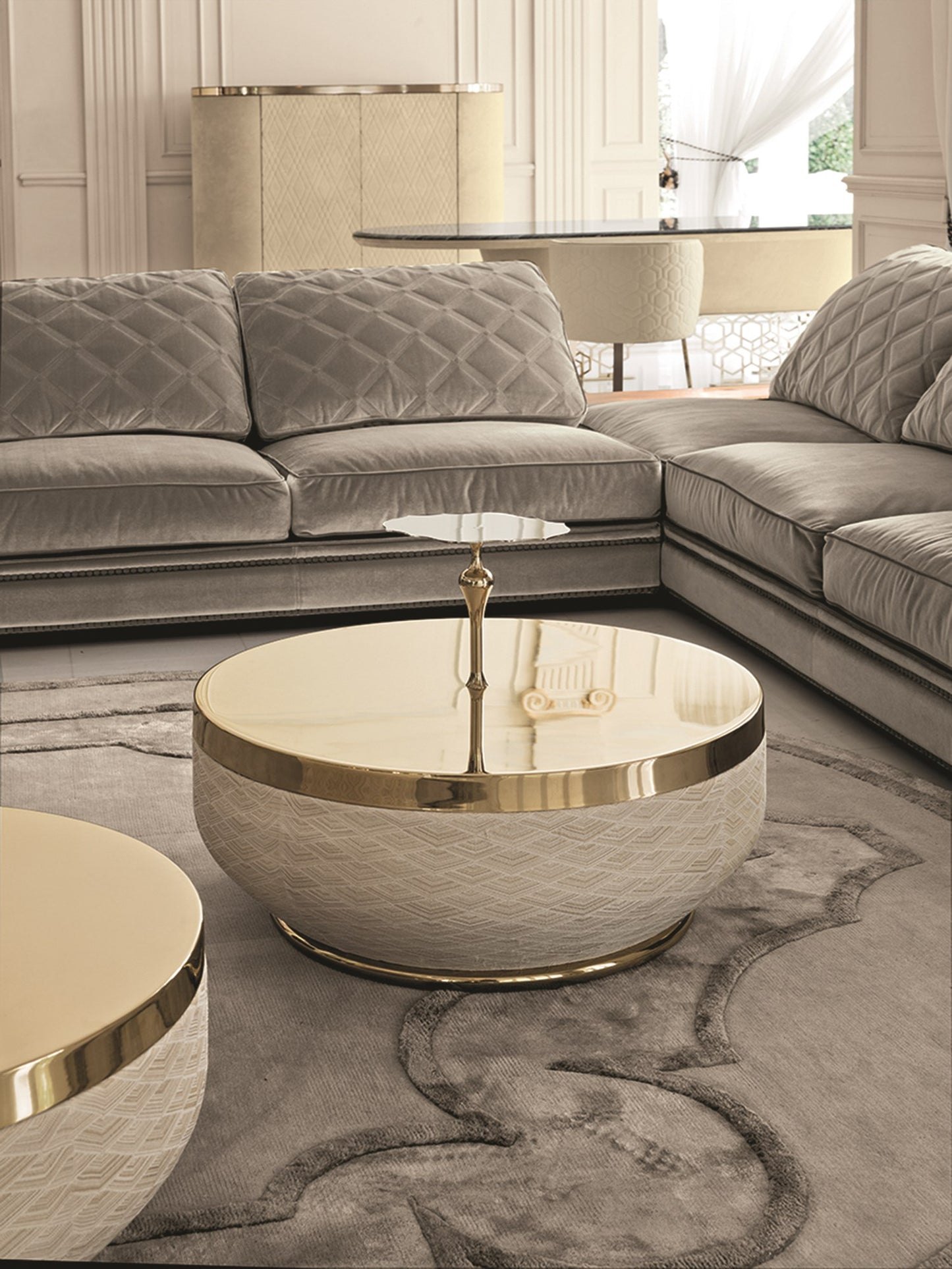 description | Small table with fiberglass structure covered in leather and metal top in the finishes: Black Rose gold, bright shaded brown, bright light gold, matt Champagne gold, bright chrome, bright black chrome, matt satin bronze, bright pink gold, matt pink gold. Optional: Possibility of adding a shaped tray on the top. |