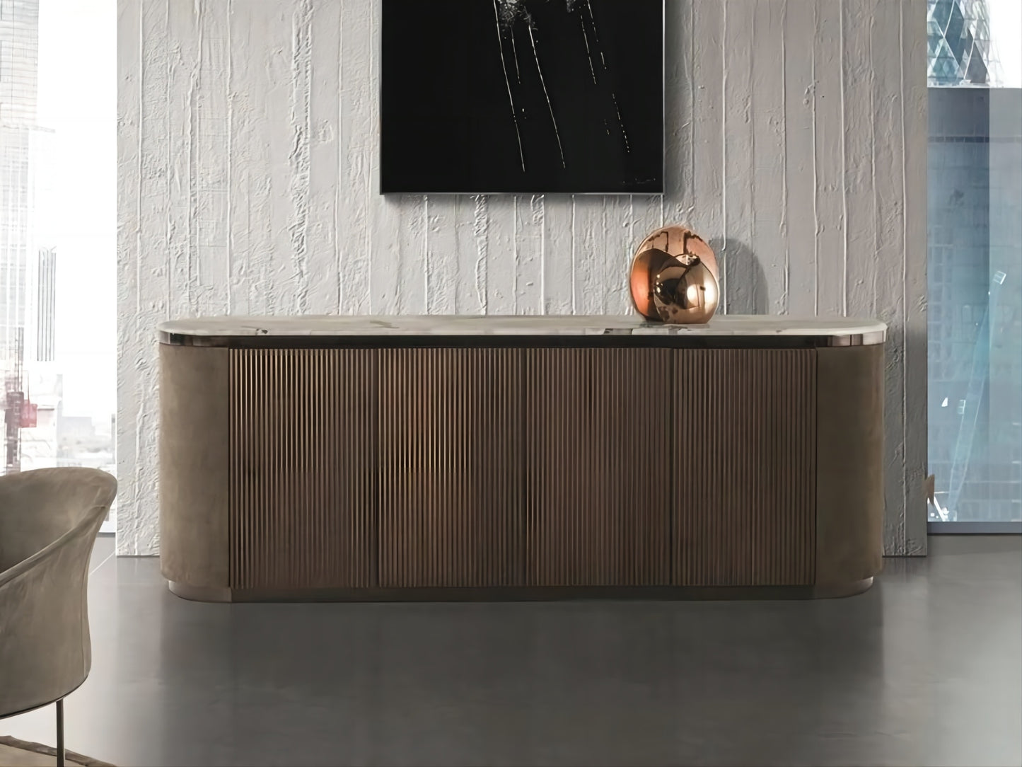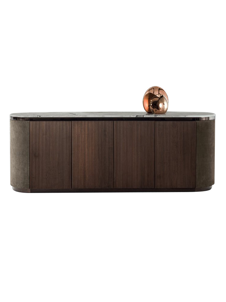 description | Living room piece with solid Canaletto walnut doors framed with a wave effect in Macadamia stain. Curved sides in leather or Loro Piana Interiors cashmere from the catalogue. Internal finish in dark stained zebrano wood. Optional: a glass diffuser with a luminaire can be fitted on the top. Top surface finish: 5 mm bronze or smoky bevelled mirror, 20mm marble with 20mm bevel: Emperador Dark marble, Guatemala Green marble, Bardiglio Nuvolato marble, Shale Rosewood marble, Silver Wave marble, Agatha Black marble, Calacatta marble, Dover White marble, Red Levanto marble, Elegant Brown marble, Frappuccino marble, Corteccia marble, Panda White marble, Sahara Noir marble (polyester finish), Port Saint Laurent marble, Fusion Light marble, Patagonia marble, Explosion Blue marble, Fusion Multicolor marble, Juliet Quartz marble, Portoro marble (divided into 2 pcs.). Ground metal base and edges in the following finishes: Black Rose gold, bright shaded brown, bright light gold,matt Champagne gold, bright chrome, bright black chrome, matt satin bronze, bright pink gold, matt pink gold. |