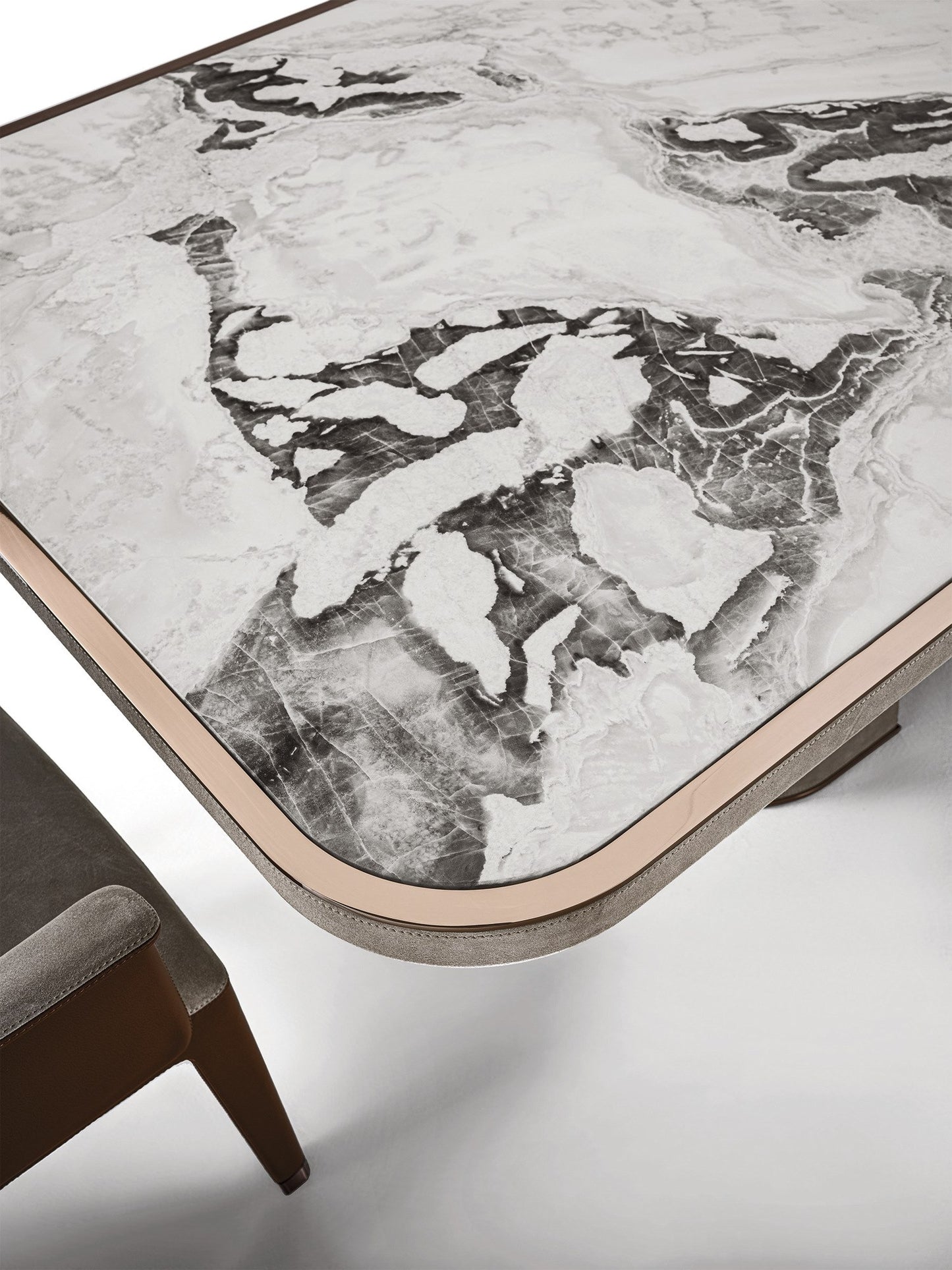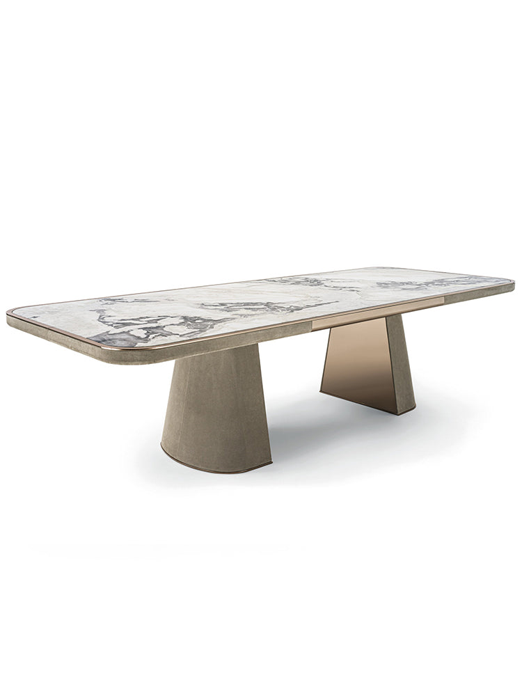 description | Table with 2 legs in glass fibre, covered externally in leather and internally in metal sheet in the following finishes: Satin nickel, Bright shaded brown, Black Rose gold, bright light gold, matt Champagne gold, bright chrome, bright black chrome, matt satin bronze, bright pink gold, matt pink gold. To complete the leg, the base is enhanced with a metal foot in the same finish as the plate. The undertop is covered in leather from the catalogue, like the leg, and decorated with metal inserts coordinated with the metal sheet on the base. The top has a perimeter border in metal that encloses the top, in the finishes: White Carrara marble, Imperial Brown marble, Sahara Noir marble (glossy and matt polyester finish), Dover White marble, Panda White marble, Guatemala Green marble, Corteccia marble, Port Saint Laurent marble, Red Levanto marble, Bardiglio Nuvolato marble, Elegant Brown marble, Shale Rosewood marble, Emperador Dark marble, Silver Wave marble, Agatha Black marble, Frappuccino marble, Calacatta marble, Fusion Light marble, Patagonia marble, Explosion Blue marble, Fusion Multicolor marble, Juliet Quartz marble. A lazy susan (cm Ø 75-90-110) is available to set on the top, in the finishes: glossy lacquered wood in range colours, glossy/ matt Maple, glossy/matt heat-treated Eucalyptus, glossy/matt Sycamore frisè, glossy/matt Ebony, glossy/matt Canaletto walnut, glossy Walnut burl wood or in marble in the varieties listed in the catalogue. |