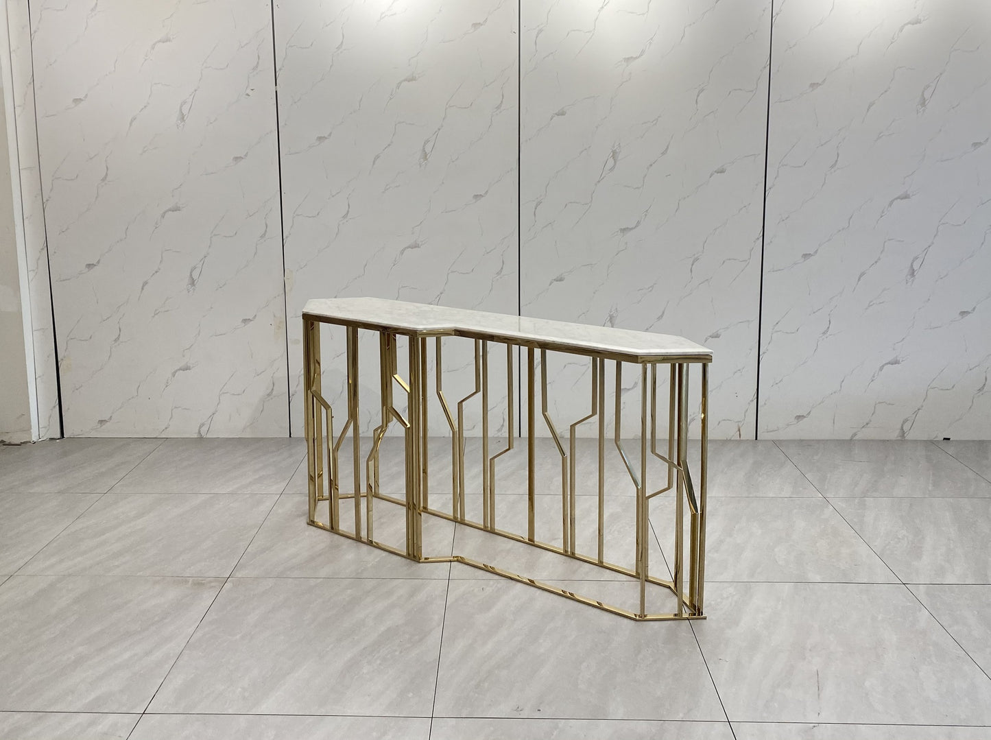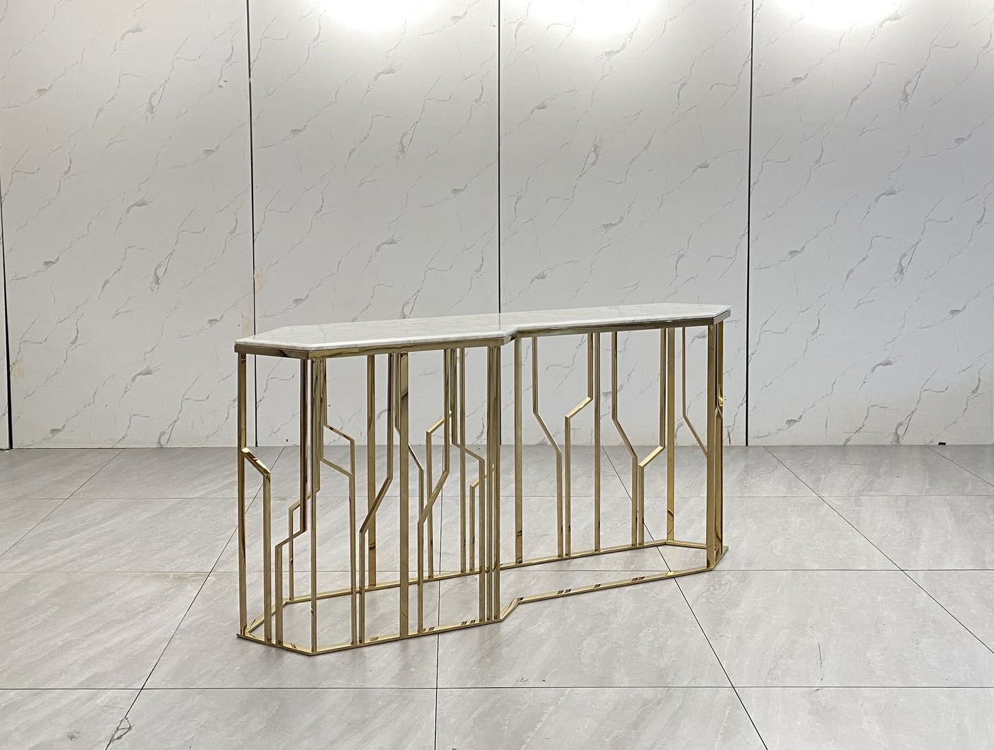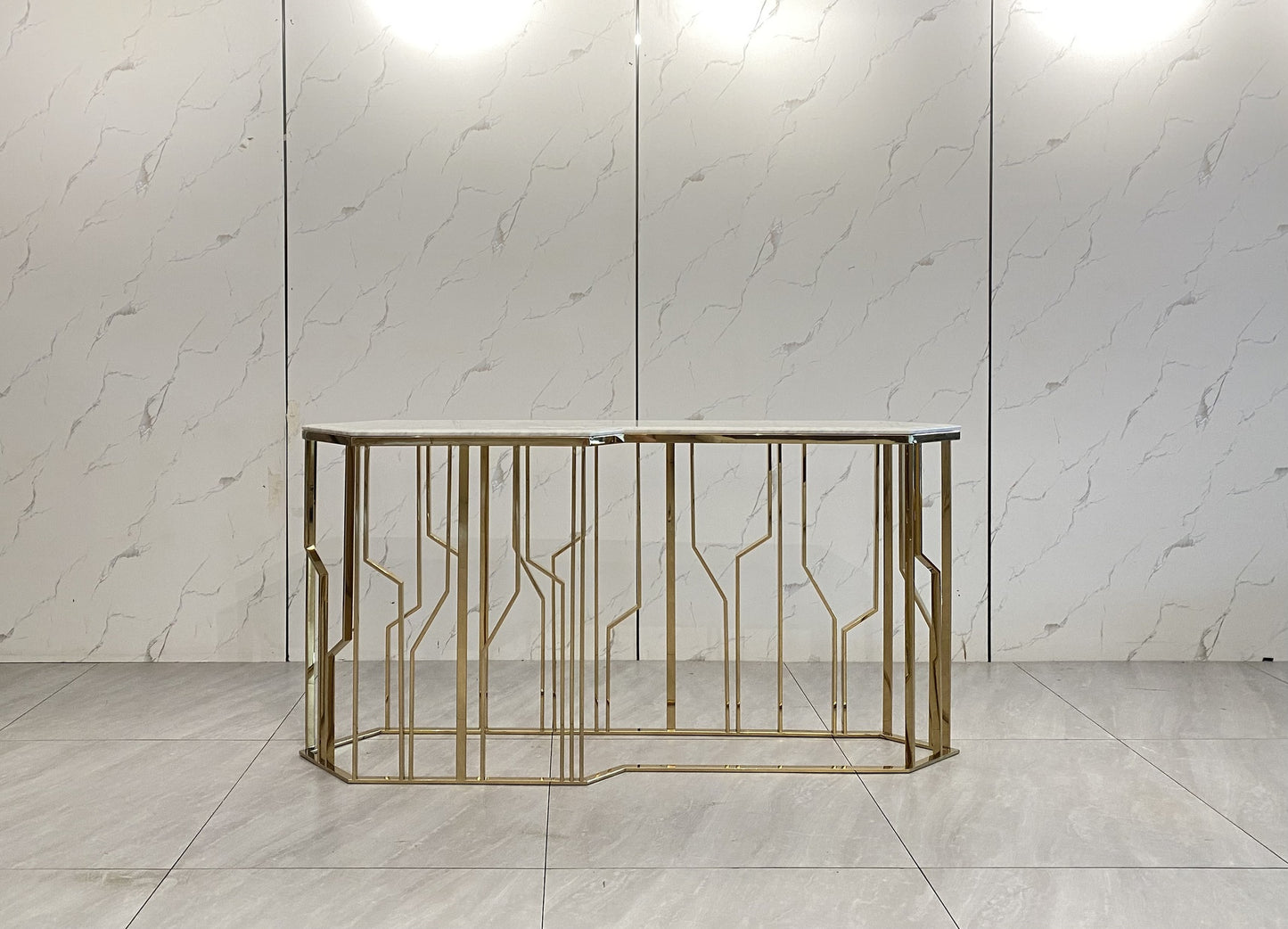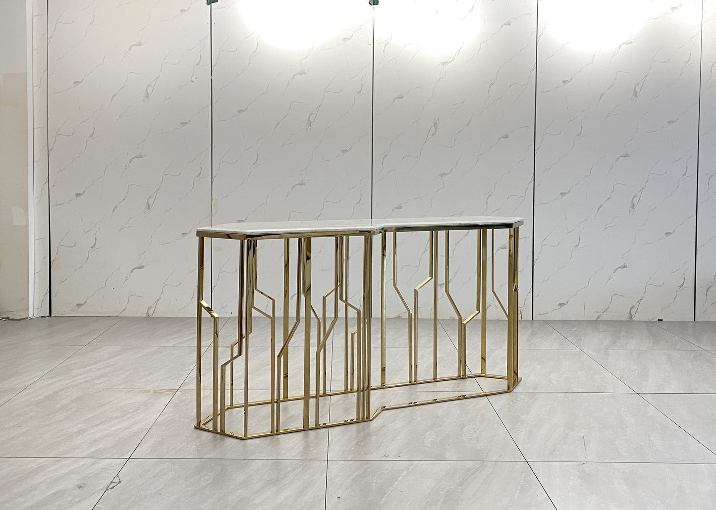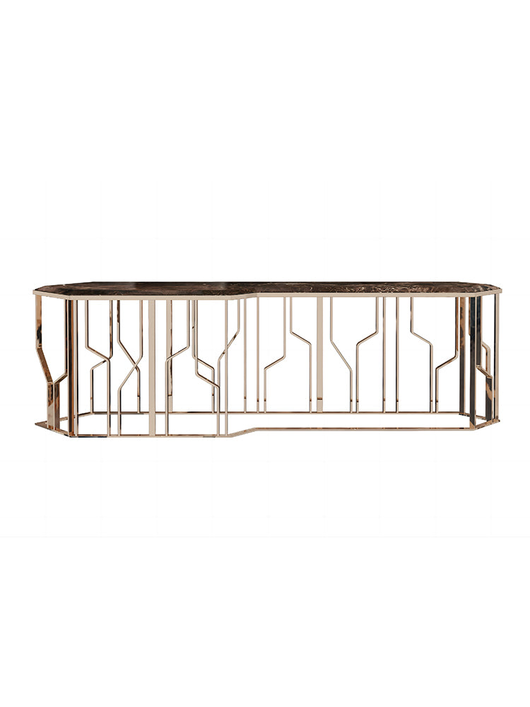description | Console with metal base, available in: Black Rose gold, bright shaded brown, bright light gold, matt Champagne gold, bright chrome, bright black chrome, matt satin bronze, bright pink gold, matt pink gold. two-tone finish, upon request. Top finish: Marble of 20 mm. thickness with 20 mm. bevelling in the colours: Sahara Noir marble (polyester finish), Dover White marble, Panda White marble, Guatemala Green marble, Corteccia marble, Port Saint Laurent marble, Red Levanto marble, Bardiglio Nuvolato marble, Elegant Brown marble, Shale Rosewood marble, Emperador Dark marble, Silver Wave marble, Agatha Black marble, Frappuccino marble, Calacatta marble, Fusion Light marble, Patagonia marble, Explosion Blu marble, Fusion Multicolor marble, Juliet quartz marble, Calcite Azul marble, bronze or smoky mirror 5 mm with bevelling. Upholstered in leathers from the catalogue. |