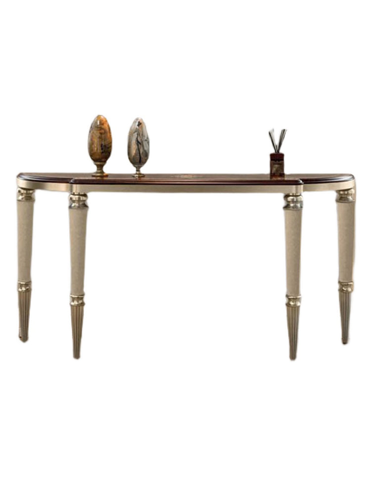 description | Console with shaped top in the finishes: matt ebony with inlay, Marble 20 mm thickness with half-bullnose rounded edge: Sahara Noir marble (polyester finish), Dover White marble, Panda White marble, Guatemala Green marble, Corteccia marble, Port Saint Laurent marble, Red Levanto marble, Bardiglio Nuvolato marble, Elegant Brown marble, Shale Rosewood marble, Emperador Dark marble, Silver Wave marble, Agatha Black marble, Frappuccino marble, Calacatta marble, Fusion Light marble, Patagonia marble, Explosion Blu marble, Fusion Multicolor marble, Juliet quartz marble. Undertop with metal edge in the same finish as the legs or covered in leather as in our sample set. Legs with insert (A) available in the finishes: ivory onyx, Guatemala Green marble, Corteccia marble, Elegant Brown marble, Shale Rosewood marble, Silver Wave marble, Agatha Black marble, Calacatta marble, covered in leathers as in our sample set. Turned details of legs (B-C) available in the finishes: Black Rose gold, bright shaded brown, bright light gold, matt Champagne gold, bright chrome, bright black chrome, matt satin bronze, bright pink gold, matt pink gold. covered in leathers from the catalogue. |