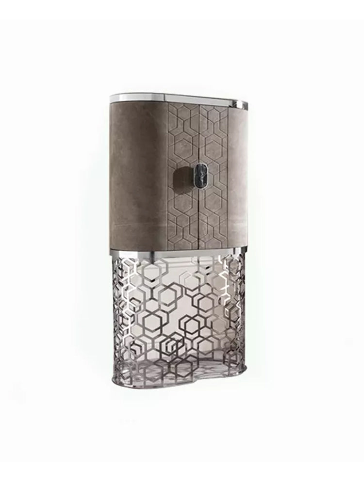 description | Minibar unit with ground metal base, laser cut with “Sequence” decoration and calendered. Base finish: Black Rose gold, bright shaded brown, bright light gold, matt Champagne gold, bright chrome, bright black chrome, matt satin bronze, bright pink gold, matt pink gold. Bar unit fully coverd in leather or cashmere from the Loro Piana Interiors catalogue. Handle in marble from the range. Dark stained zebrano wood internal finish, clear glass shelves, lasered mirror with illuminated decoration.The 3D effect door covering with raised “Diamond” or “Sequence” decoration is only available in the P.3 Suede and Lusso range. Top surface finish:- 5mm bronze or smoky bevelled mirror. |