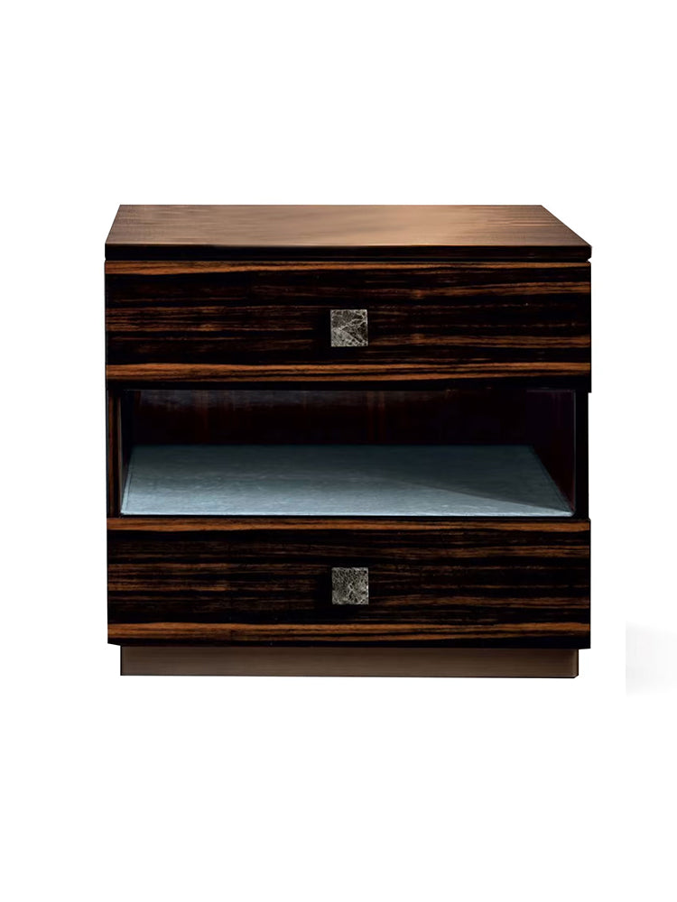description | Bedside table with 2 drawers in wood in the finishes: glossy lacquered wood in range colours, glossy/matt ebony, glossy/matt Canaletto walnut, glossy/matt Sycamore frisè. Central compartment with top covered in leather or velvet from the catalogue. Handles in marble or hide, base painted bronze. |