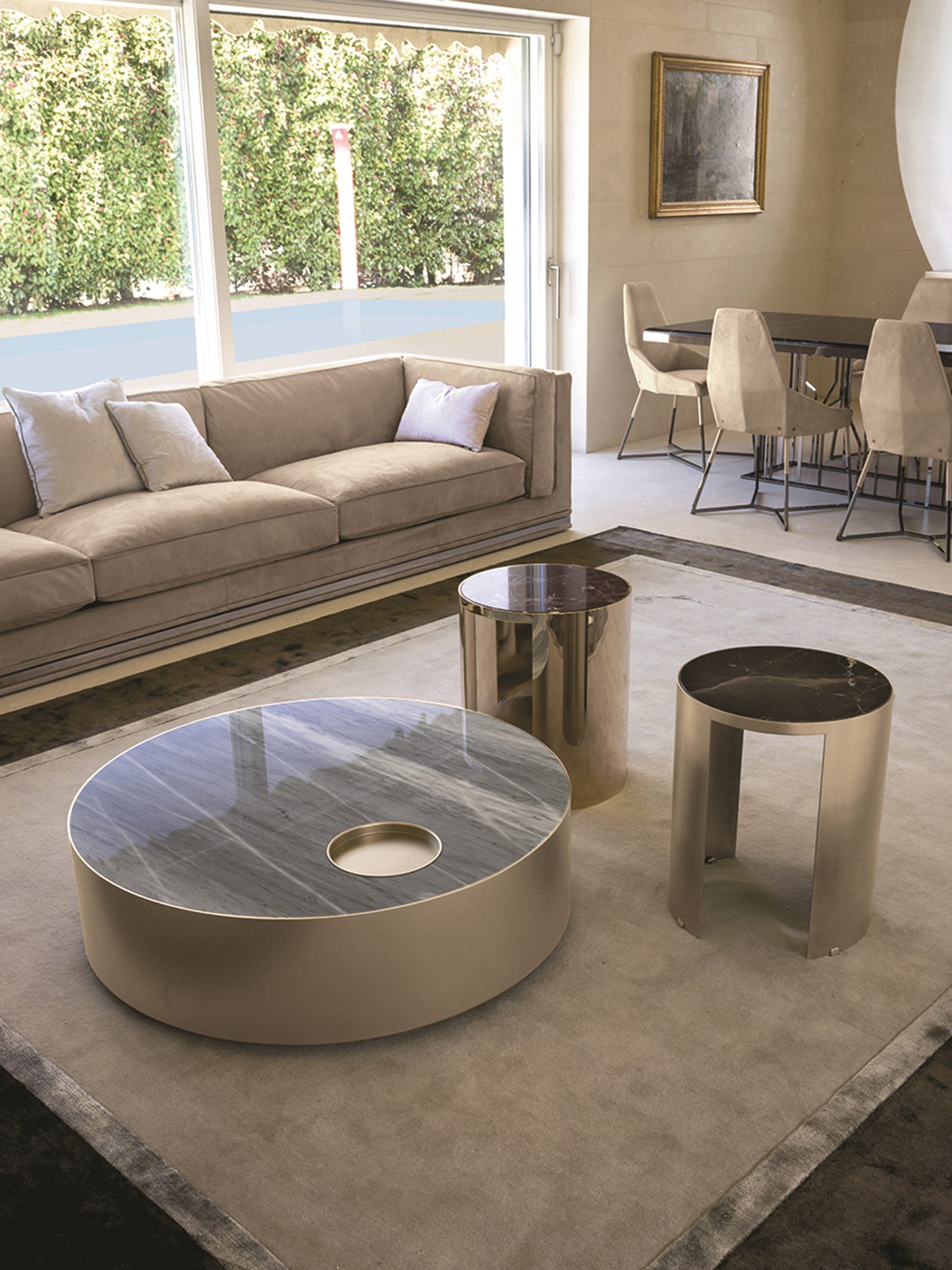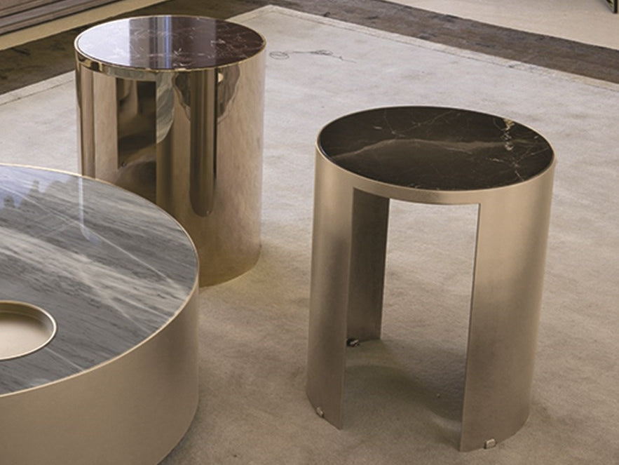 description | The frame uses calendered metal, and the following surface treatments can be selected: glossy light gold; matte champagne gold; glossy chrome plated; glossy black chrome plated; matte matte bronze. Or the leather in the sample series is covered with longitudinal quilted pattern desktop treatment: glossy/matte ebony; glossy/matte Canaletto walnut; glossy ivory paint; Port Saint Laurent marble; Rosso Levanto marble; Bardiglio Nuvolato marble; Elegant Brown marble; Palissandro Oniciato marble; Emperor Dark marble; Silver Wave Marble; Agatha Black marble; Frappuccino Marble; Calacatta Gold marble; bronze or smoky gray mirror Surface; black lacquered crystal glass. A round metal tray has also been added to the Ø100 version. |