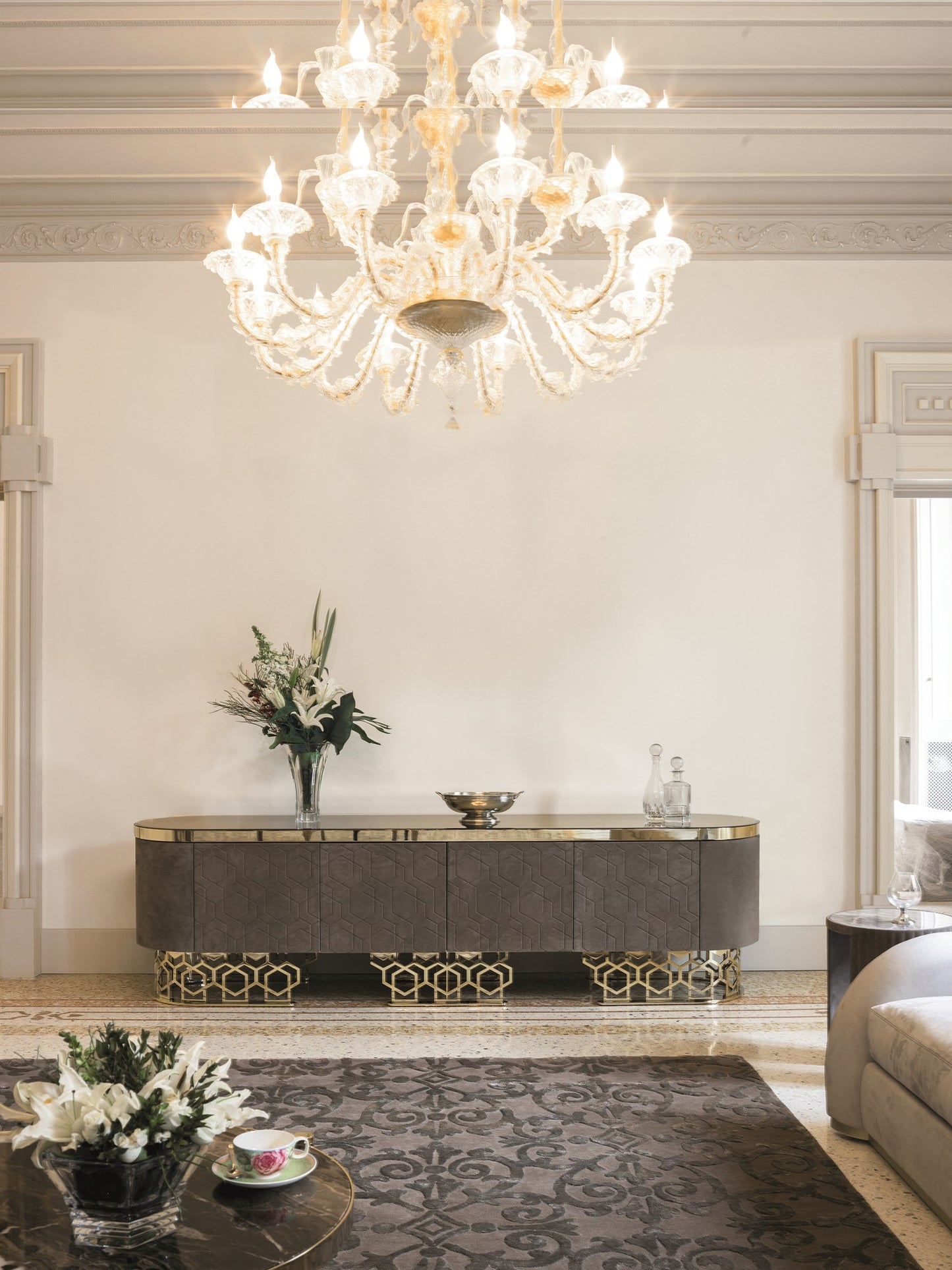 description | Living room cabinet covered entirely in leather from the categories in the range. Internal finish in dark stained zebrano wood. Base in calendared laser-cut ground metal with “Sequence” decoration in the following finishes: Black Rose gold, bright shaded brown, bright light gold, matt Champagne gold, bright chrome, bright black chrome, matt satin bronze, bright pink gold, matt pink gold. Edges in ground metal in the same finish as the base. Optional: it is possible to insert a light with glass diffuser only on the shelf. The 3D covering of the doors with “Diamond” or “Sequence” decoration in relief is possible only with P.3 leather Cat. Suede and Lusso. Shelf finishes: bronze or smoky mirror 5 mm with bevelled edge. Marble mm 20 thick with bevel mm 20: Portoro marble, Sahara Noir marble (polyester finish), Dover White marble, Panda White marble, Guatemala Green marble, Corteccia marble, Port Saint Laurent marble, Red Levanto marble, Bardiglio Nuvolato marble, Elegant Brown marble, Shale Rosewood marble, Emperador Dark marble, Silver Wave marble, Agatha Black marble, Frappuccino marble, Calacatta marble, Fusion Light marble, Patagonia marble, Explosion Blu marble, Fusion Multicolor marble, Juliet quartz marble. |