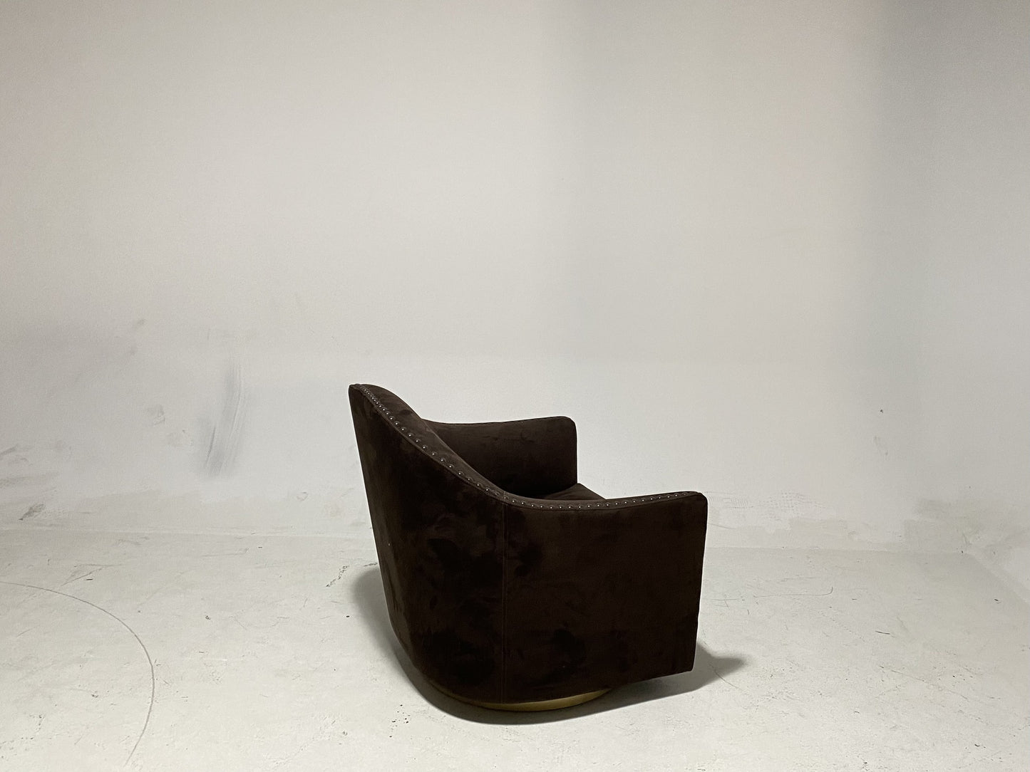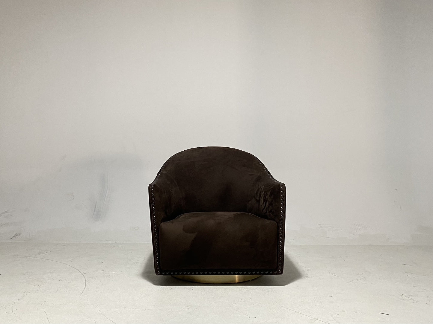 description | Swivel armchair (full 360° rotation) with leather or fabric upholstery, finished with visible buttons positioned manually and individually, in the finishes: bright chrome, matt black, bright light gold or matt antiqued gold, or covered in leather and, when possible, in velvet. The structure is in beech and fir plywood with high-resistance elastic bands, covered in high density polyurethane foam. The seat cushion is in multi-density polyurethane foam with rounded Memory Foam surface for better resistance to crushing over time, covered with a soft quilt of sterilised goose down. A painted bronze metal ring is placed on the base.Given the special manufacturing process, the upholstery on the seat and structure is not removable. |
