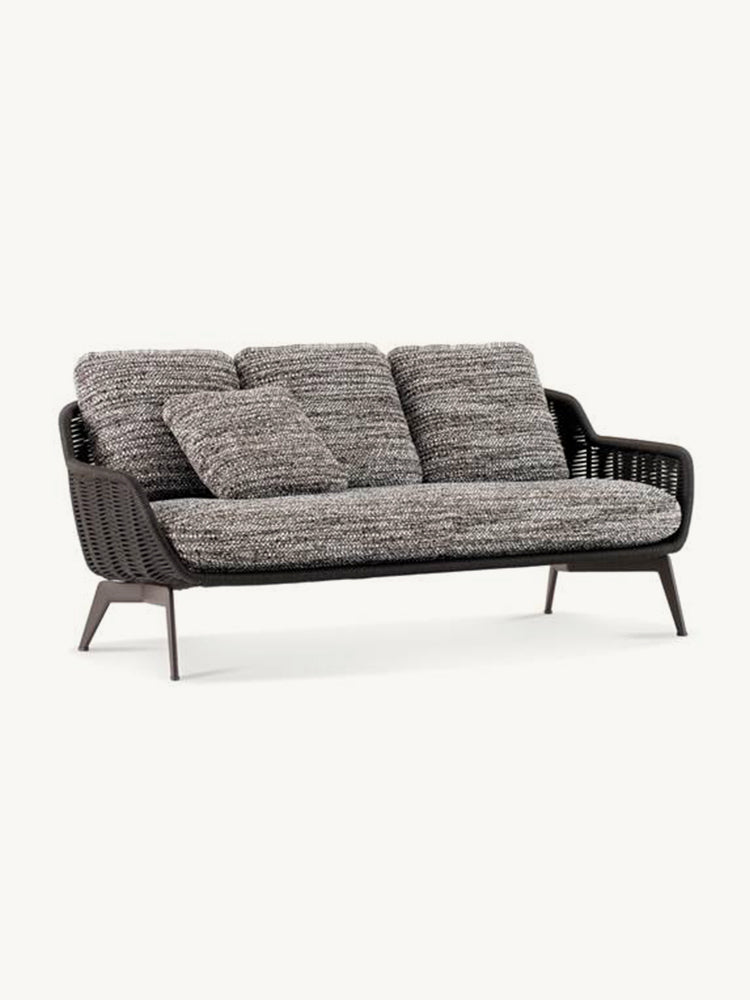 description | The seats rest on a matt varnished aluminium base, in the shades of Ecru and Dark Brown, reiterating the colours of the cord, and feature padded cushions with extra-durable polyurethane foam inserts, covered in water-repellent fibre and fabric. The Belt Cord Outdoor family is composed of a two-seater sofa, bergère, armchair, footstool, lounge armchair and dining little armchair, all also available with natural finish teak legs. With a more classic feel and a warmer aesthetic, this version can be easily combined with all the other furnishing pieces in the outdoor collection. |