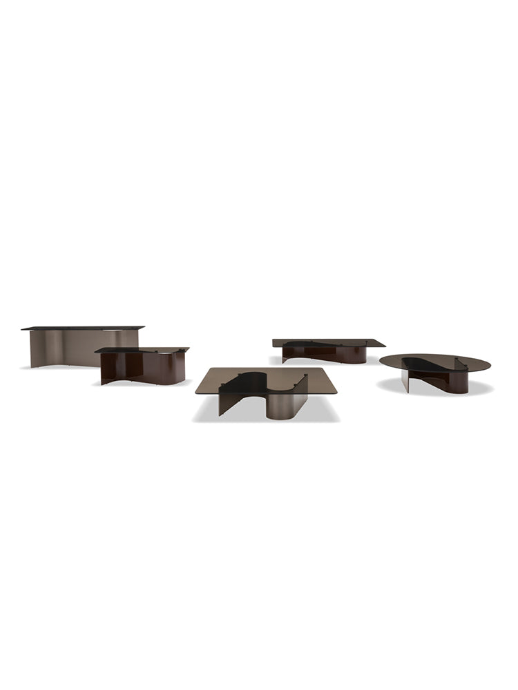 description | In a manifest homage to the world of contemporary sculpture, the Bender side table reinterprets, on a reduced scale, the concept of a sheet of metal affected by the motion of a wave that curves and stretches.A sharp and decisive mark gives shape to the metal sheet of the base on top of which rests a bronzed glass surface. A double shade, glossy and opaque, defines the two surfaces of the supporting structure, which combines the satin Bronze painted metal with the Corten or Sand coloured glossy paint. |