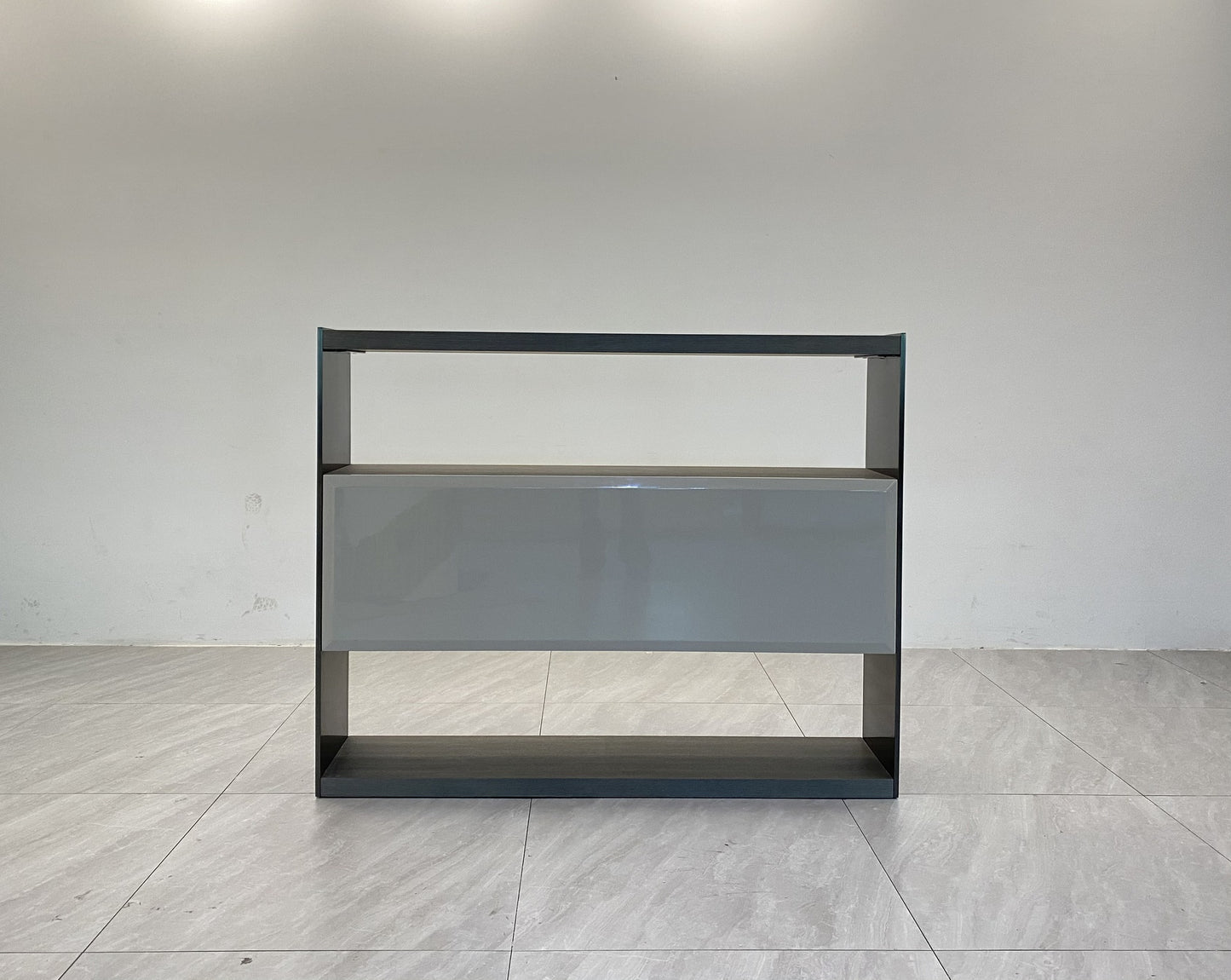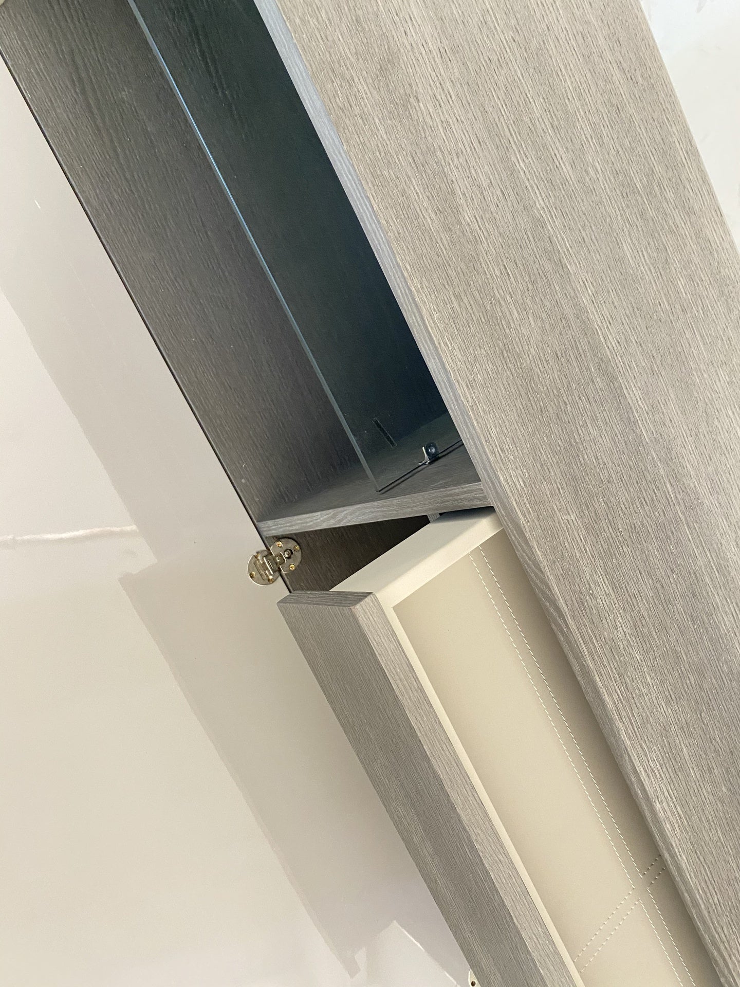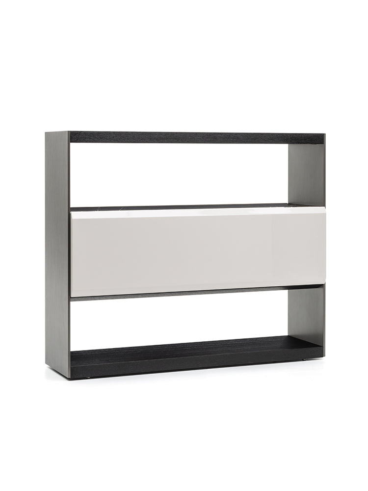 description | The Carson family welcomes the "buffet" version of the bookcase, characteristically inspired by a simple, contemporary look with clean lines that mark out the frame and central volume. The striking effect created by combining different thicknesses makes a comeback, with thinner ones for the sides in satin finish aluminium, painted Malt colour, and thicker ones for the bottom shelf and the highest top in Moka-coloured ash. The central "buffet" volume looks suspended and features a top in Stone Grey marble. The top presents an elegant faceting that joins up with the same distinctive faceted detail on the edge along the length of the long doors, created with a painted finish in the shades of Warm Grey or Moka, or in Moka-coloured ash. Inside, it conceals a free compartment for storing dishes and glasses and an equipped area with a sliding tray on runners to make the objects inside easier to pick up. A drawer reveals the sophisticated cutlery holder in saddle hide. |