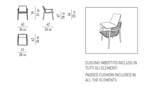 description | Characterised by an interwoven frame that hosts soft seat and backrest cushions, Fynn has in the armrest its signature element. Elongated and slightly curved, rounded and smooth to the touch, it is completely handmade: its precise, well-defined line identifies the entire family, composed of armchair, lounge and dining little armchairs, benches, footstools, coffee tables in different sizes and a dining table. The Fynn Outdoor armchair and little armchairs feature a distinctive ultra-lightweight aesthetic with a simple structure in teak. The frame is interwoven with wicker-effect cords in Mud colour, hosting a padded seat and backrest cushion, designed as a single element. The informal rigour with which Fynn Outdoor hosts the padded element designs a comfortable seat. |