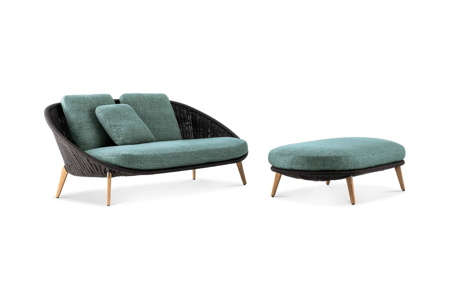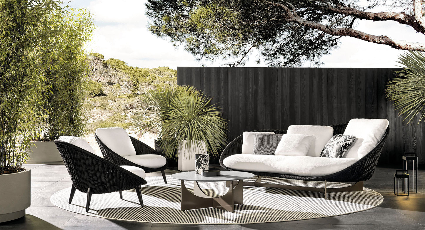 description | The Lido Cord Outdoor family is composes of a semi-curved lounge sofa, a linear two-seater sofa, an armchair, a dining little armchair and a lounge little armchair, with an enveloping design reminiscent of a comfy nest, also complemented by a bench and an ottoman. |
