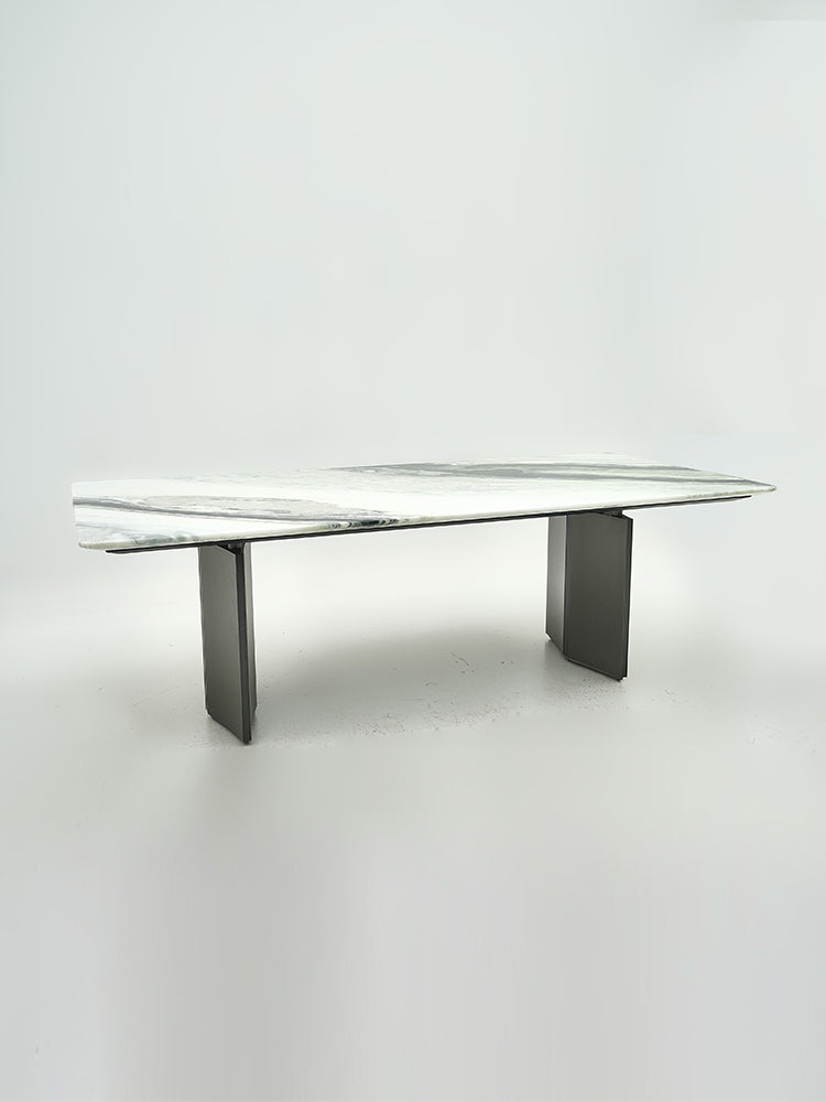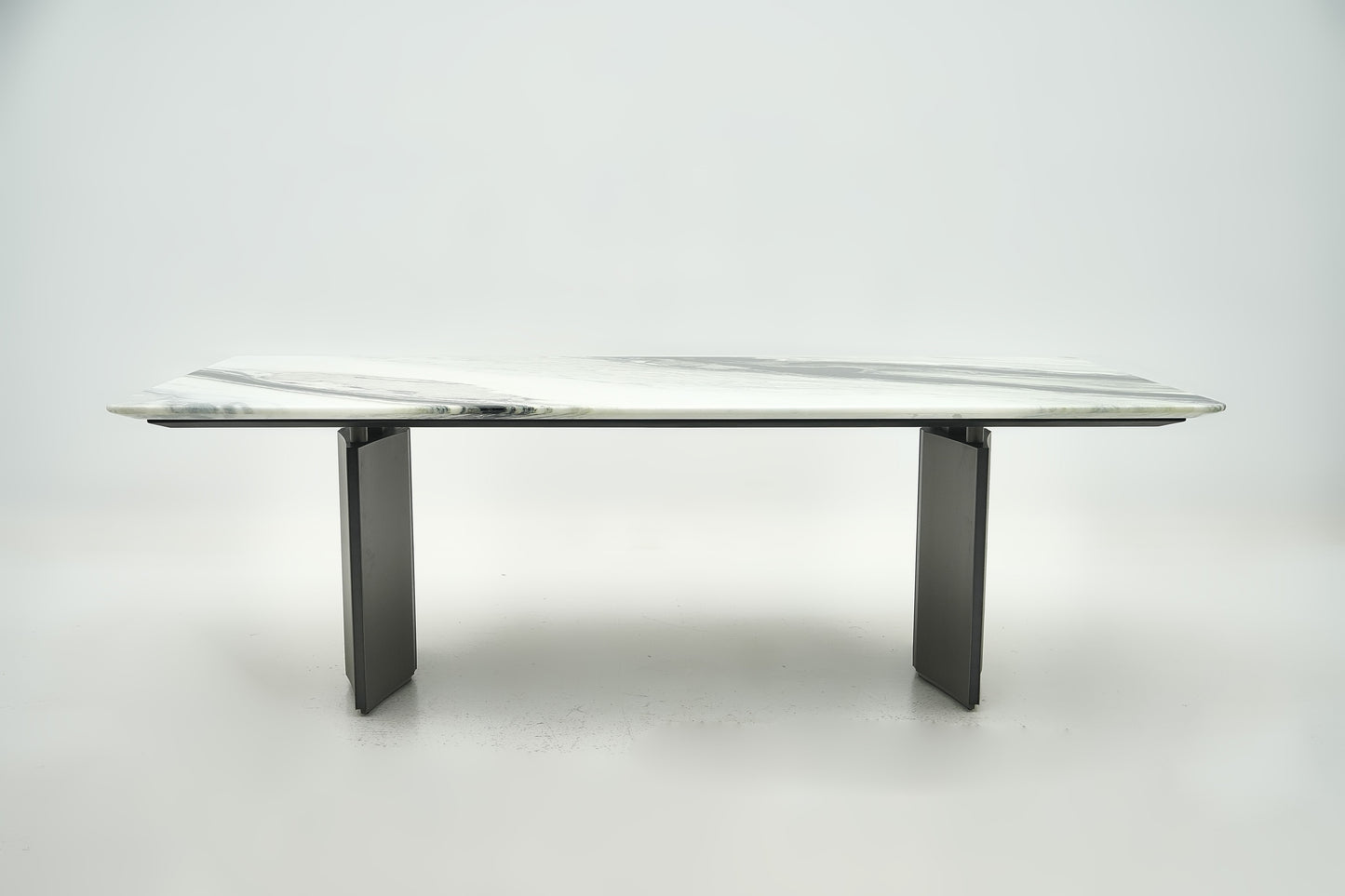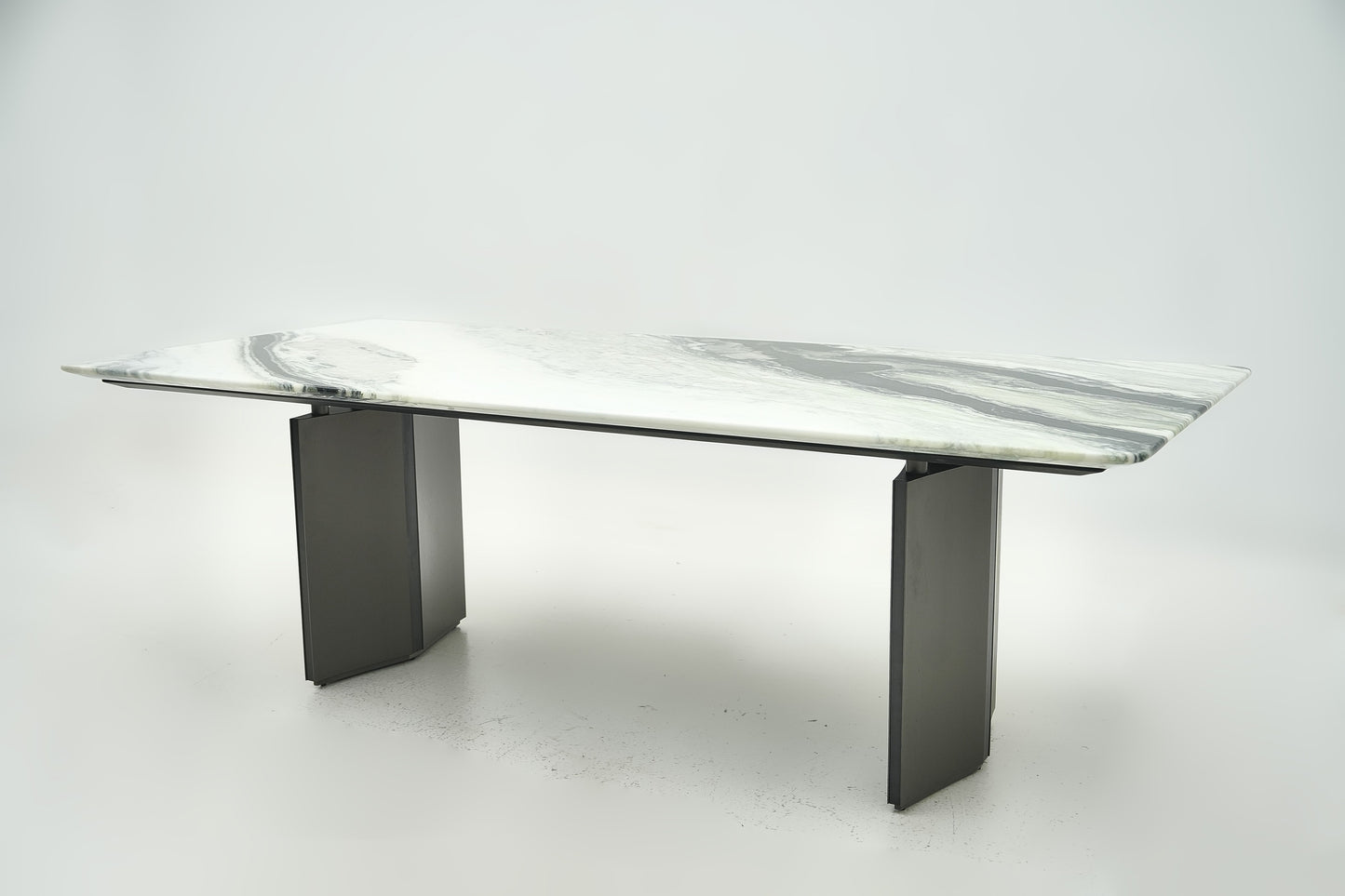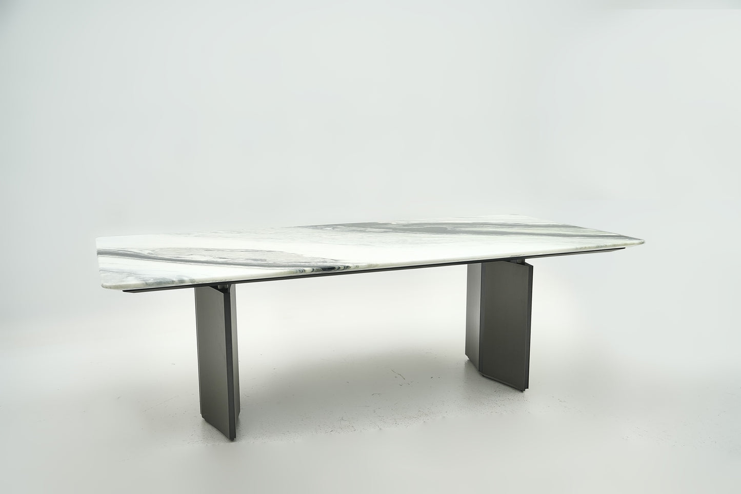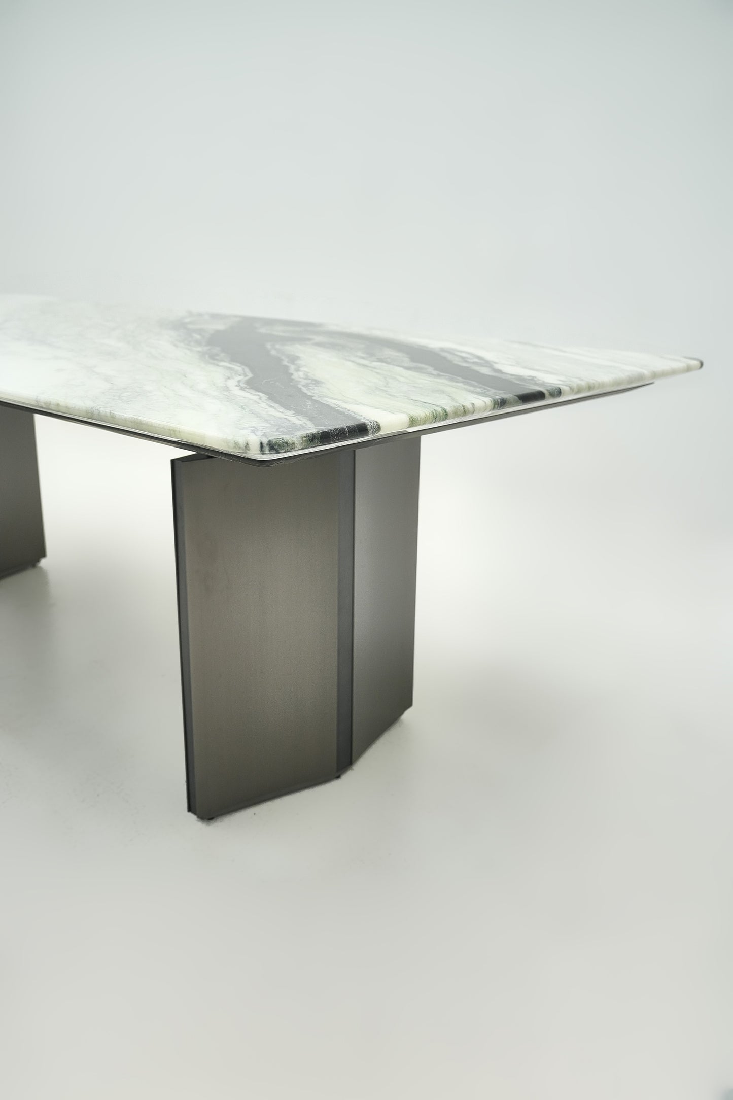 Morgan is based on the traditional refectory table, reinterpreted in a more contemporary key through a series of sophisticated design solutions and the pairing of striking luxury materials. The supports are made of bronze metal sheet and feature a tapered diamond-shaped section that lends vigor to the base, while the top, available in Tobacco stained flamed oak, Moka lacquered flamed oak, matt ebony and glossy lacquer finish in the following colors: Sand, Caramel and Granite is also characterized by a distinctive flared edge. Morgan is available in a number of sizes and is designed to accommodate custom-sized tops as well. In addition to the rectangular version, it is also available with a round top, held in place by three supports in bronze metal sheet. |