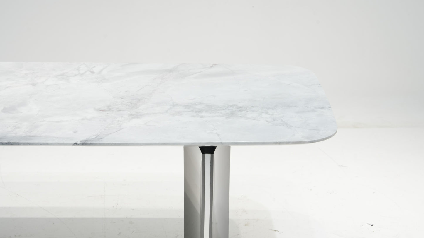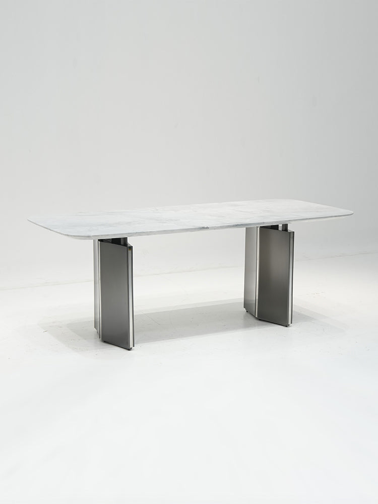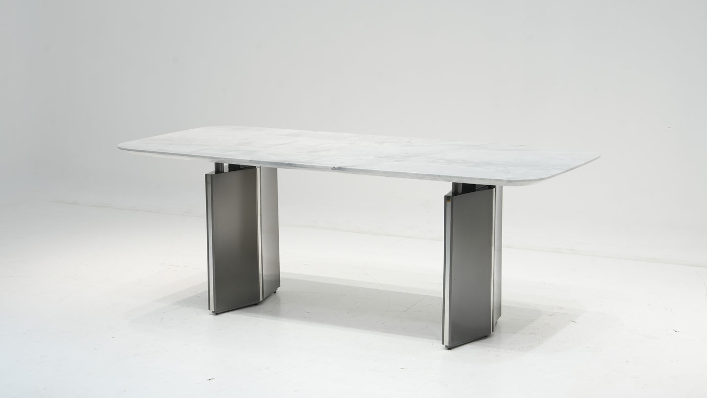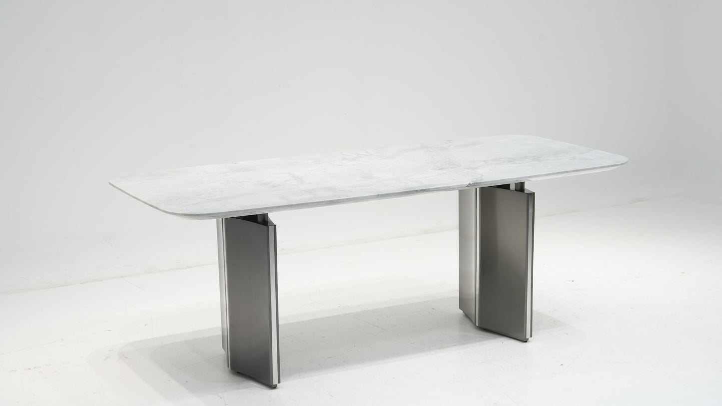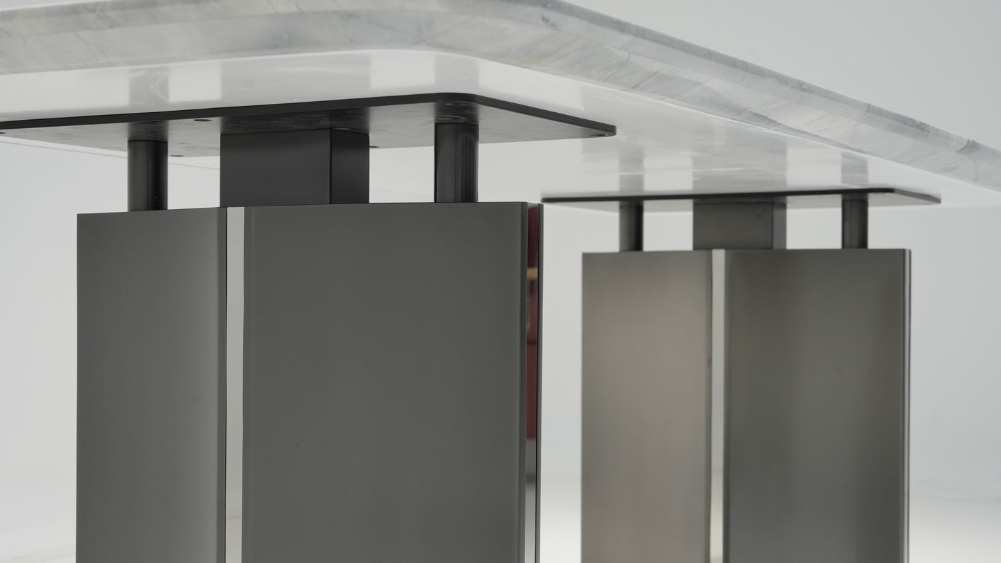 Morgan is based on the traditional refectory table, reinterpreted in a more contemporary key through a series of sophisticated design solutions and the pairing of striking luxury materials. The supports are made of bronze metal sheet and feature a tapered diamond-shaped section that lends vigor to the base, while the top, available in Tobacco stained flamed oak, Moka lacquered flamed oak, matt ebony and glossy lacquer finish in the following colors: Sand, Caramel and Granite is also characterized by a distinctive flared edge. Morgan is available in a number of sizes and is designed to accommodate custom-sized tops as well. In addition to the rectangular version, it is also available with a round top, held in place by three supports in bronze metal sheet. |