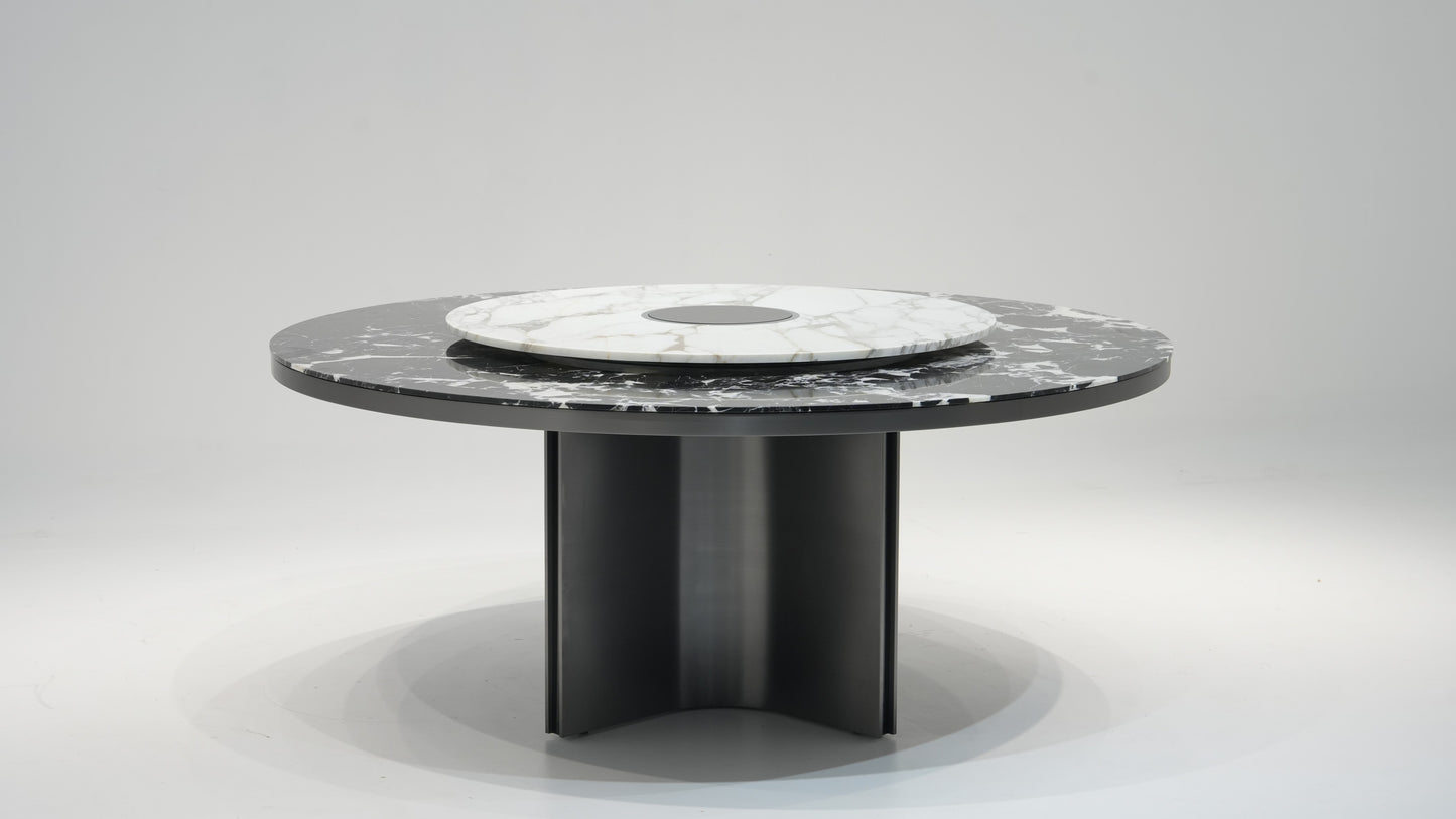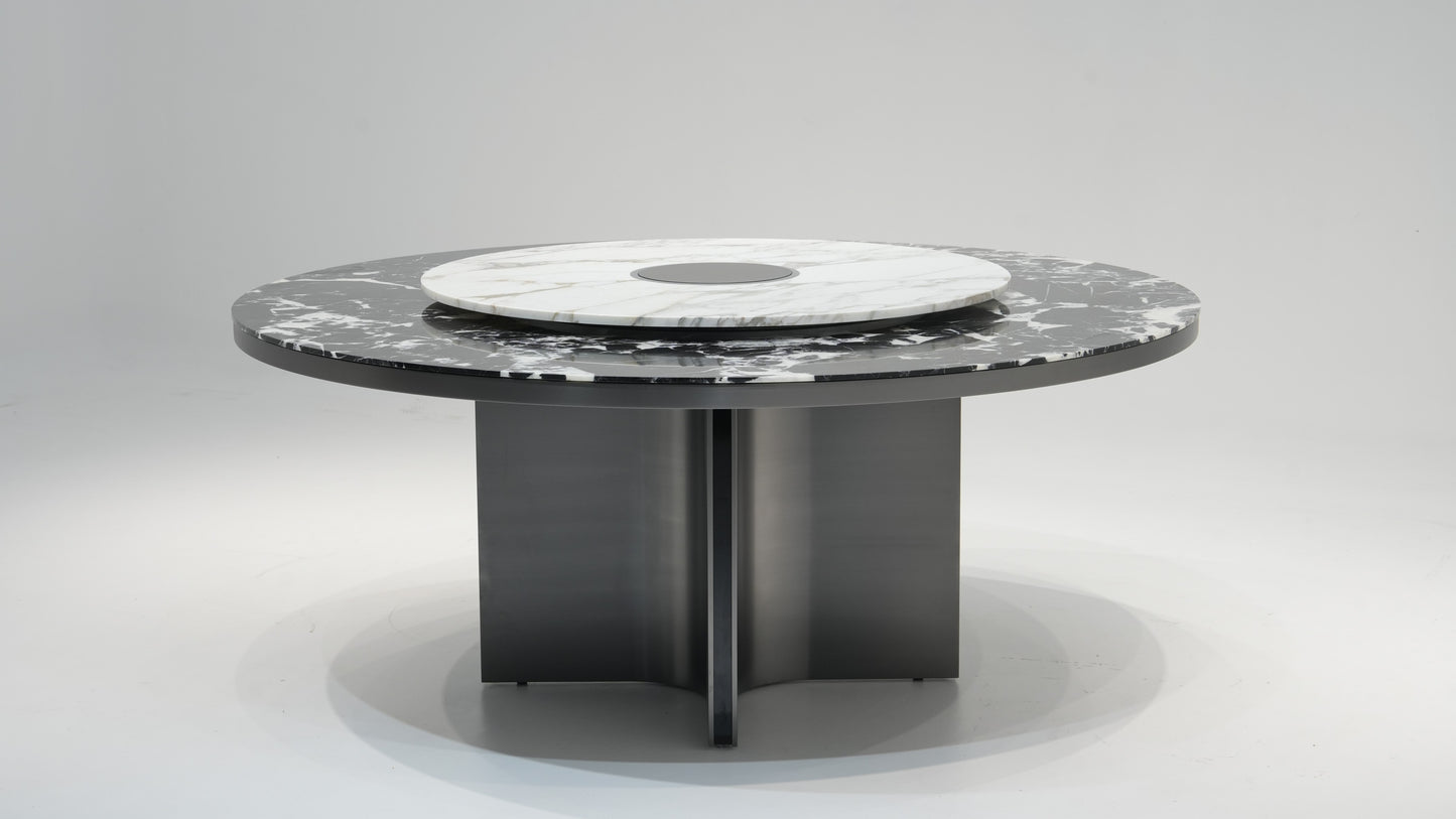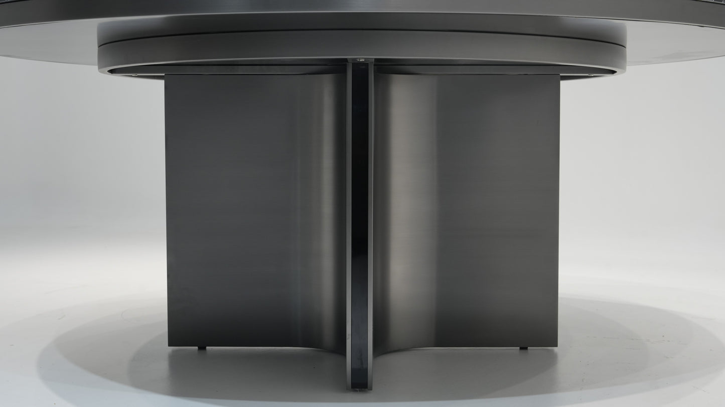 With its bold, sculptural-shaped base, which draws a series of quarter circles, illuminated by the glints of the metal, and interspersed with a black insert, the Marvin table makes an impressive impact and is characterised by great versatility. It is part of a wide variety of dining tables with a clearly architectural inspiration, featuring bases in satin finish stainless steel or in Pewter-coloured varnished metal.