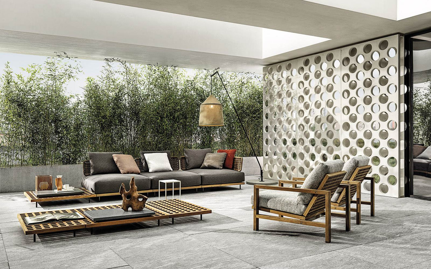 description | The wooden bases welcome comfortable padded cushions with backrests in a special fibre woven with wicker-effect, available in Mud colour or plain Liquorice colour. The sitting elements are interspersed with wooden surfaces that feature trays or candle holders, that can be arranged as desired with a surprising interlocking effect. A circular armchair joins this outdoor landscape characterized by its broad compositional freedom. |