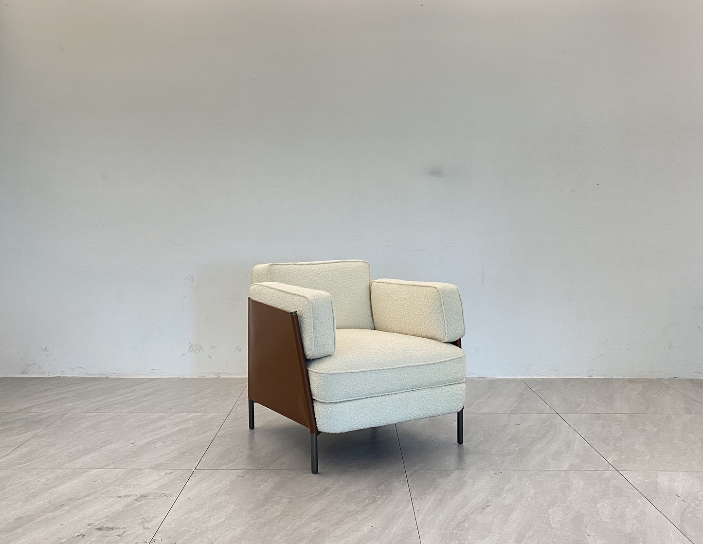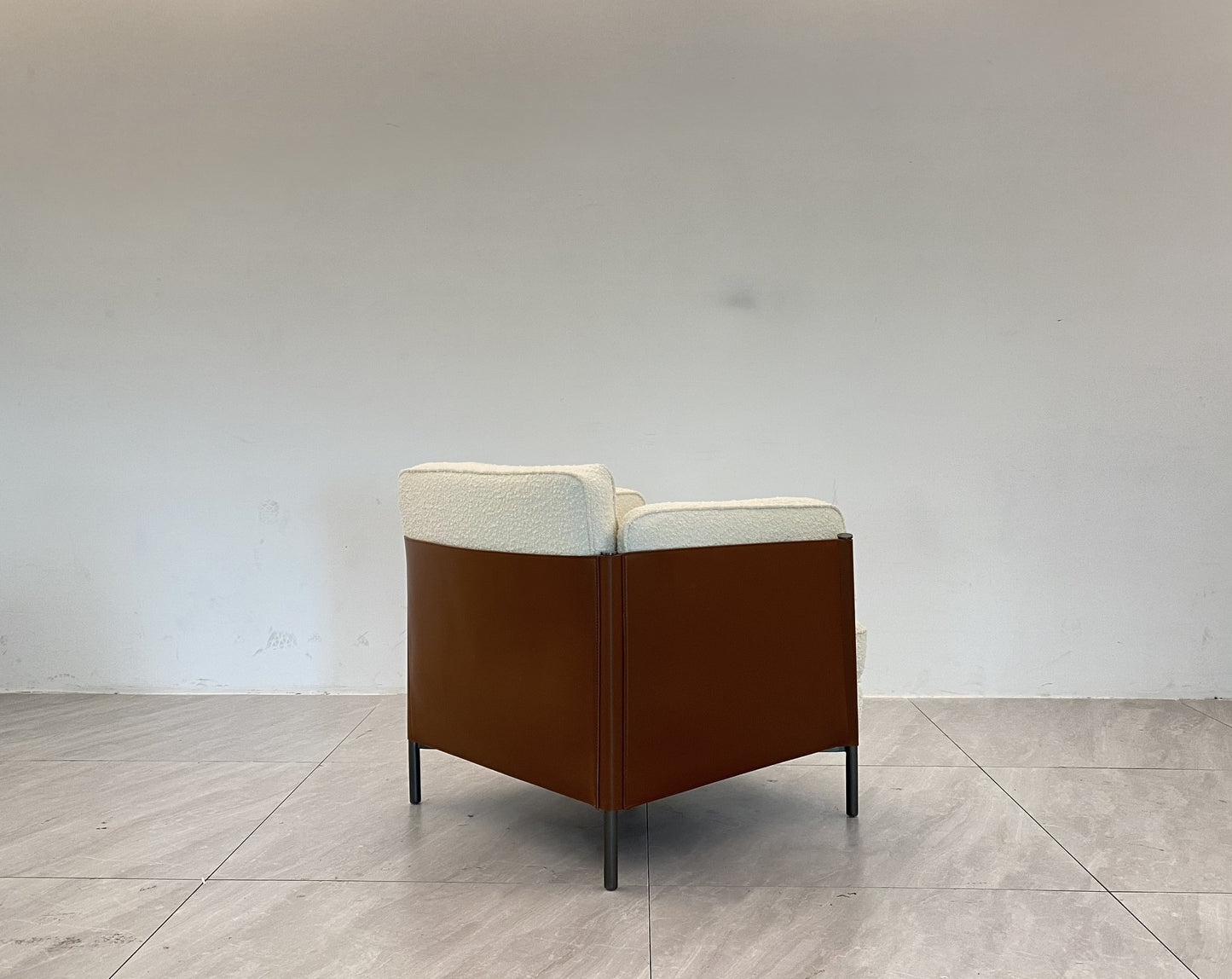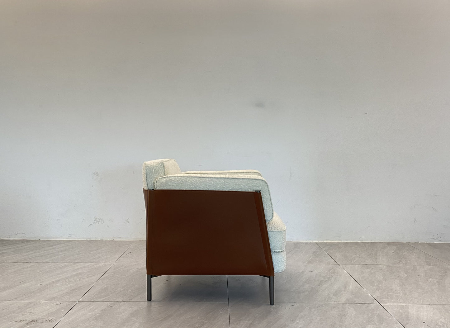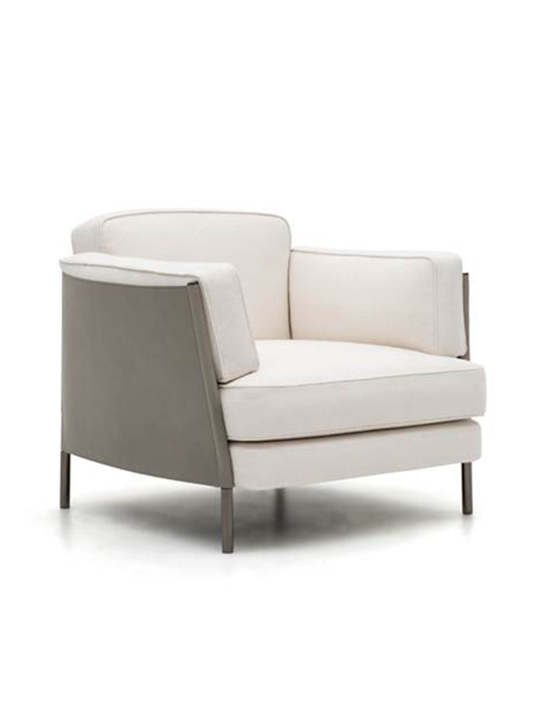 description | Distinguished by its elegant formal cubist shape, Shelley sports a linear geometry, enhanced by the presence of saddle hide and its accurate processing technique. Its characteristic alluring saddle hide volume hosts cushions covered in fabric and opens at the front on the sides to reveal the inviting seat, while the rear part accommodates the body in a soft embrace. The saddle hide also serves to bind the legs together, wrapping itself round them and allowing the top part to emerge, ending in a fine decorative detail with Black Nickel finish. |