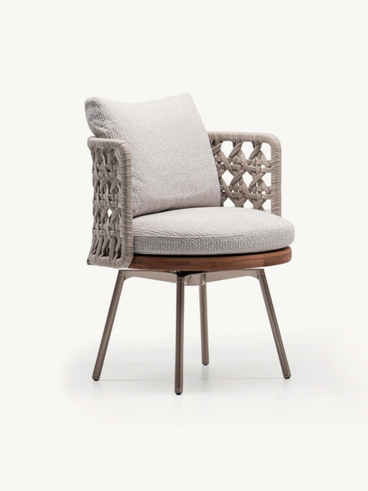 description | The varnished tubular stainless steel frame of the backrest is covered in woven cord in the shades Ecru and Dark Brown, sporting a design inspired by Vienna straw, but with a larger mesh. It sits on a base in natural teak or Dark Brown stained mahogany, supported by aluminium legs with a polished, Bronze-coloured, anti-touch finish. With its backrest in the shape of a perfect circle, and a sophisticated visual lightness that embraces the padded seat, Torii Nest Outdoor was conceived to meet various requirements, in terms of both functionality and ergonomics. |