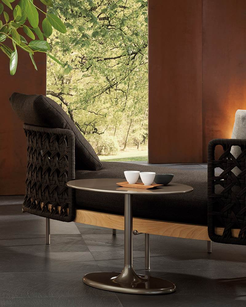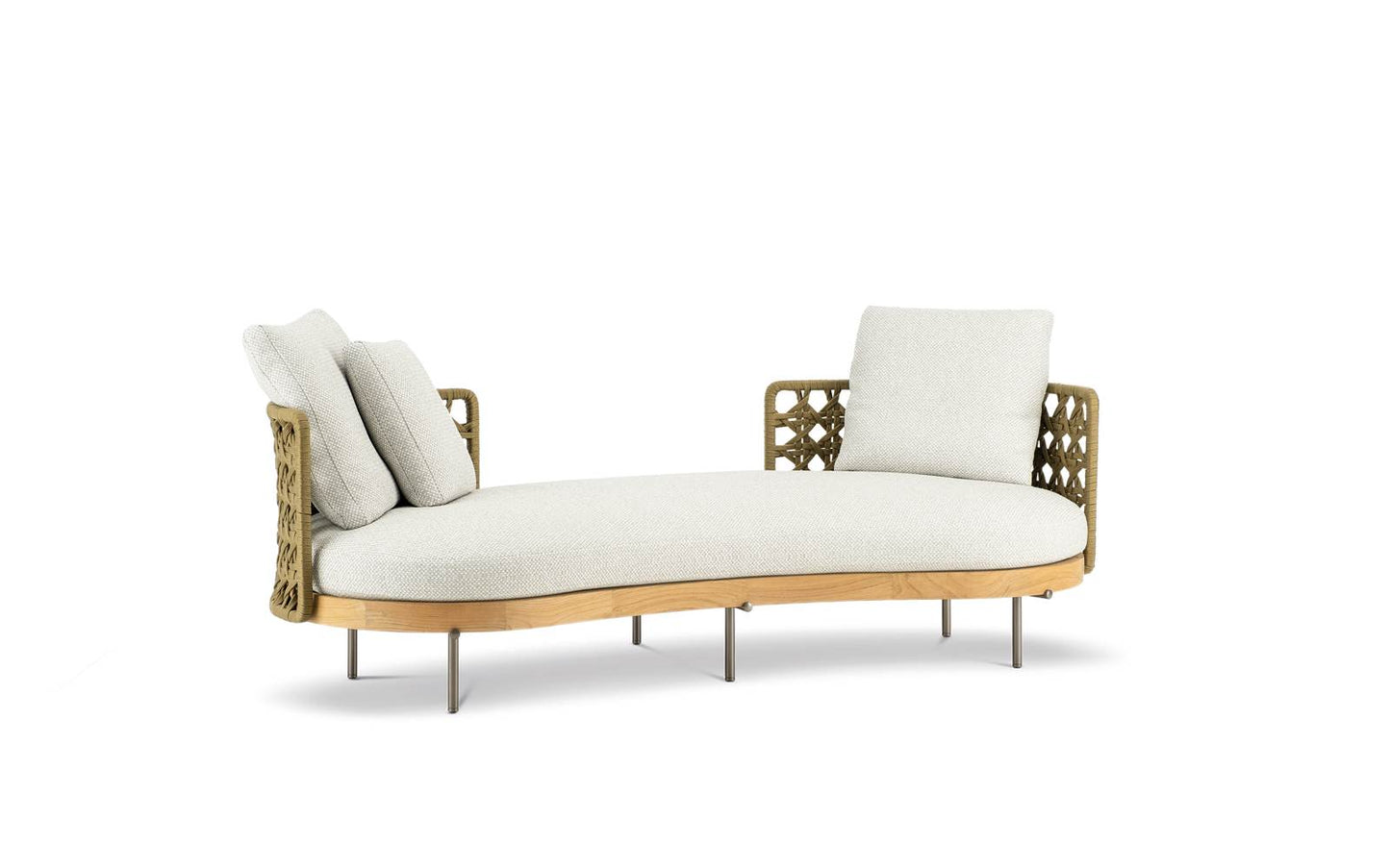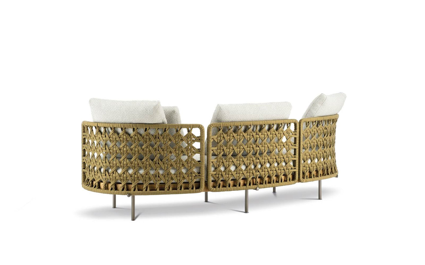 description | Designed for indoor environments in 2020, Torii Nest migrates to open-air living spaces, bringing to life an entire family of seats. With structural details linked to Japanese tradition, the chairs and sofas play with round edged volumes, thin profiles and the apparent formal simplicity of an extremely intricate design. The painted tubular steel frame of the woven cord backrest in the shades Ecru, Dark Brown and Oil Green sports a design inspired by cane, but with a larger mesh that lets light and air through. It sits on a base in natural teak or Dark Brown mahogany, supported by painted aluminium legs with a shiny, Bronze-coloured, anti-touch finish. |
