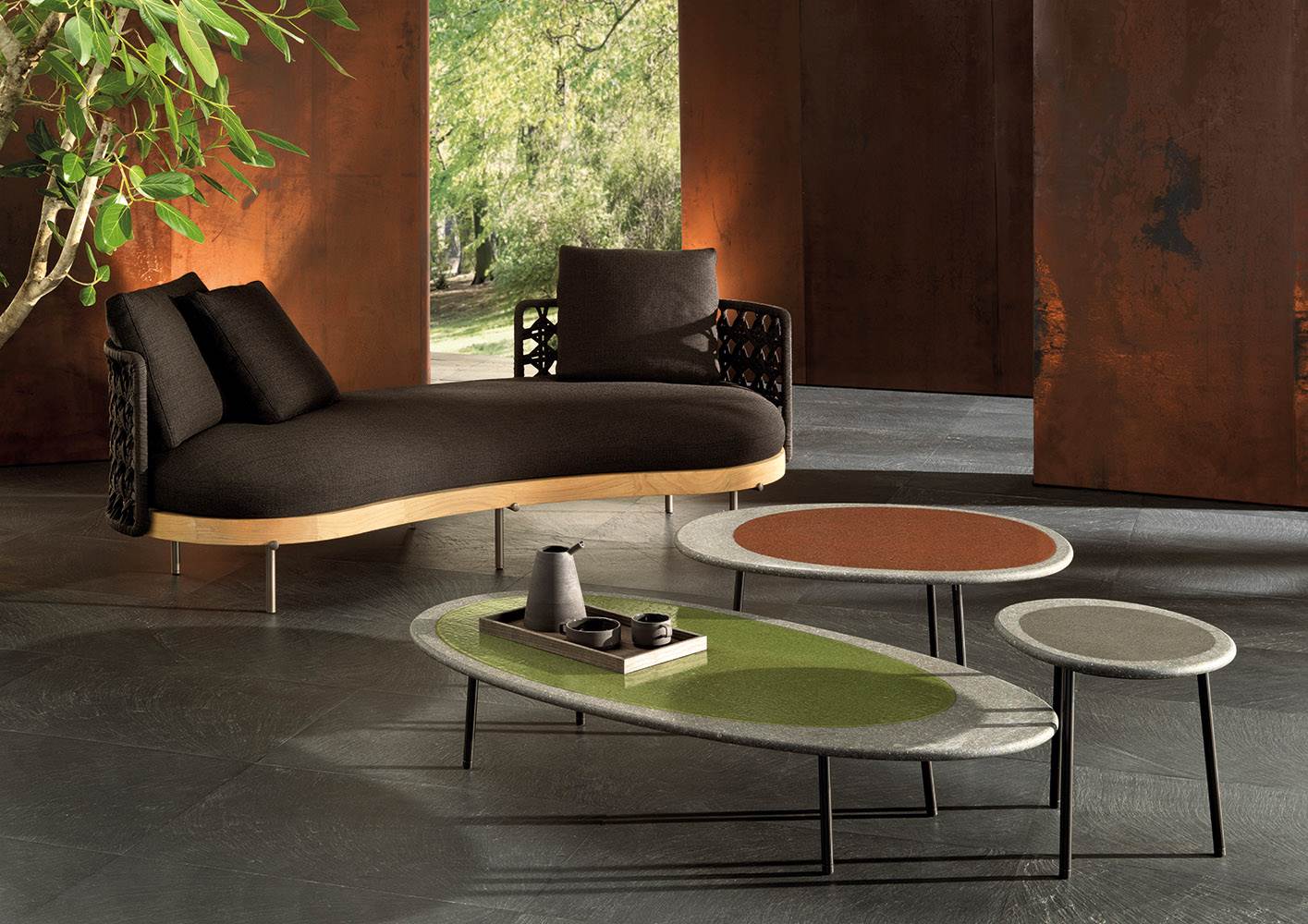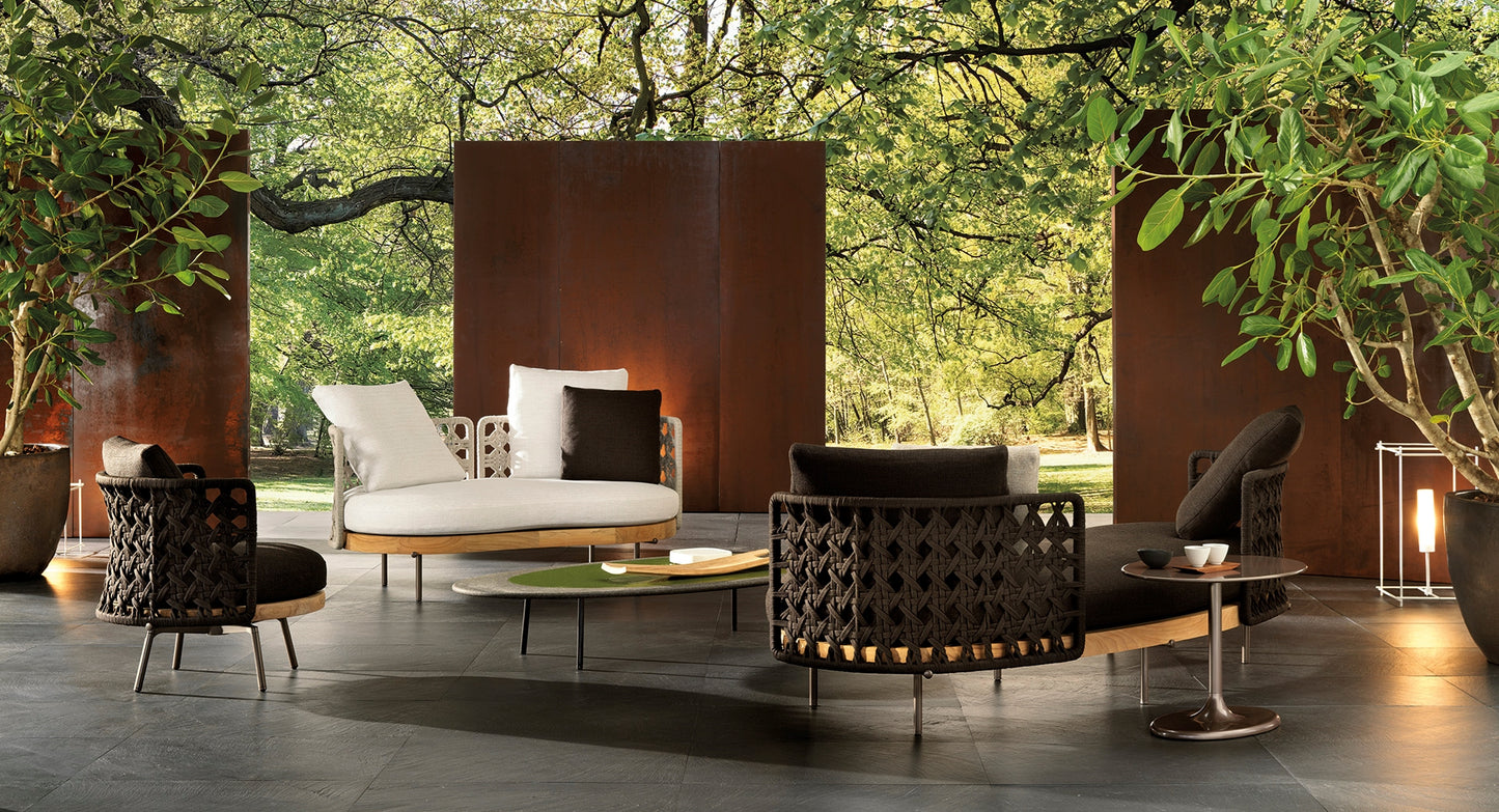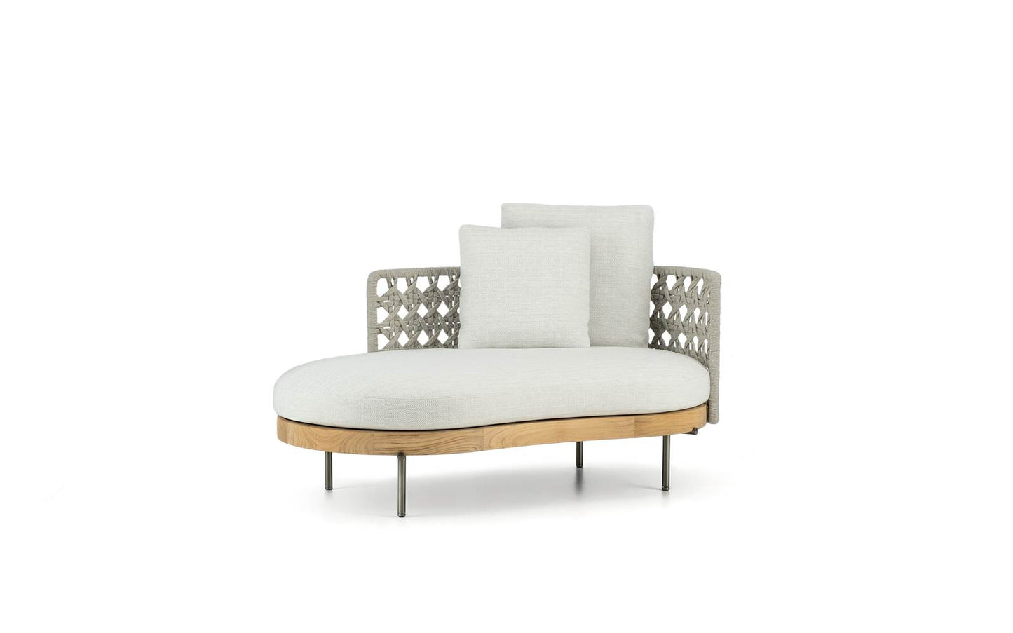 description | Designed for indoor environments in 2020, Torii Nest migrates to open-air living spaces, bringing to life an entire family of seats. With structural details linked to Japanese tradition, the chairs and sofas play with round edged volumes, thin profiles and the apparent formal simplicity of an extremely intricate design. The painted tubular steel frame of the woven cord backrest in the shades Ecru, Dark Brown and Oil Green sports a design inspired by cane, but with a larger mesh that lets light and air through. It sits on a base in natural teak or Dark Brown mahogany, supported by painted aluminium legs with a shiny, Bronze-coloured, anti-touch finish. |