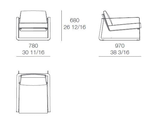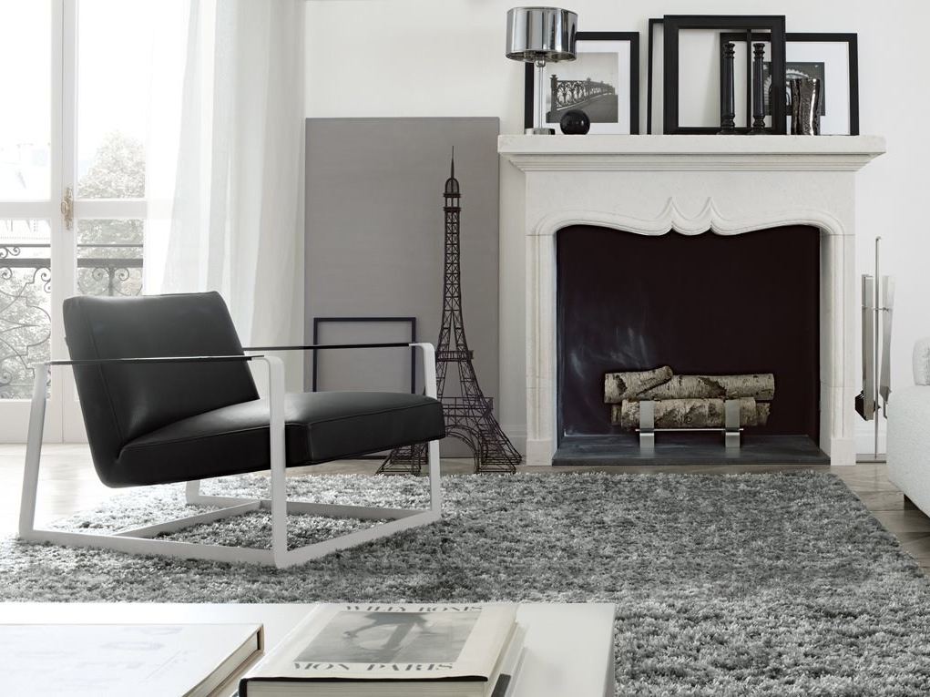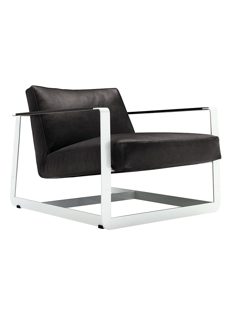 description | Structure in glossy white and black varnished metal with seat and back cushions in foamed polyurethane of different densities and feather. Pre-covering: in cotton cloth and polyester padding. Final covering removable in fabric and non-removable in leather and eco-leather. Arms in leather; in the version with fabric cushions arms in leather in the same colour of the white or black metal structure. Armrest covering: same colour of the coverings in leather and eco-leather, same colour of the metal structure in the version with fabric covering. |